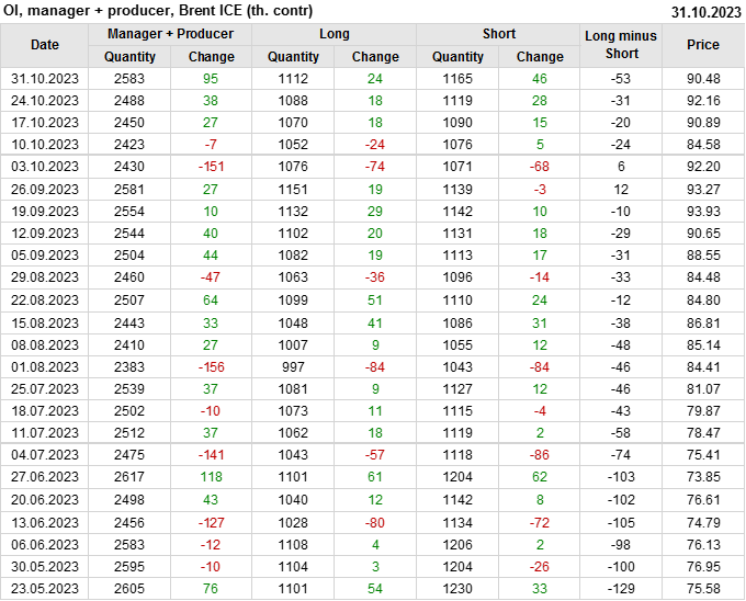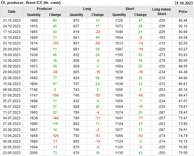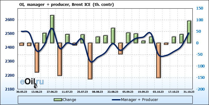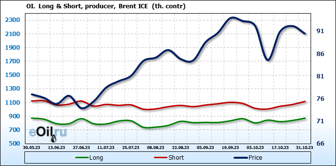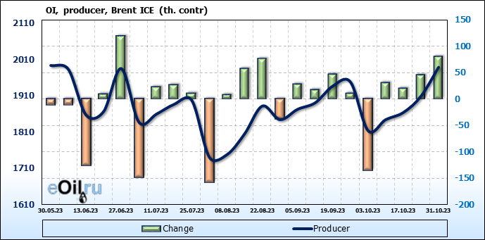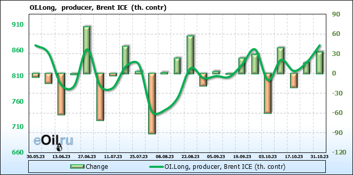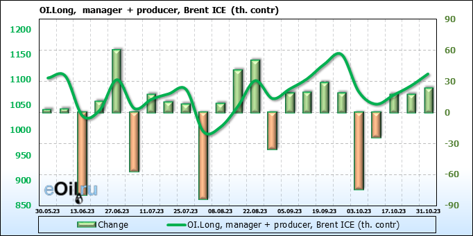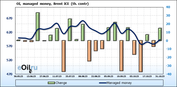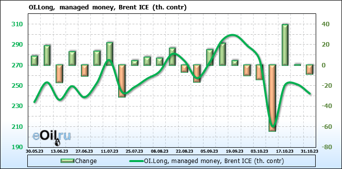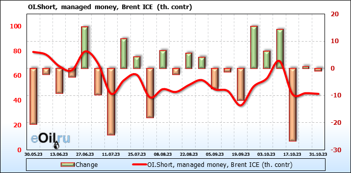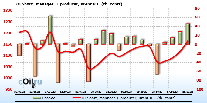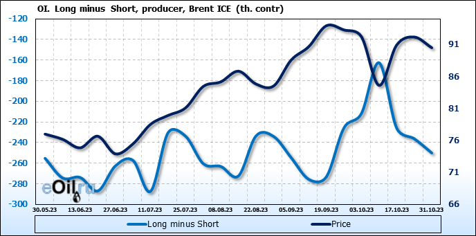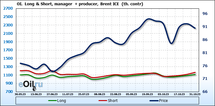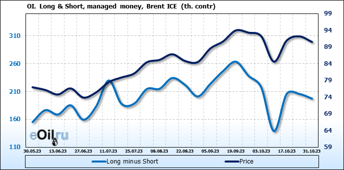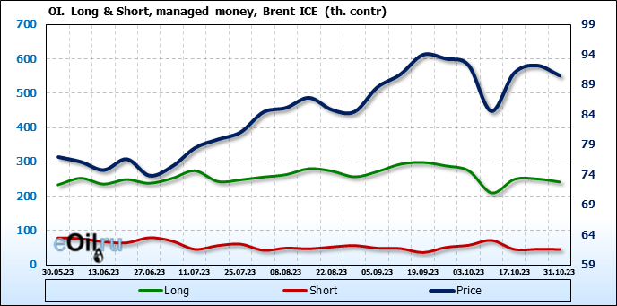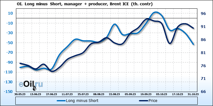 За прошедшую неделю, 25.10.23 — 31.10.23, разница между длинными и короткими позициями управляющих сократилась на 8.4 тыс. контрактов. В тоже время, цена упала на 1.68 доллара.