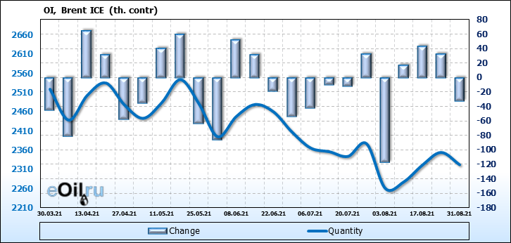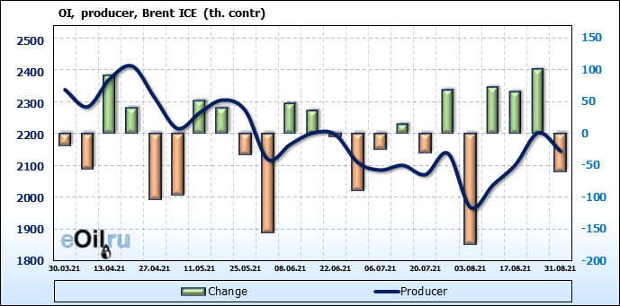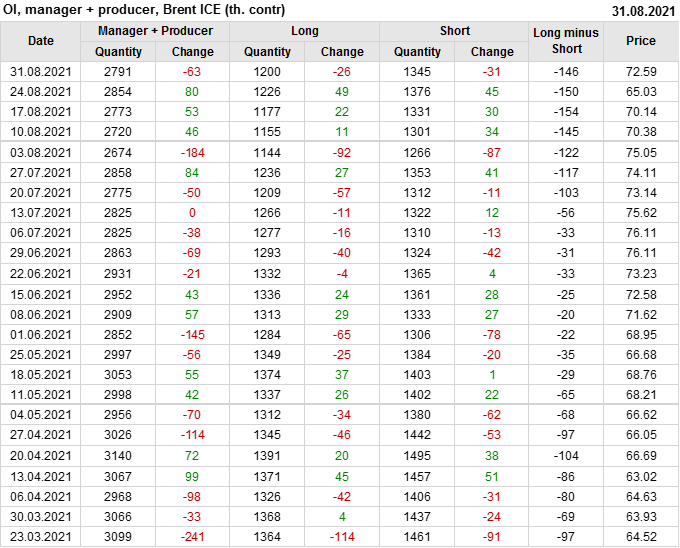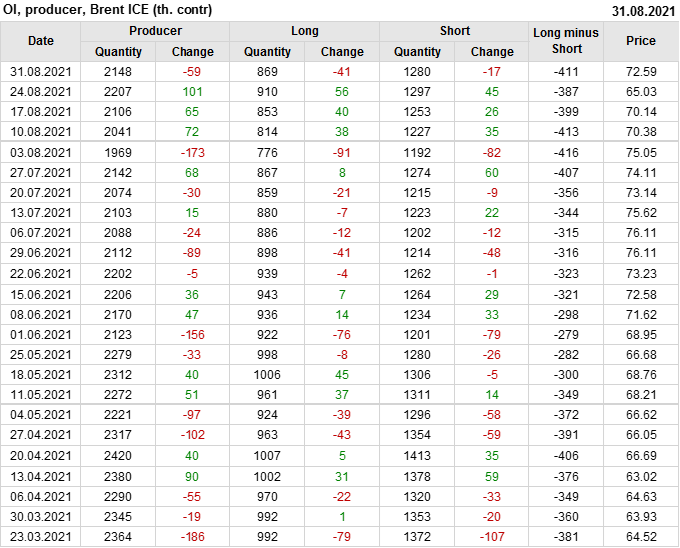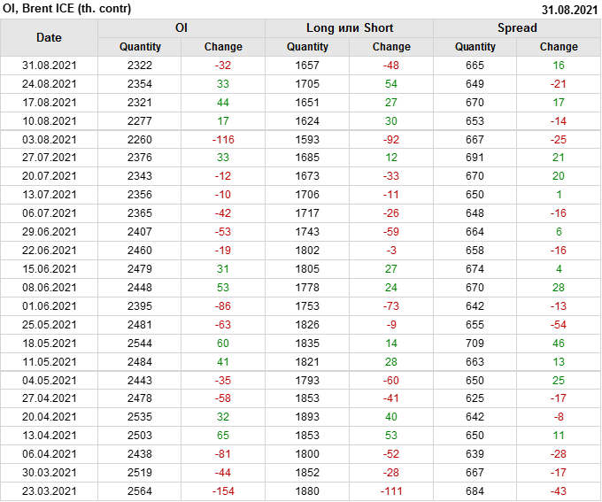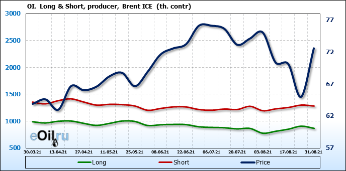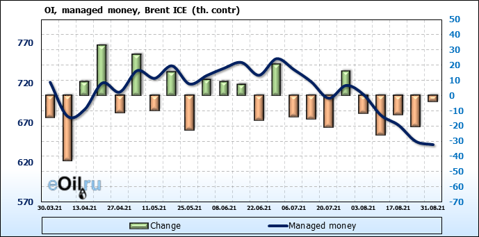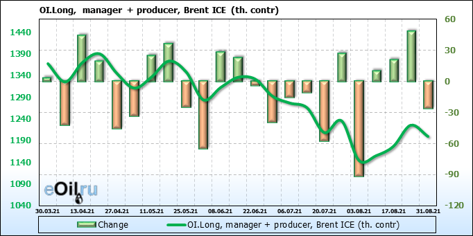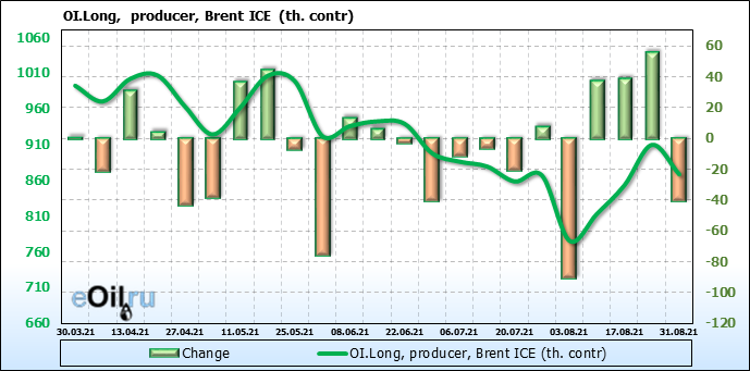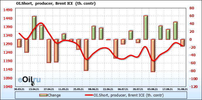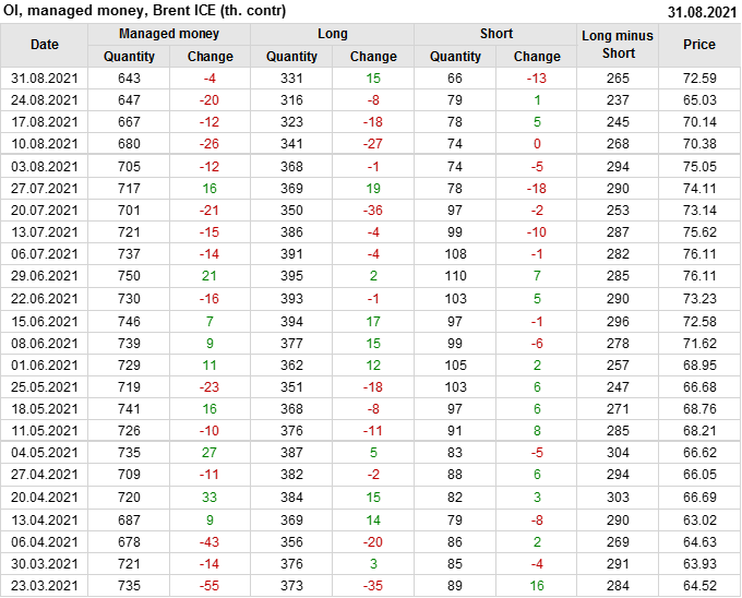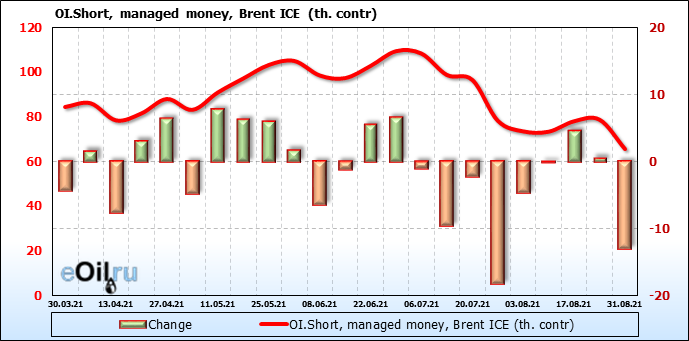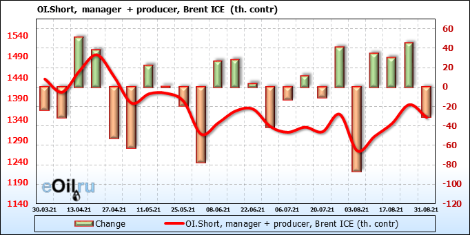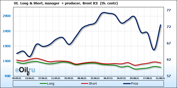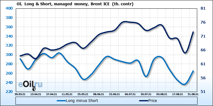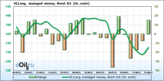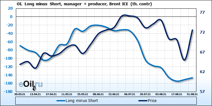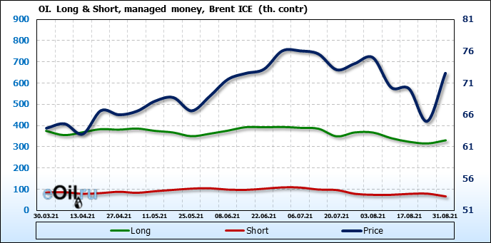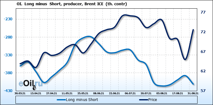 За прошедшую неделю, 25.08.21 — 31.08.21, разница между длинными и короткими позициями управляющих увеличилась на 28.3 тыс. контрактов. В тоже время, цена выросла на 7.56 доллара.