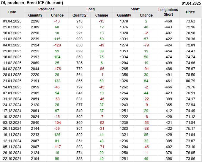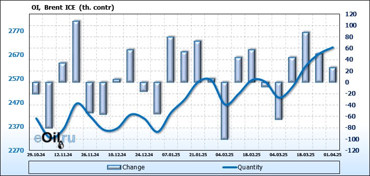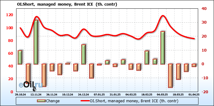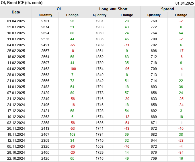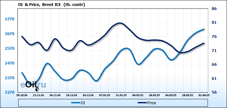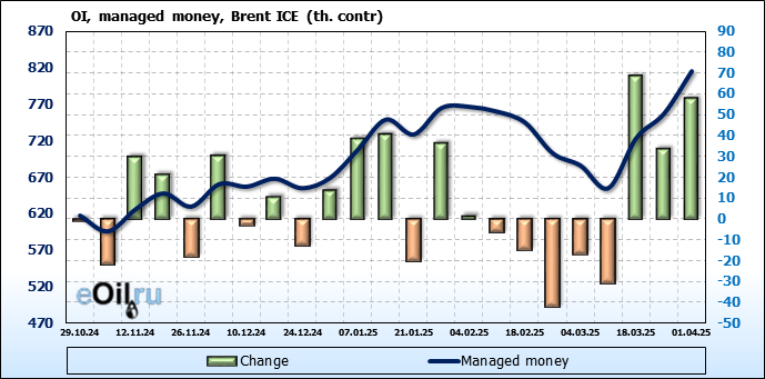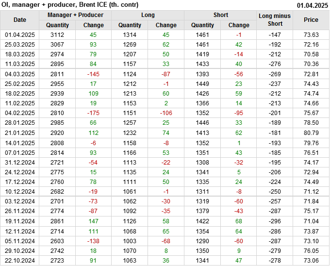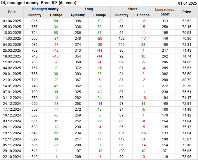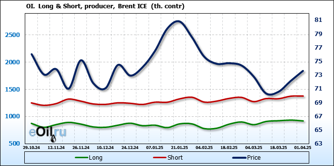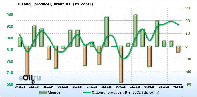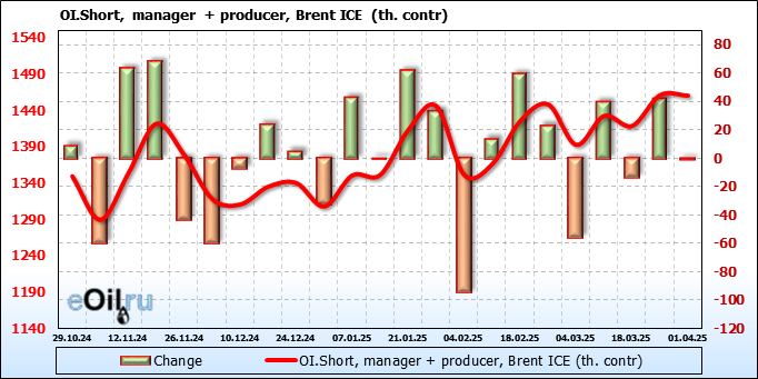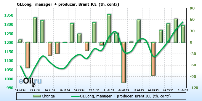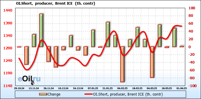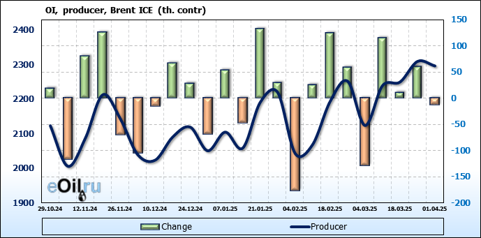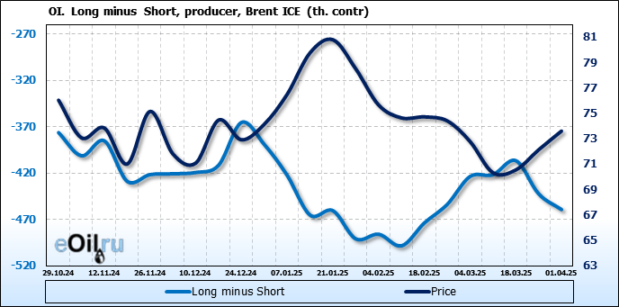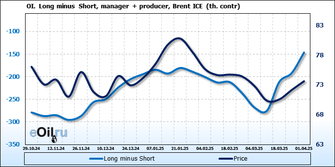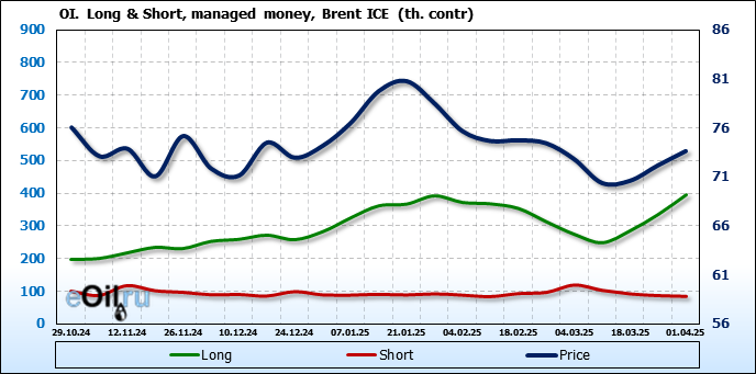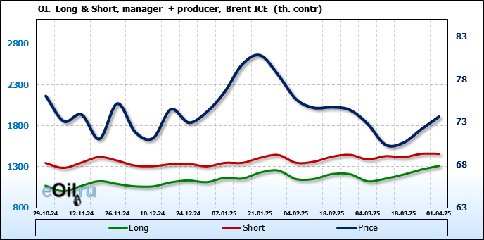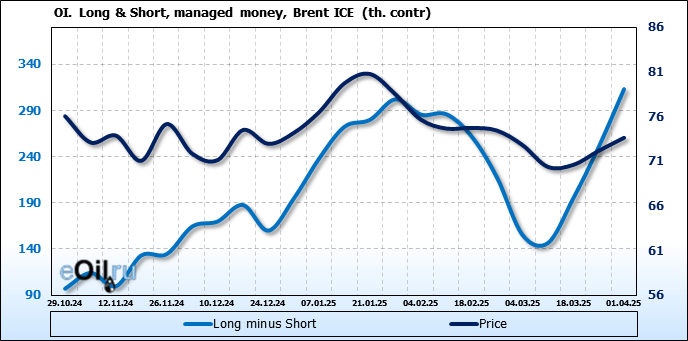 За прошедшую неделю, 26.03.25 — 01.04.25, разница между длинными и короткими позициями управляющих увеличилась на 62.5 тыс. контрактов. В тоже время, цена выросла на 1.47 доллара.