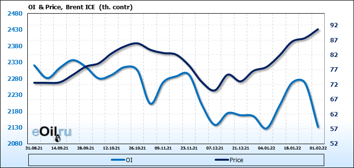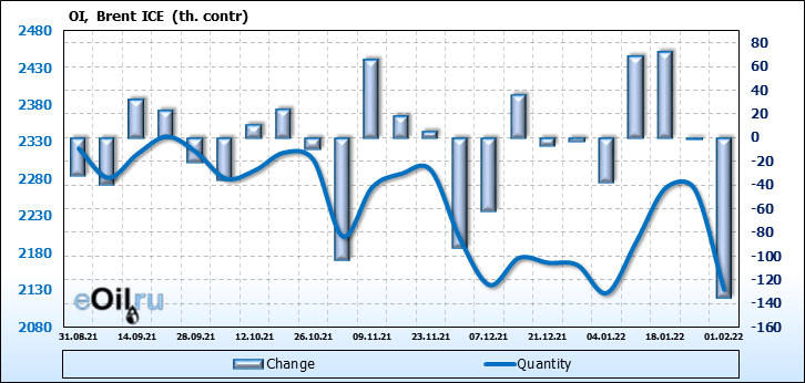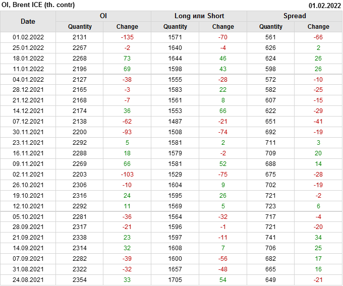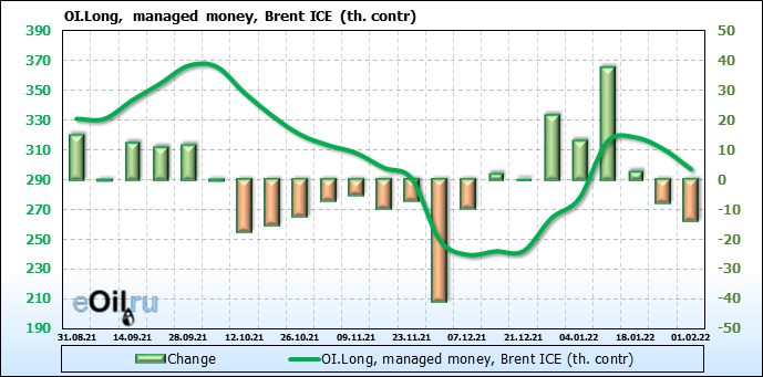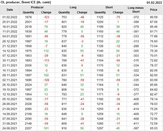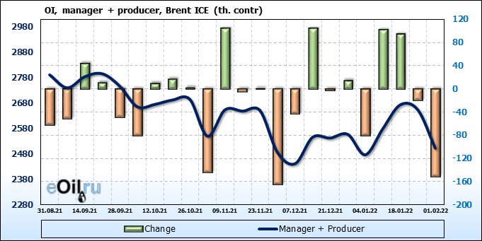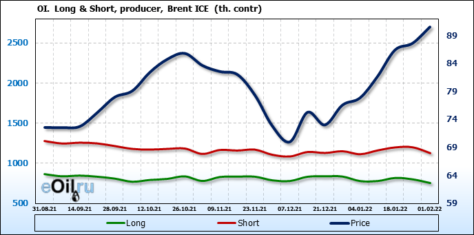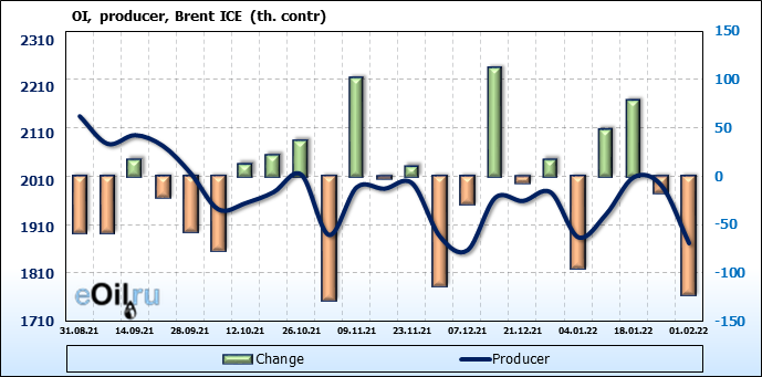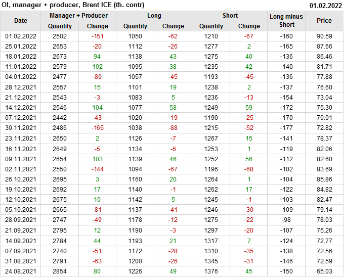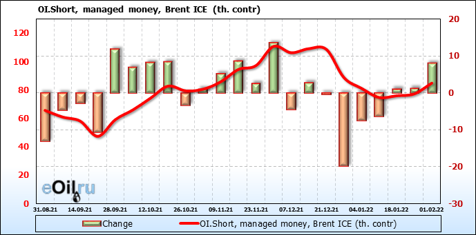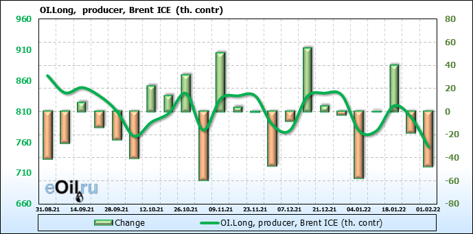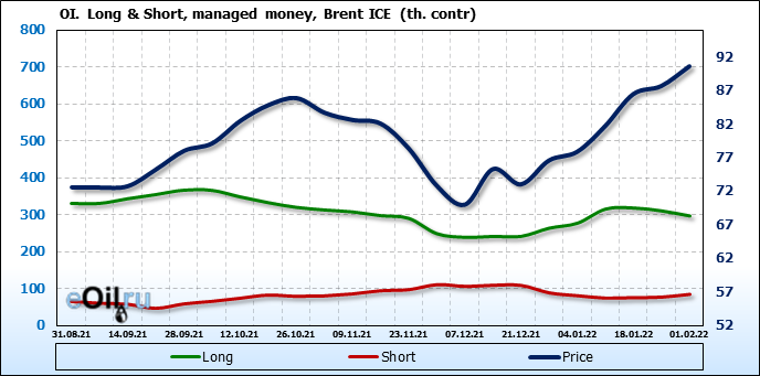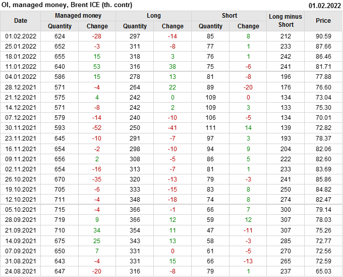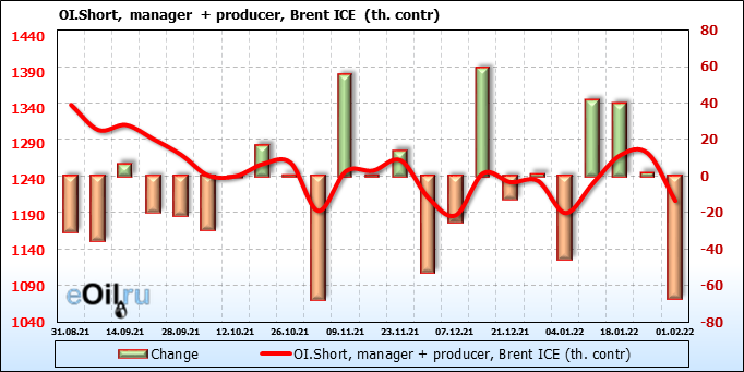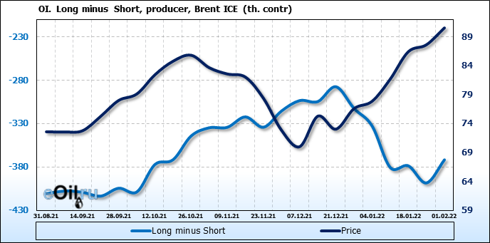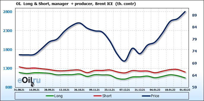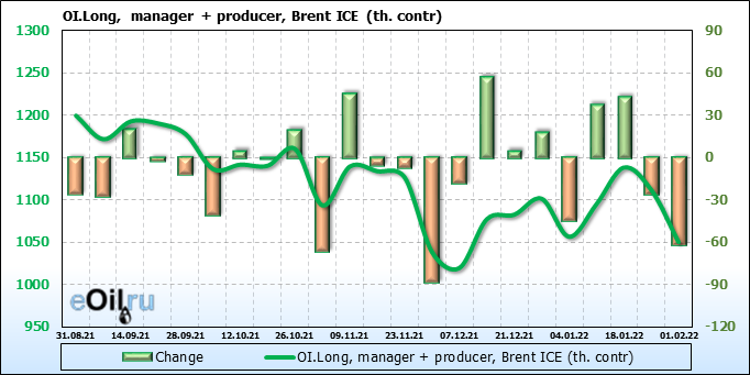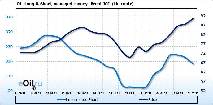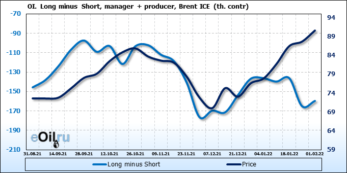За прошедшую неделю, 26.01.22 — 01.02.22, разница между длинными и короткими позициями управляющих сократилась на 21.2 тыс. контрактов. В тоже время, цена выросла на 2.93 доллара.