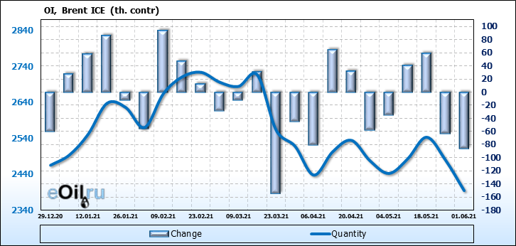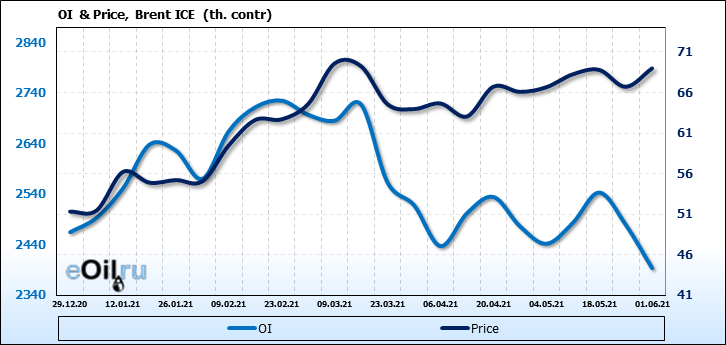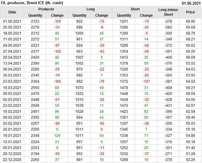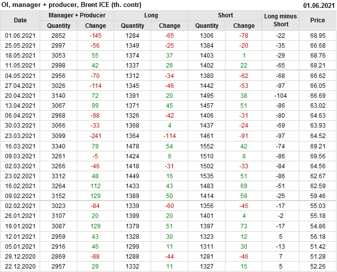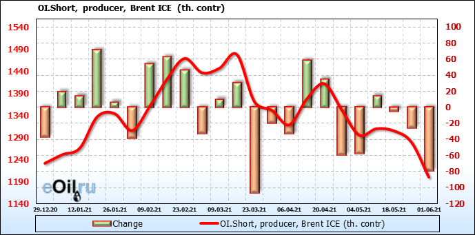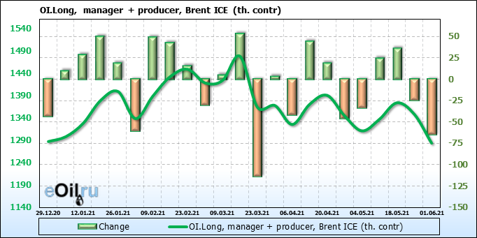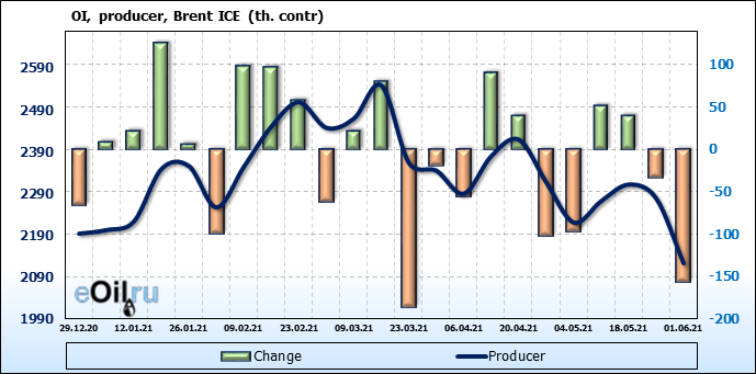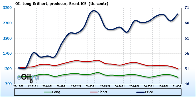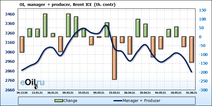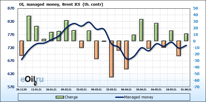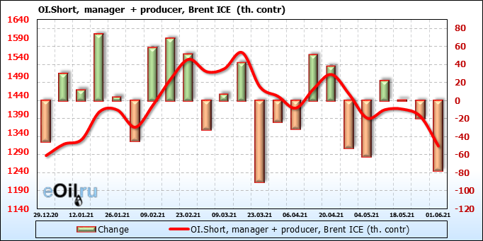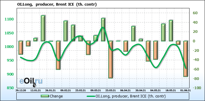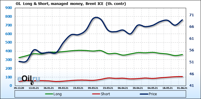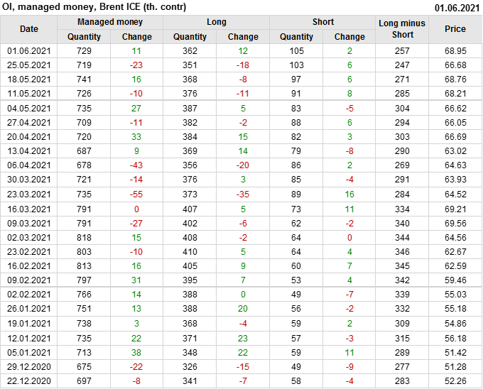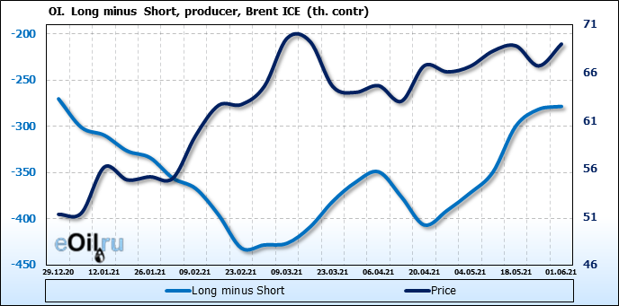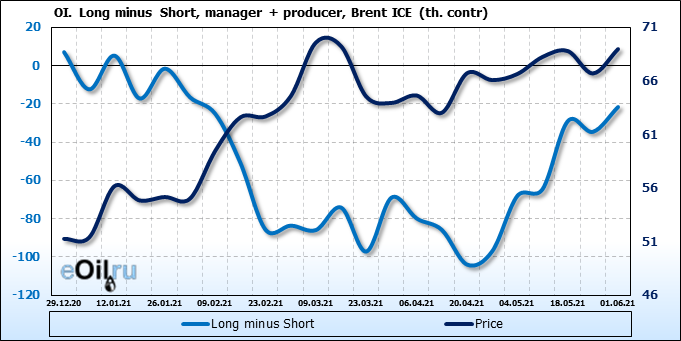 За прошедшую неделю, 26.05.21 — 01.06.21, разница между длинными и короткими позициями управляющих увеличилась на 9.8 тыс. контрактов. В тоже время, цена выросла на 2.27 доллара.