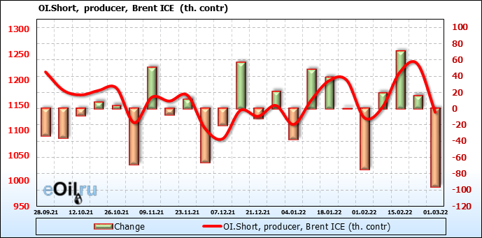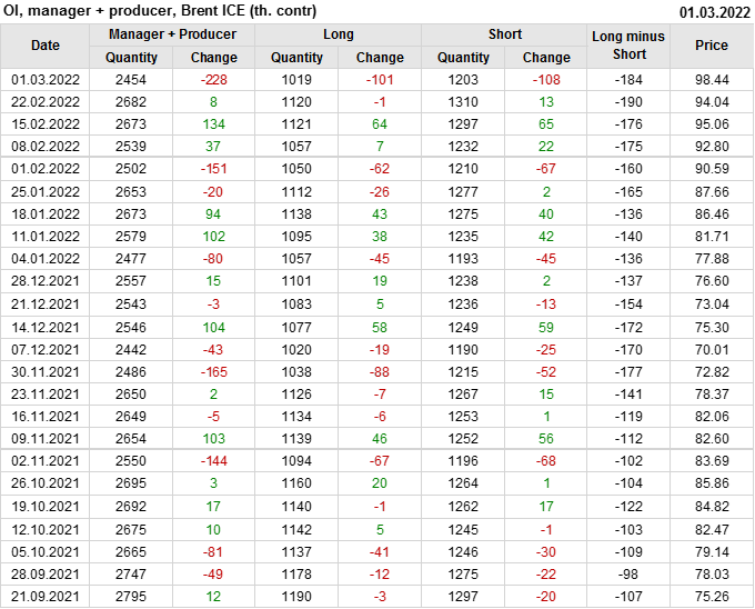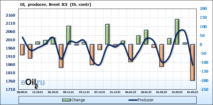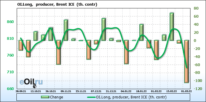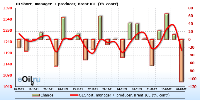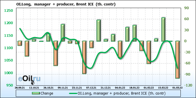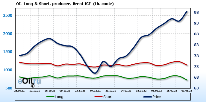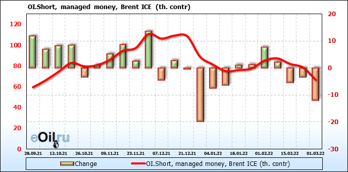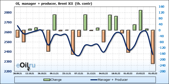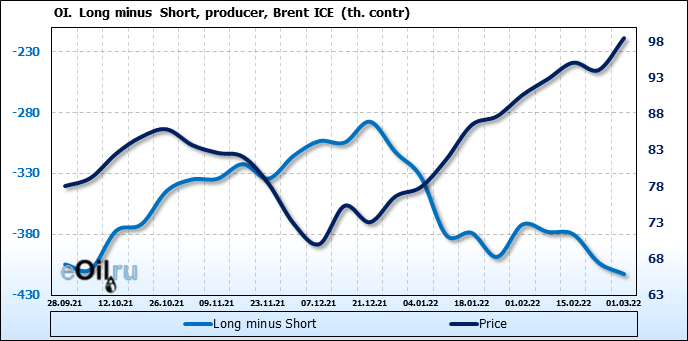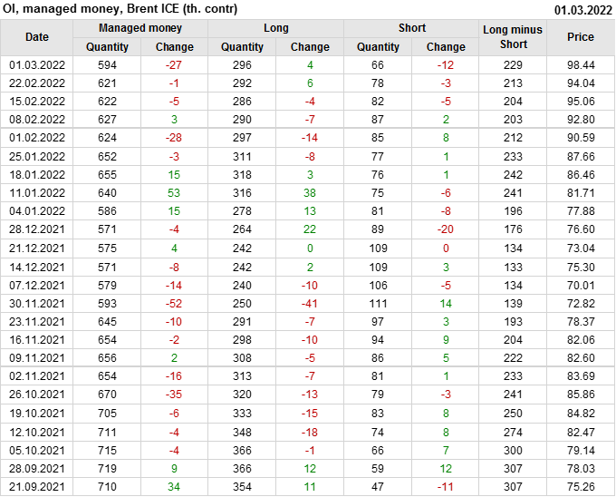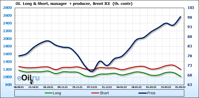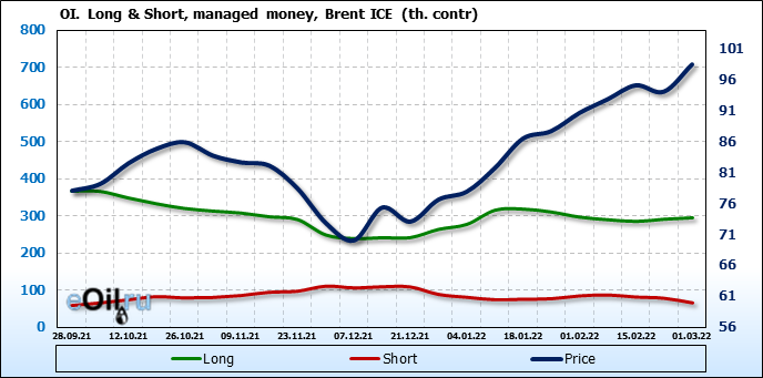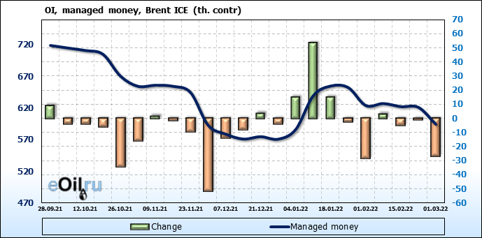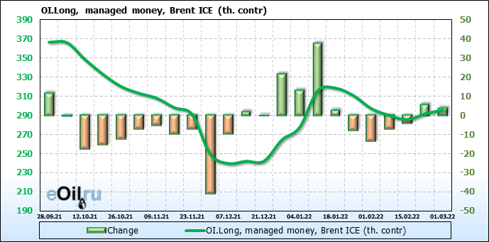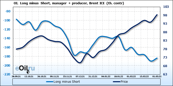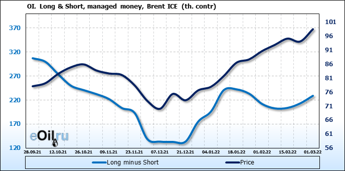 За прошедшую неделю, 23.02.22 — 01.03.22, разница между длинными и короткими позициями управляющих увеличилась на 15.9 тыс. контрактов. В тоже время, цена выросла на 4.4 доллара.