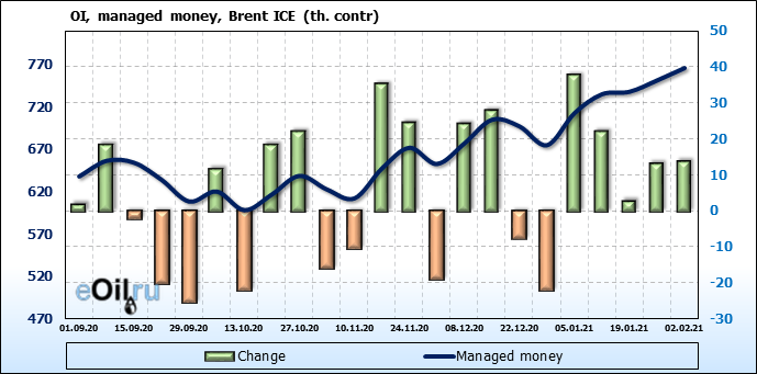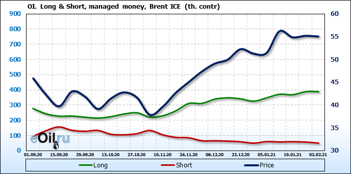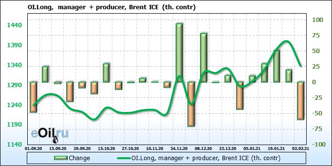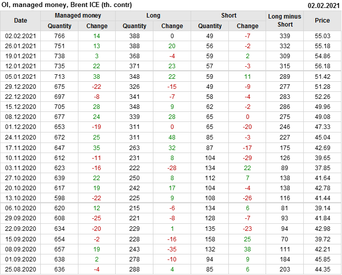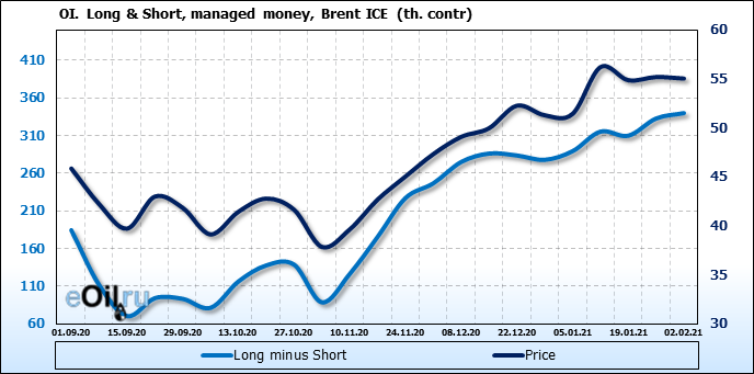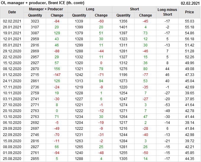 За прошлую неделю, 27.01.21 — 02.02.21, разница между длинными и короткими позициями управляющих выросла на 7 тыс. контрактов. В тоже время, цена упала на 0.15 доллара. Управляющие наращивают длинные позиции, что отражает их видение возможностей роста цены в ближайшее время, и это несмотря на то, что цены на отчетной неделе падали. Если давление со стороны покупателей будет продолжено, рынок развернется вверх.