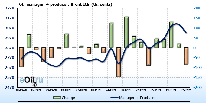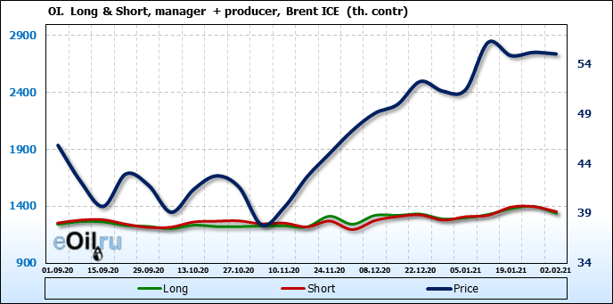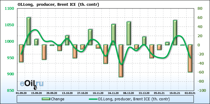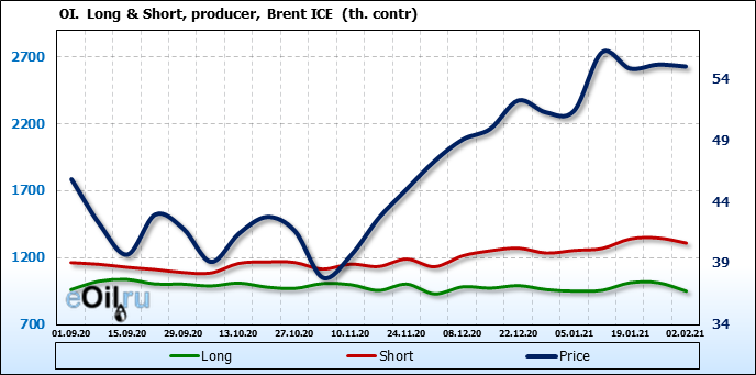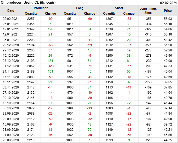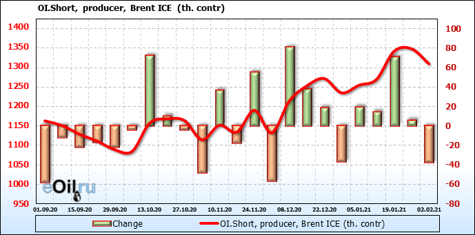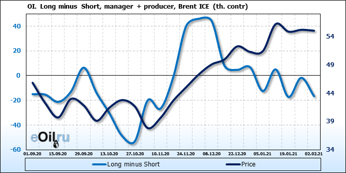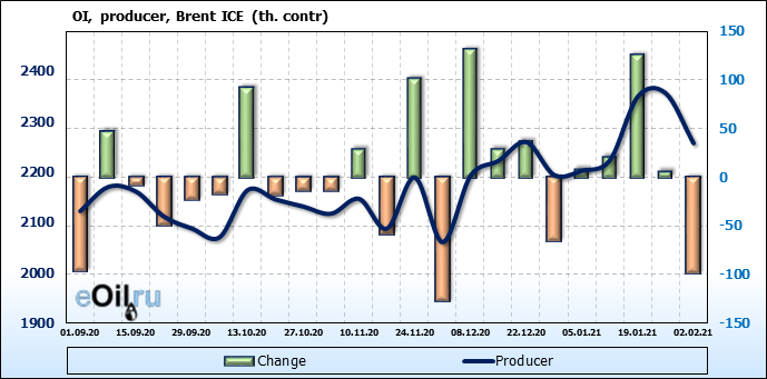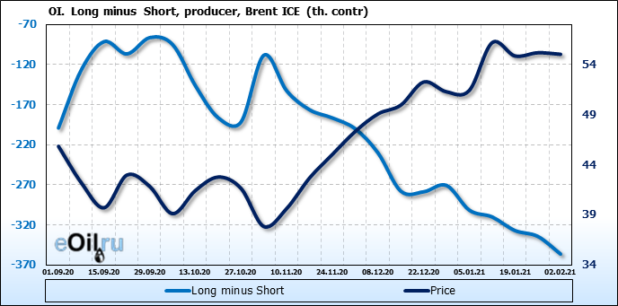 За прошлую неделю, 27.01.21 — 02.02.21, разница между длинными и короткими позициями производителей упала на 22 тыс. контрактов. В тоже время, цена упала на 0.15 доллара. Производители наращивают короткие позиции, что не дает цене расти. В такой ситуации на рынке возможно ускорение падения цен.