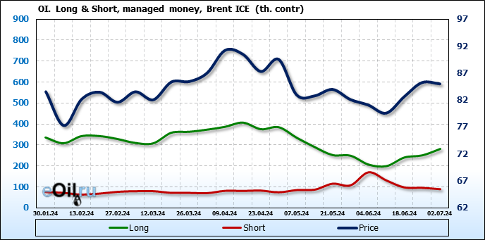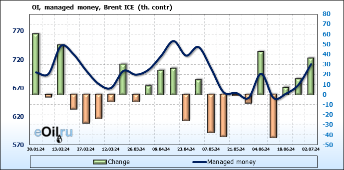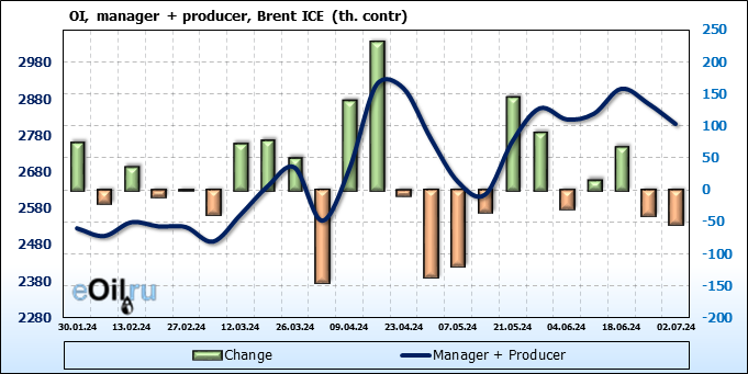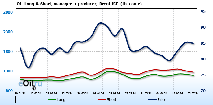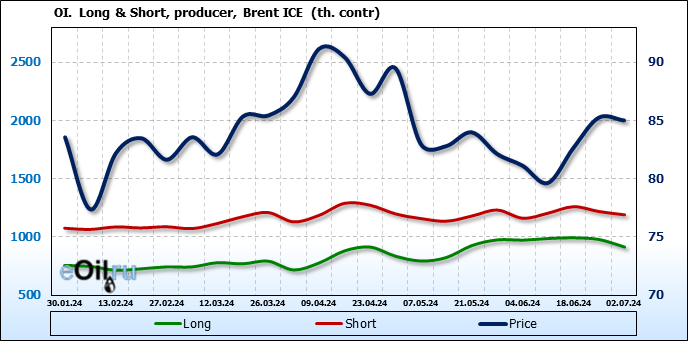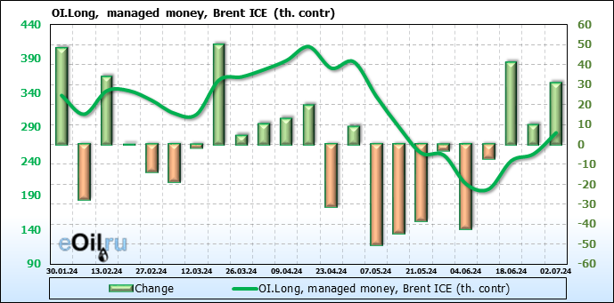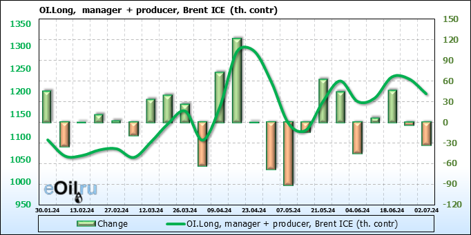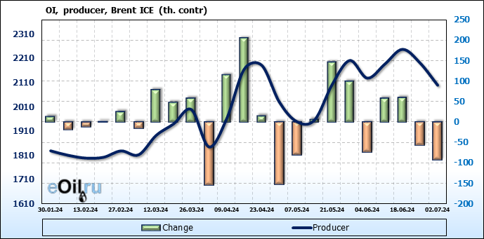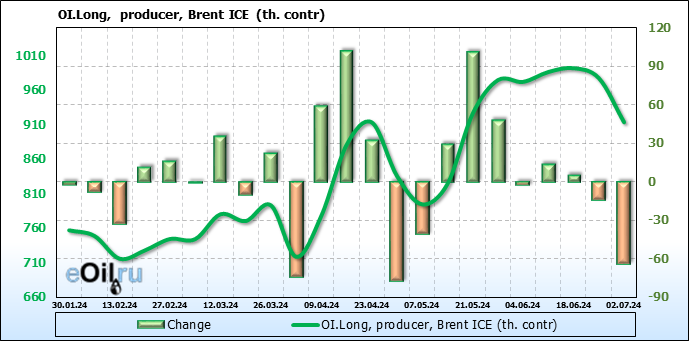 За прошедшую неделю, 26.06.24 — 02.07.24, разница между длинными и короткими позициями управляющих увеличилась на 37.3 тыс. контрактов. В тоже время, цена упала на 0.24 доллара.