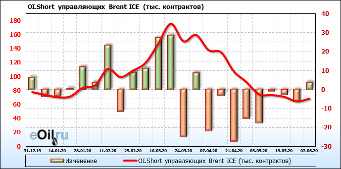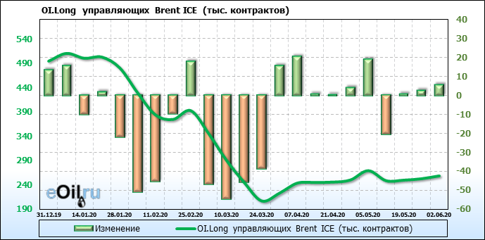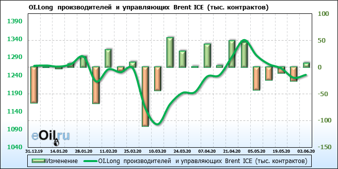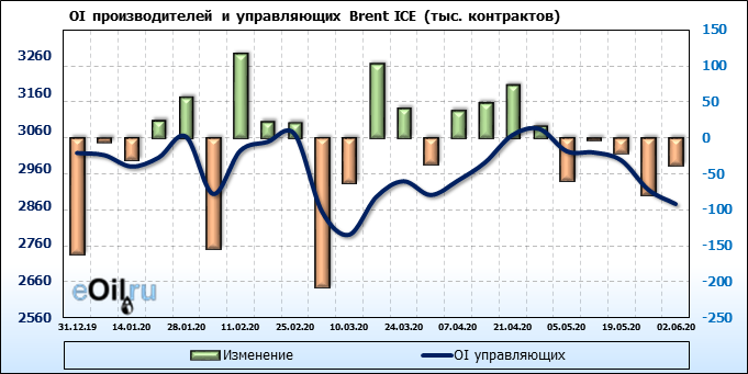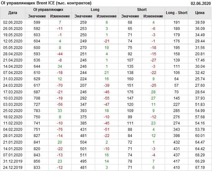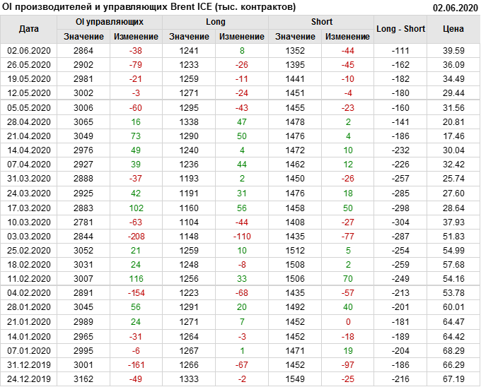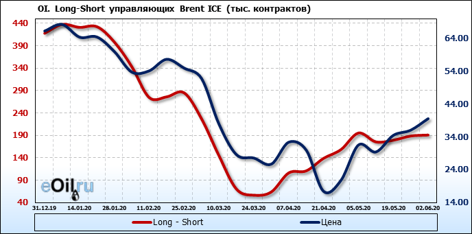 За прошлую неделю, 27.05.20 — 02.06.20, разница между длинными и короткими позициями управляющих выросла на 2 тыс. контрактов. В тоже время, цена выросла на 3.5 доллара. Управляющие наращивают позиции, разгоняя тем самым рост цен, что говорит нам о текущей силе рынка.