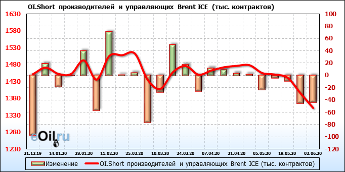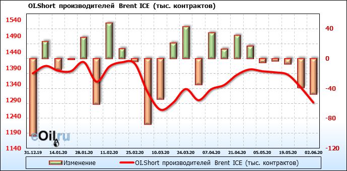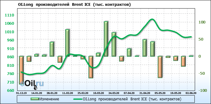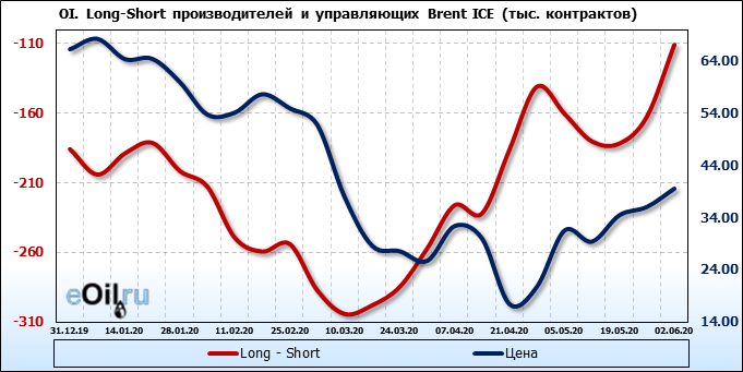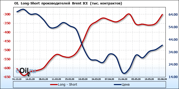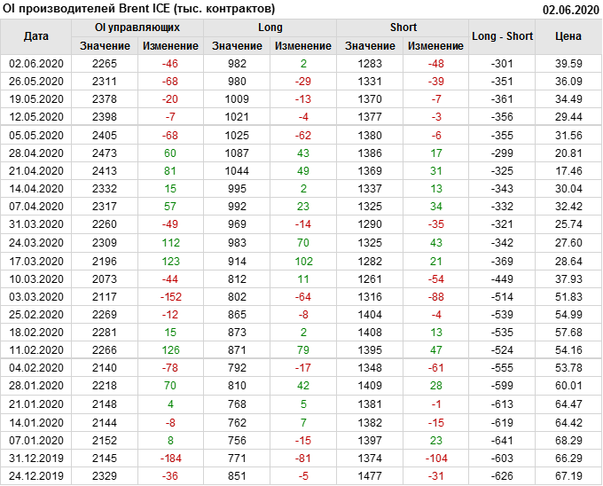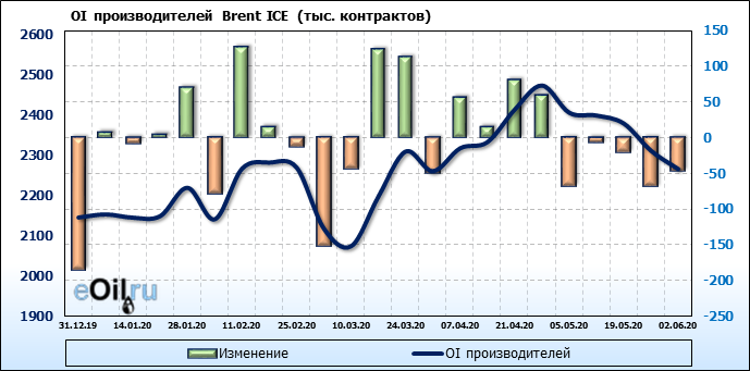 За прошлую неделю, 27.05.20 — 02.06.20, разница между длинными и короткими позициями производителей выросла на 50 тыс. контрактов. В тоже время, цена выросла на 3.5 доллара. Производители не торопятся наращивать продажи, предполагая, что возможен рост цены в ближайшее время.
