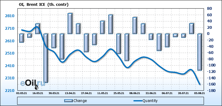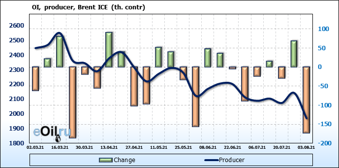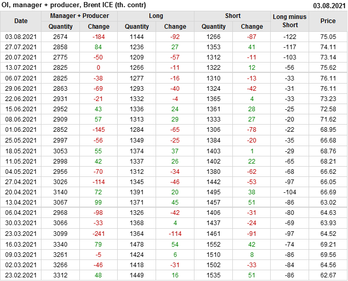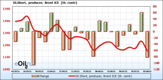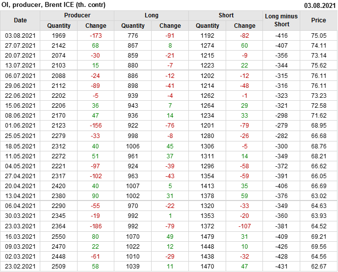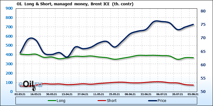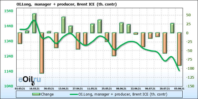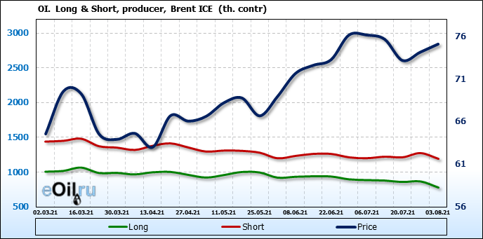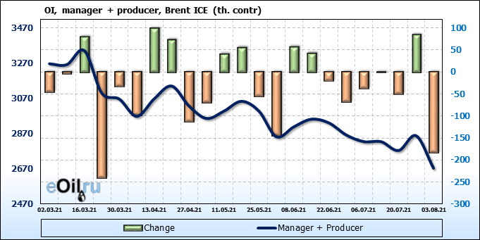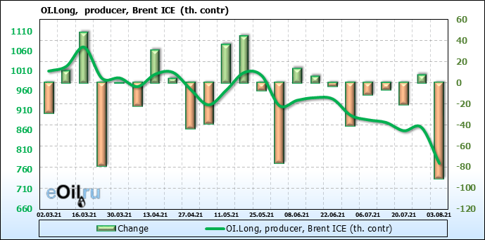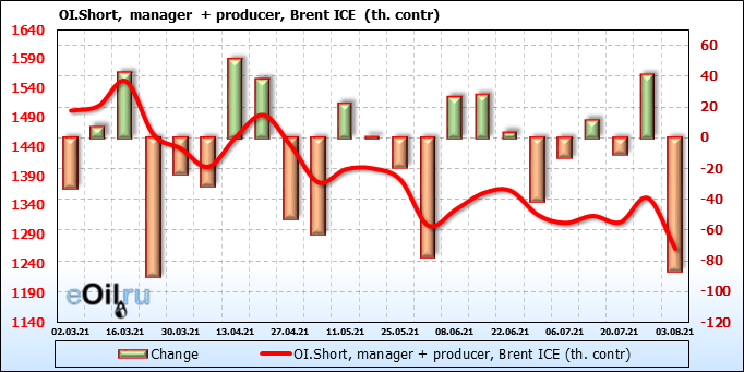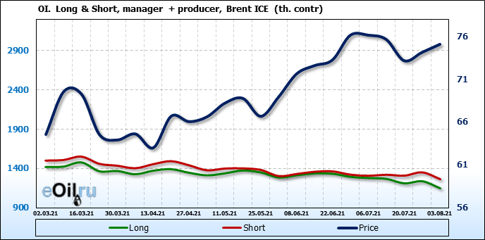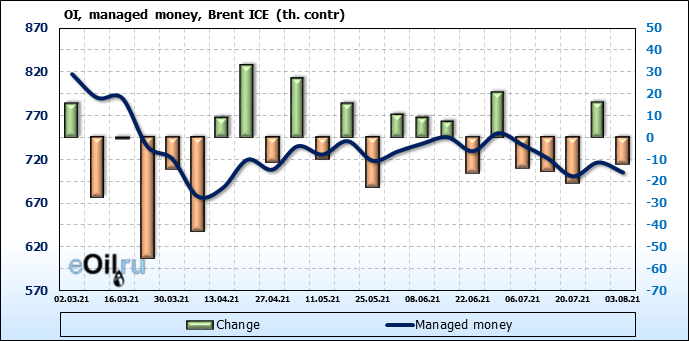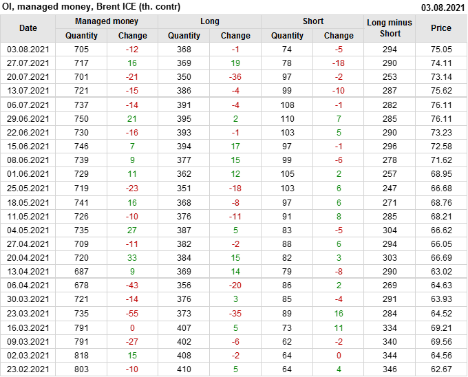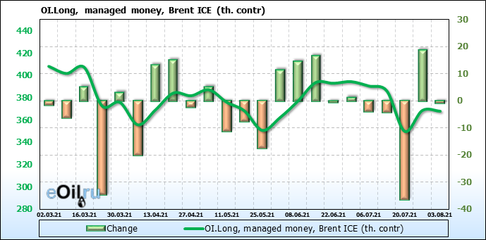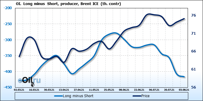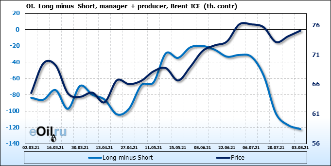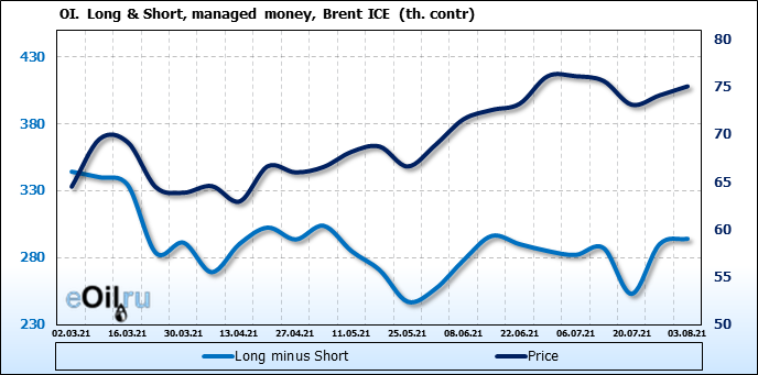 За прошедшую неделю, 28.07.21 — 03.08.21, разница между длинными и короткими позициями управляющих увеличилась на 4 тыс. контрактов. В тоже время, цена выросла на 0.94 доллара.