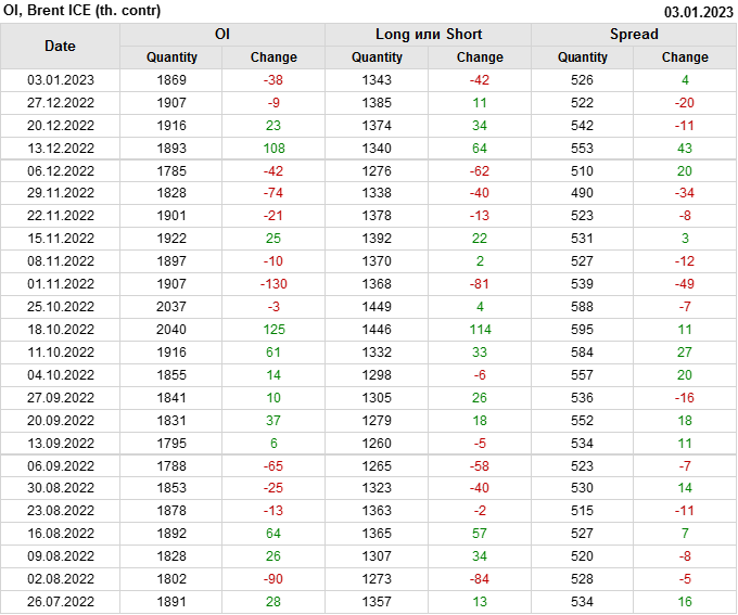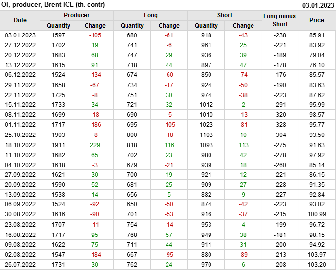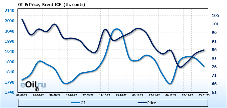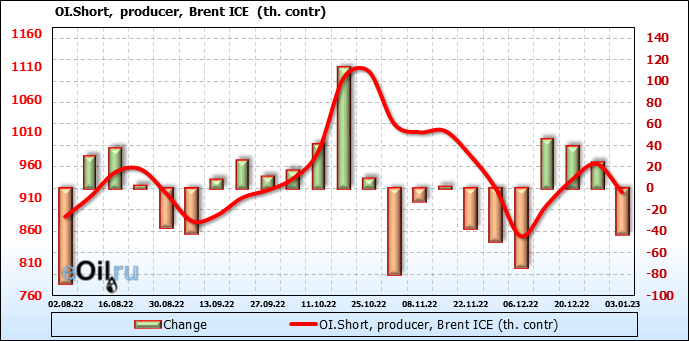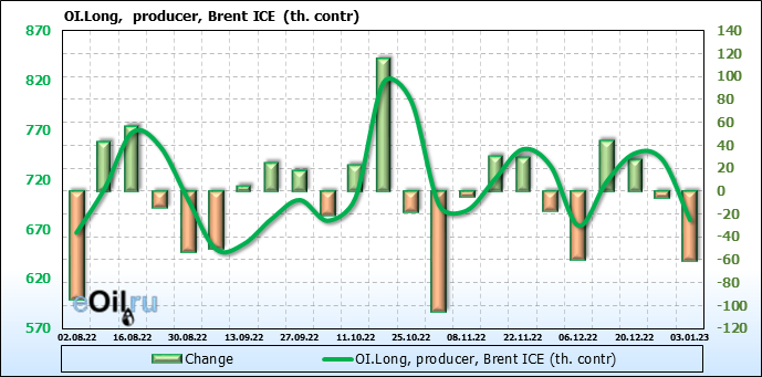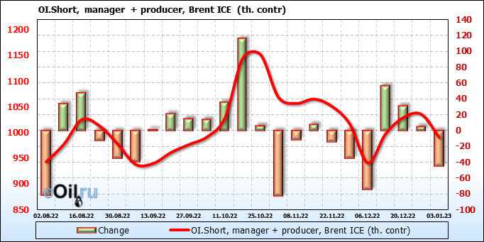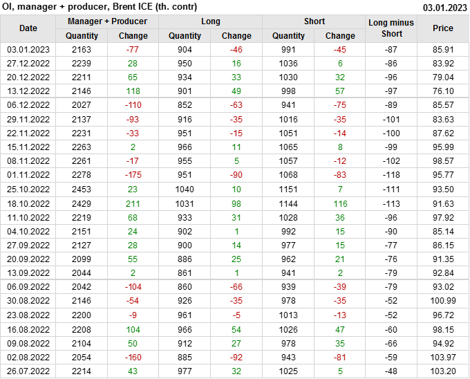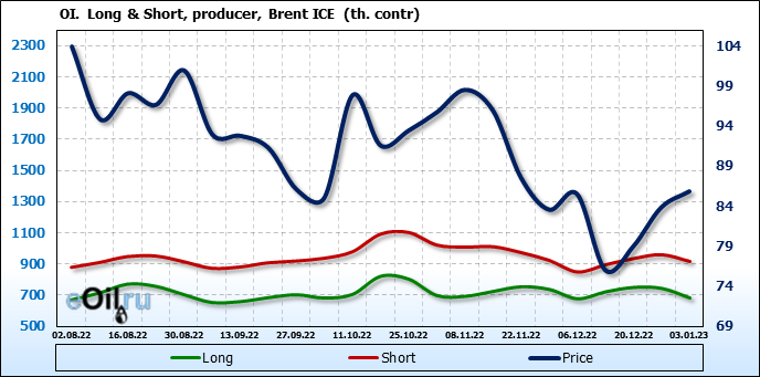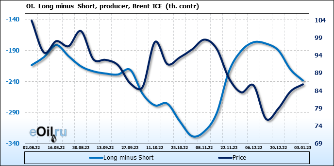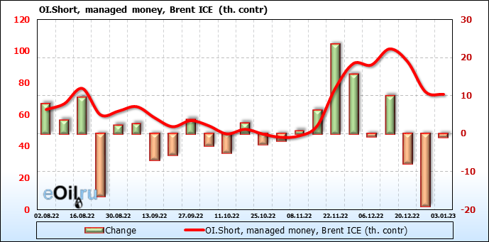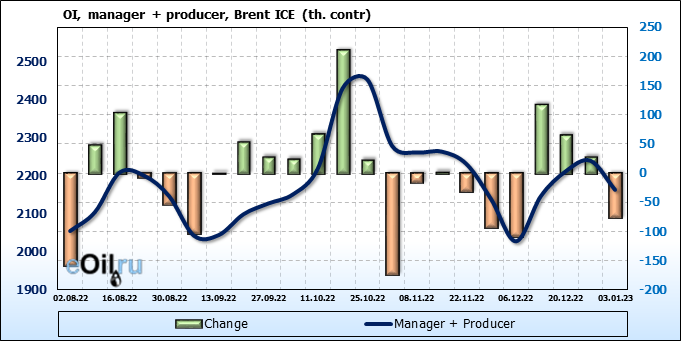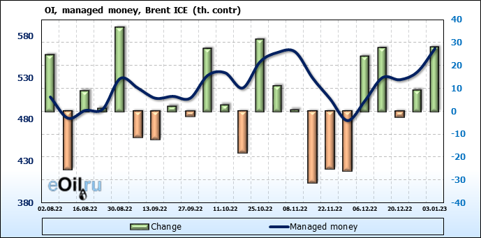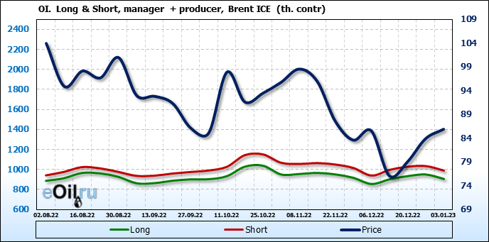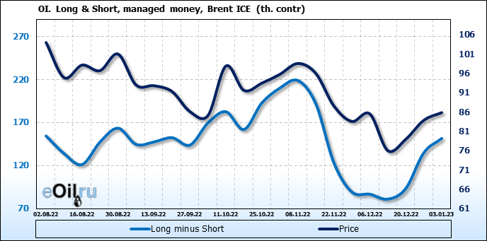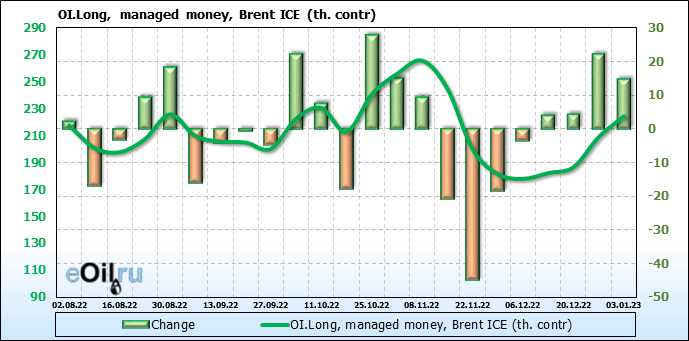 За прошедшую неделю, 28.12.22 — 03.01.23, разница между длинными и короткими позициями управляющих увеличилась на 16.8 тыс. контрактов. В тоже время, цена выросла на 1.99 доллара.