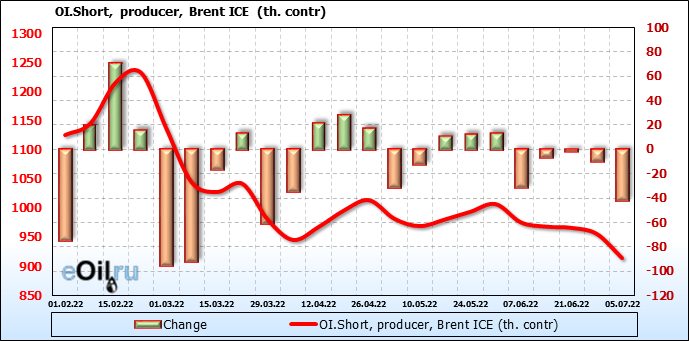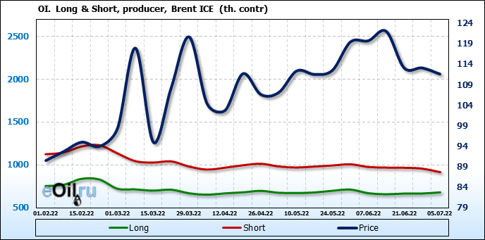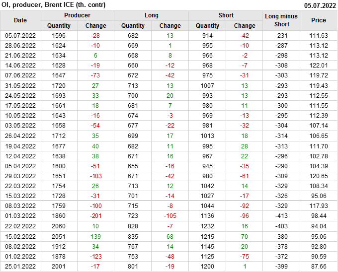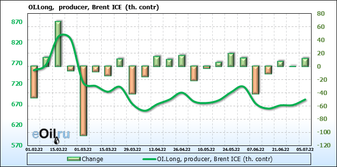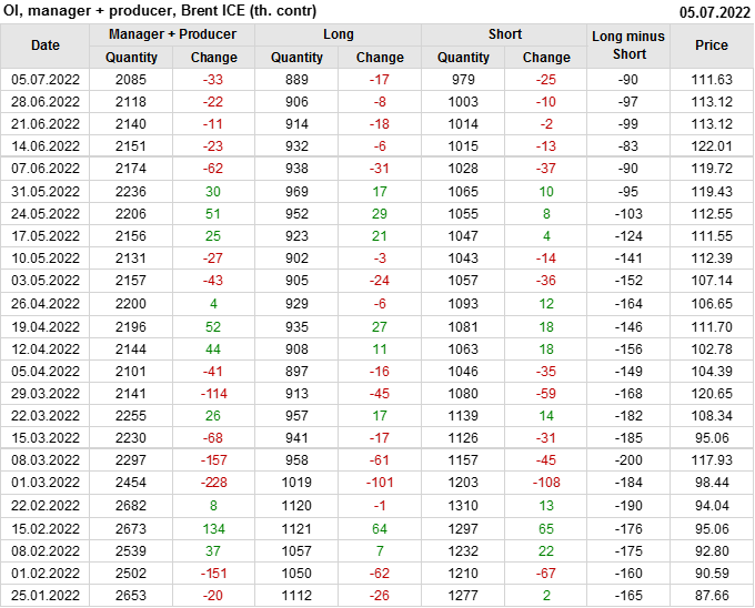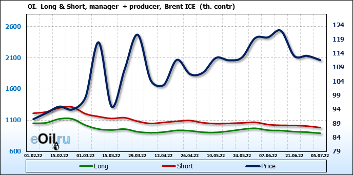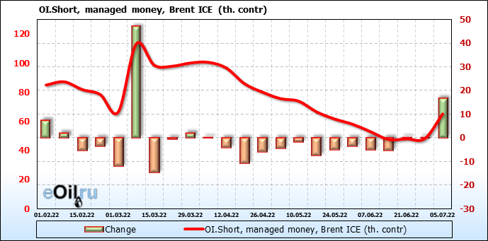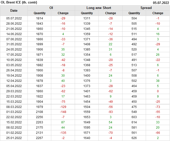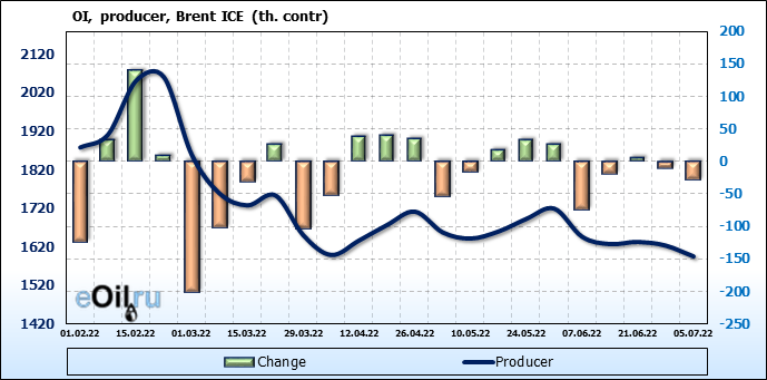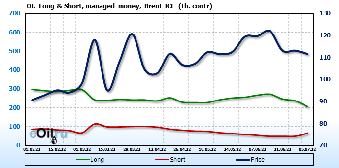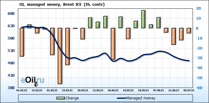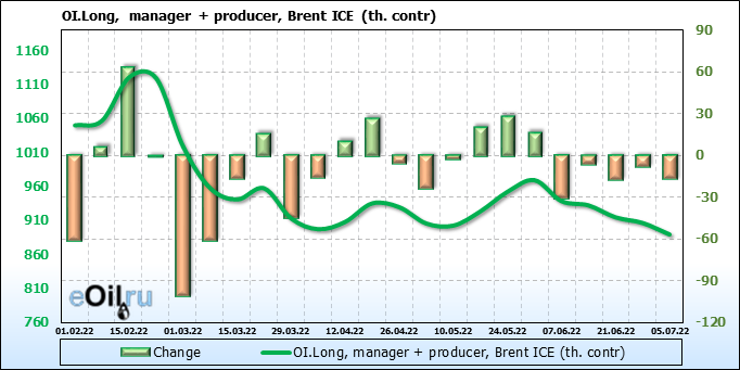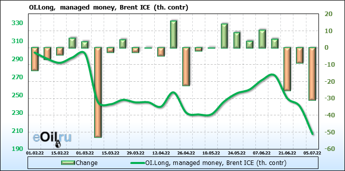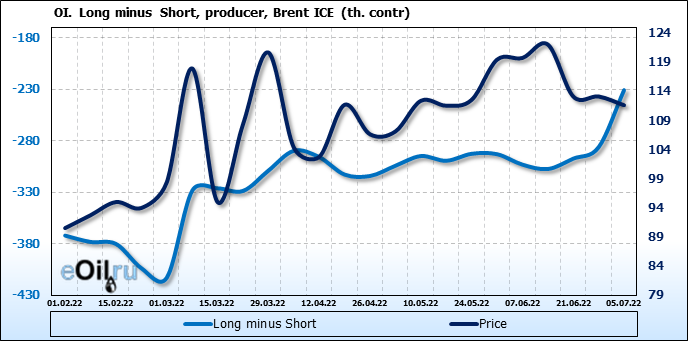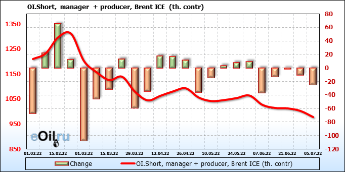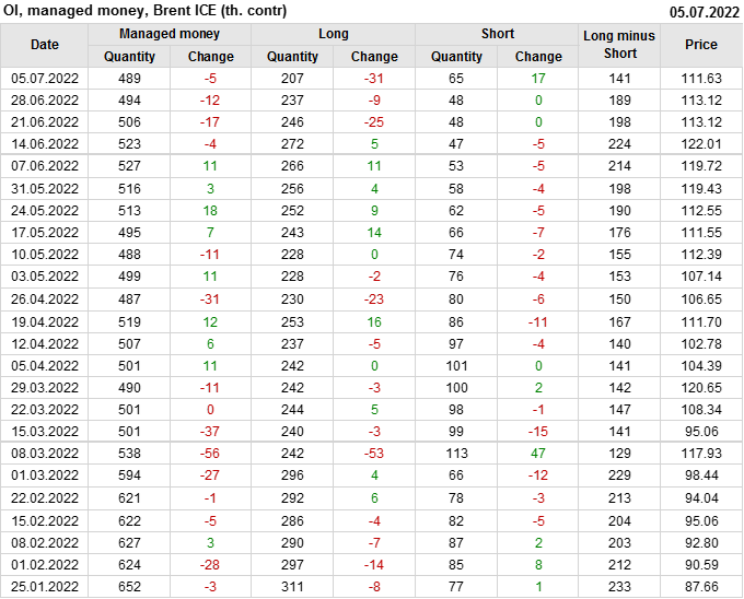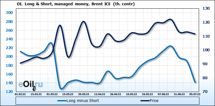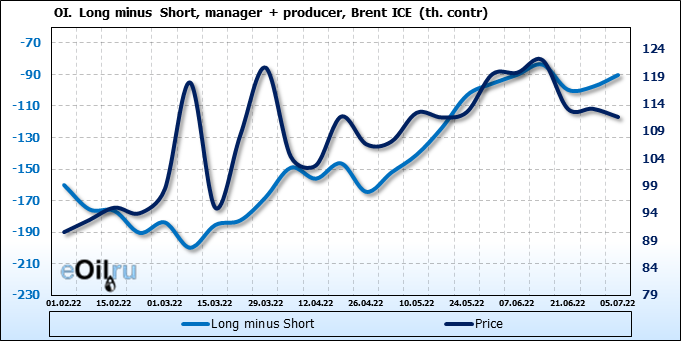 За прошедшую неделю, 29.06.22 — 05.07.22, разница между длинными и короткими позициями управляющих сократилась на 47.6 тыс. контрактов. В тоже время, цена упала на 1.49 доллара.