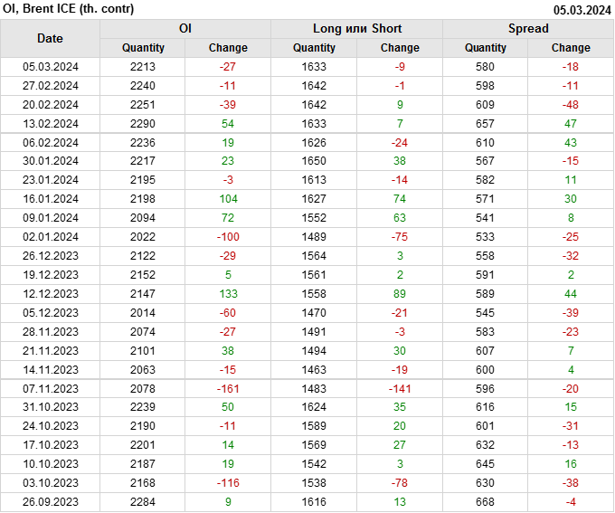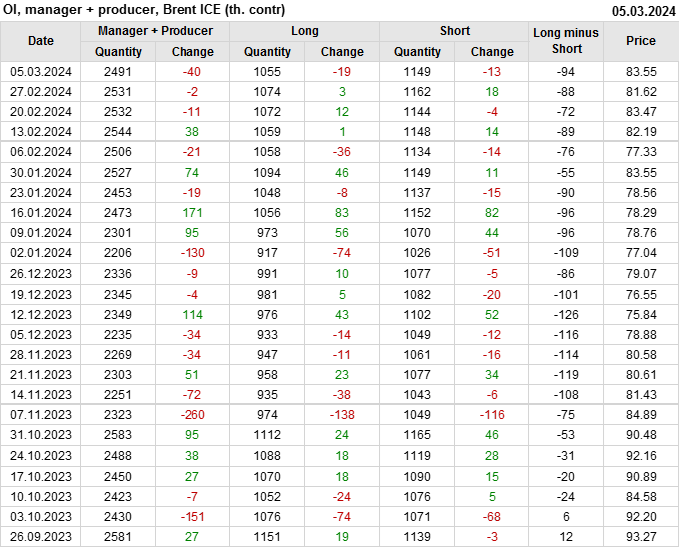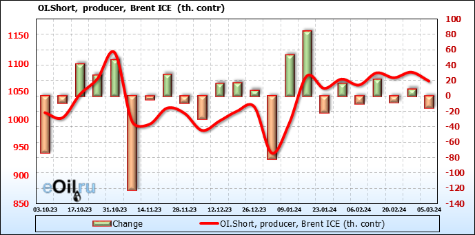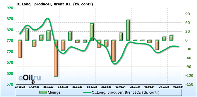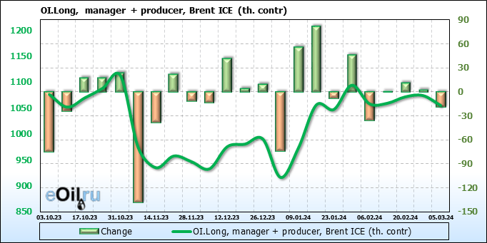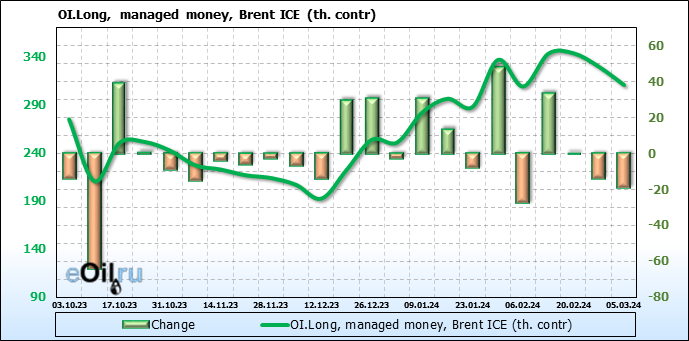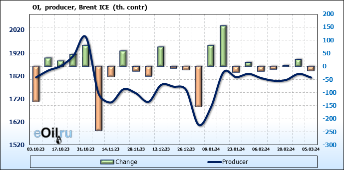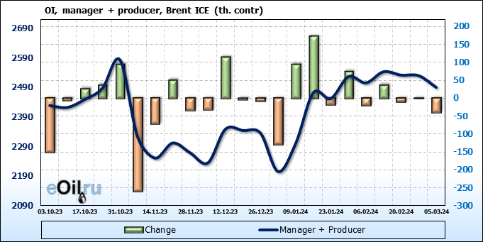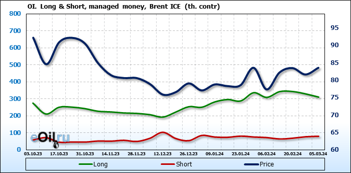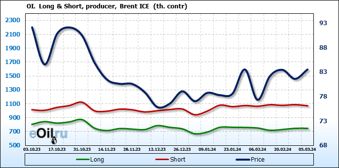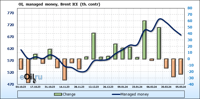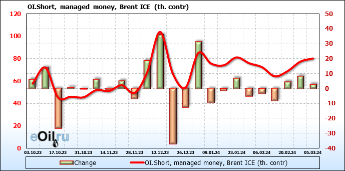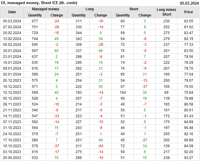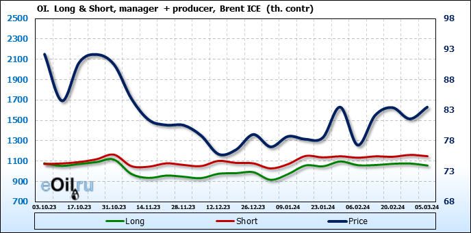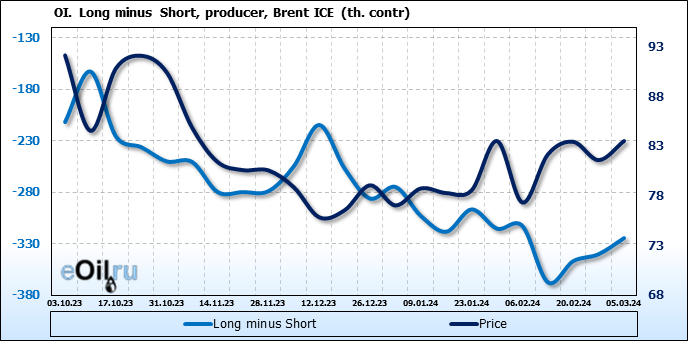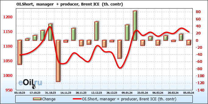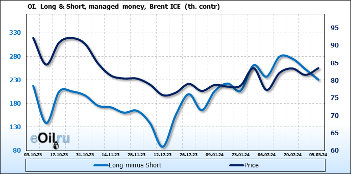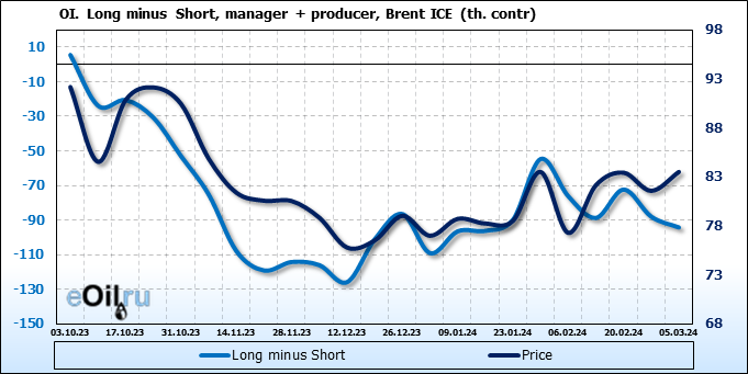 За прошедшую неделю, 28.02.24 — 05.03.24, разница между длинными и короткими позициями управляющих сократилась на 21.9 тыс. контрактов. В тоже время, цена выросла на 1.93 доллара.