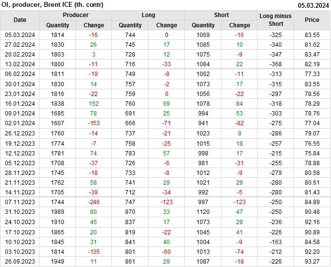 За неделю разница между длинными и короткими позициями производителей сократилась на 15.7 тыс. контрактов.