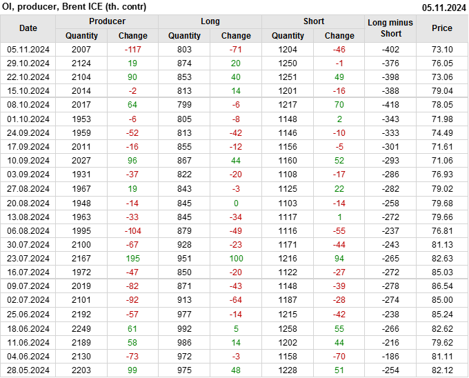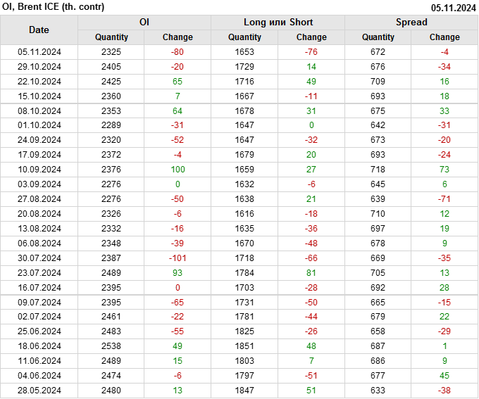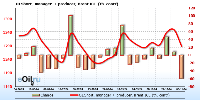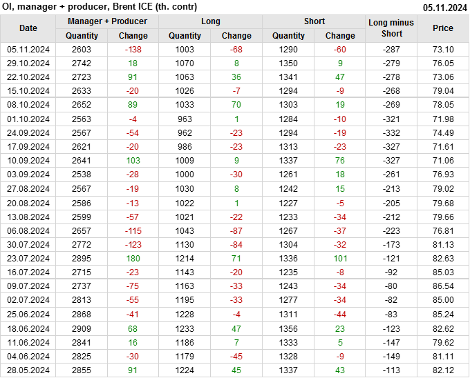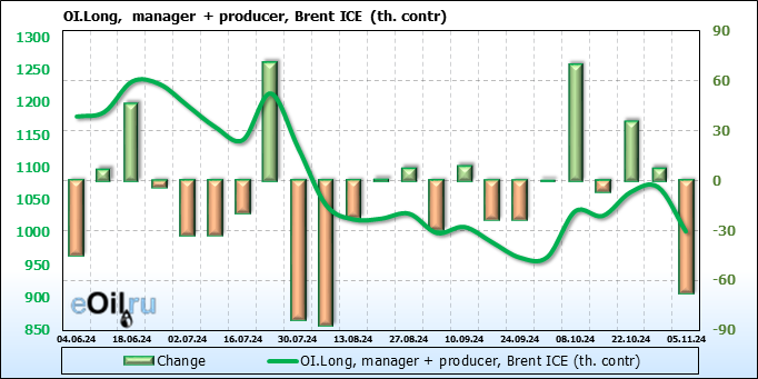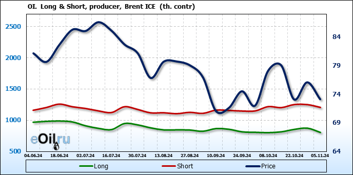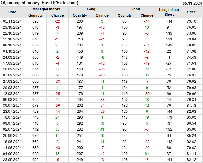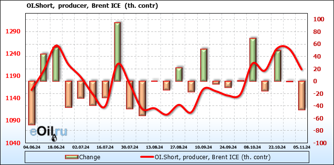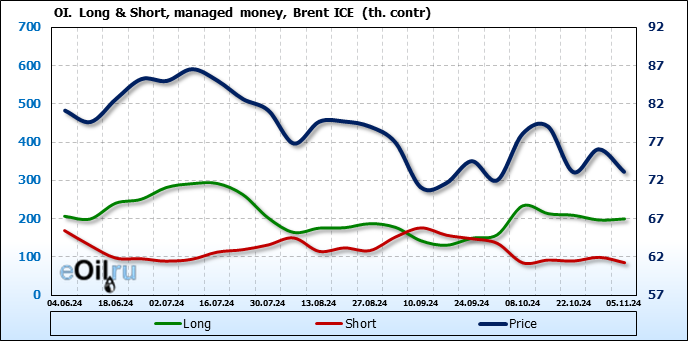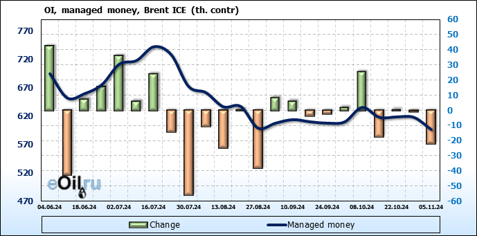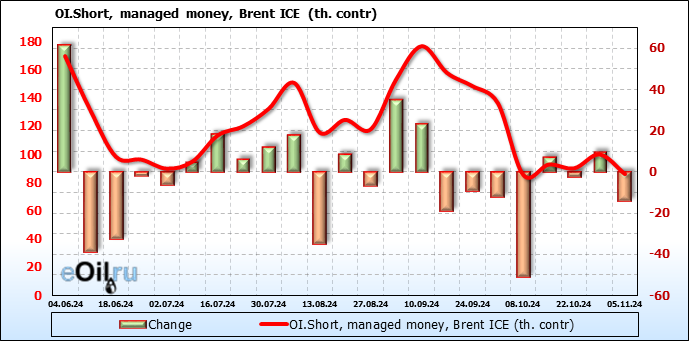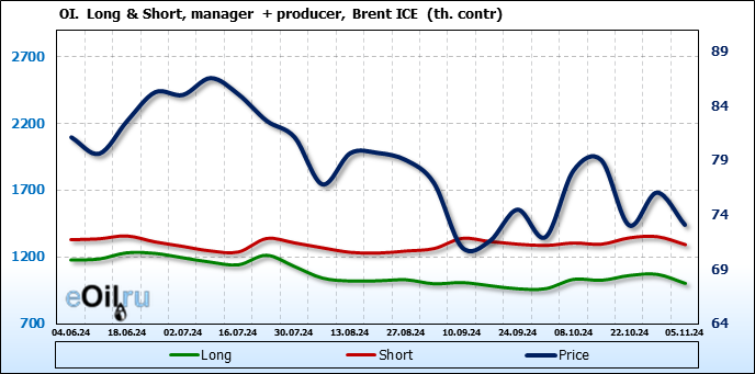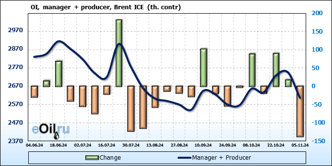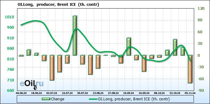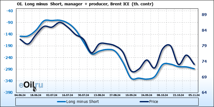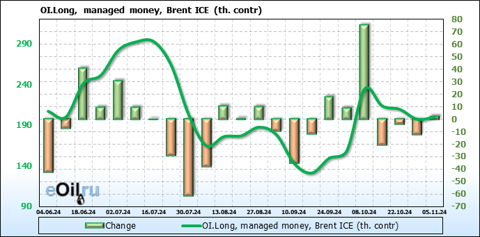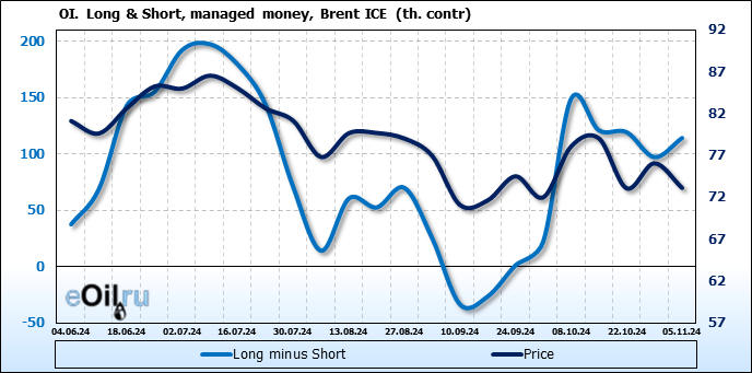 За прошедшую неделю, 30.10.24 — 05.11.24, разница между длинными и короткими позициями управляющих увеличилась на 17 тыс. контрактов. В тоже время, цена упала на 2.95 доллара.