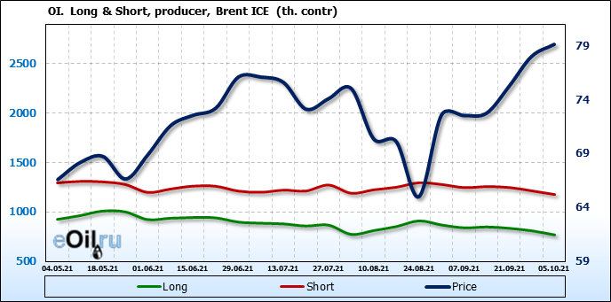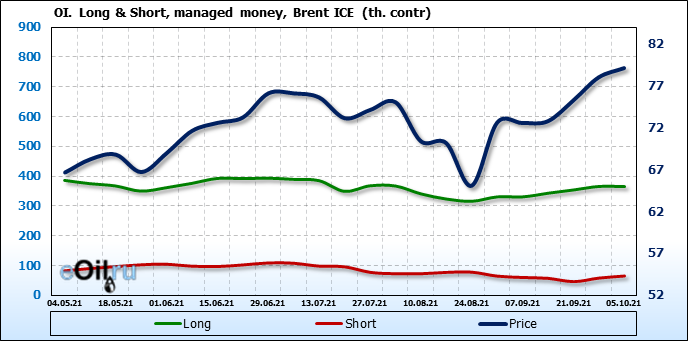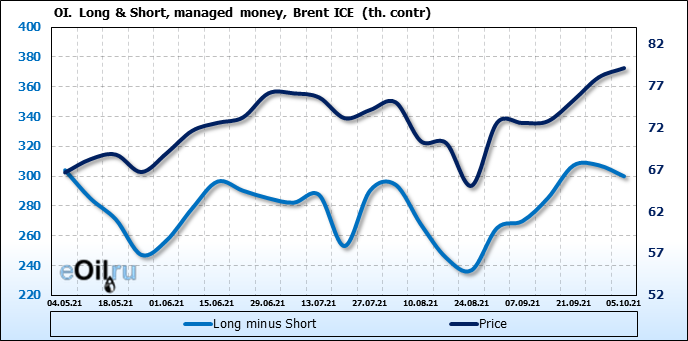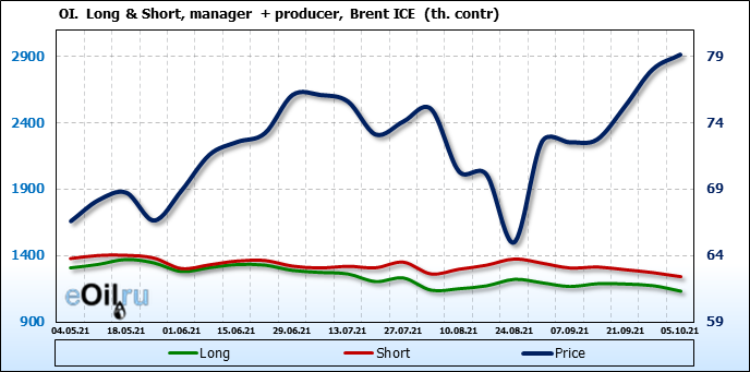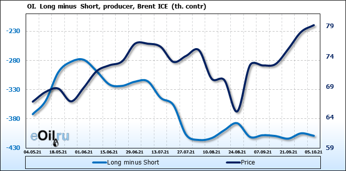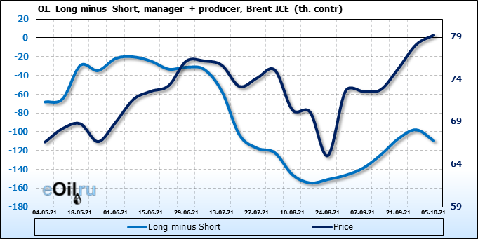 За прошедшую неделю, 29.09.21 — 05.10.21, разница между длинными и короткими позициями управляющих сократилась на 7.4 тыс. контрактов. В тоже время, цена выросла на 1.11 доллара.