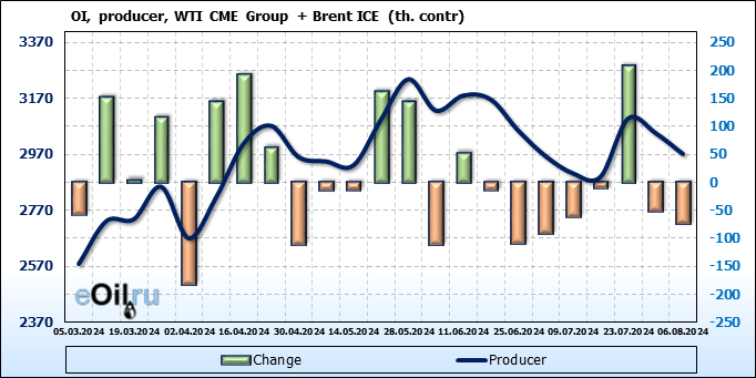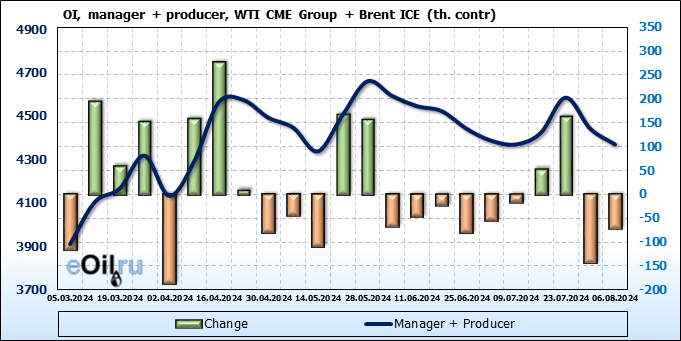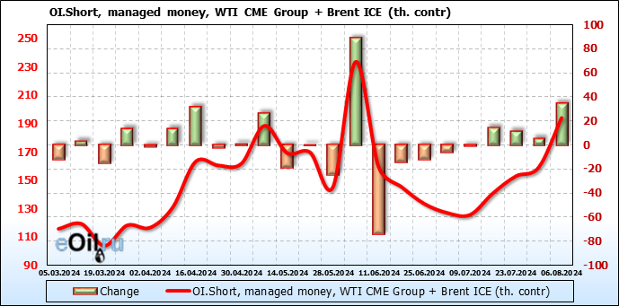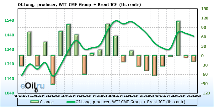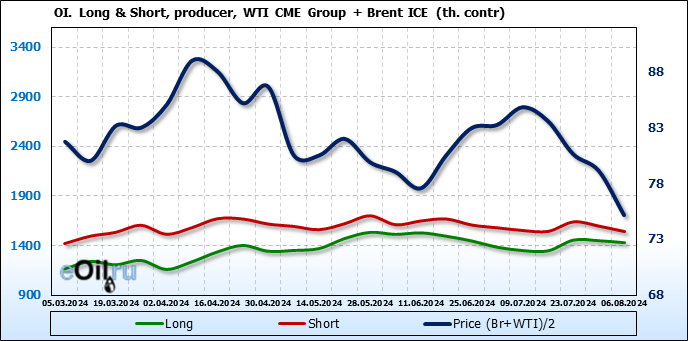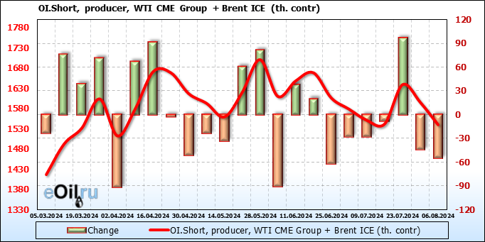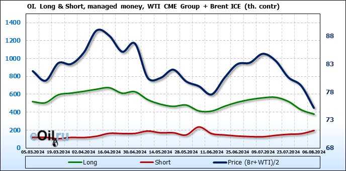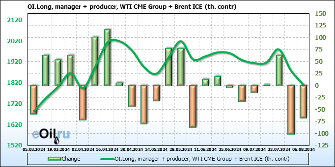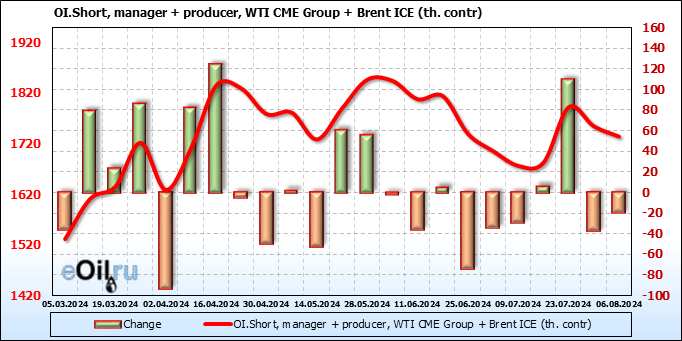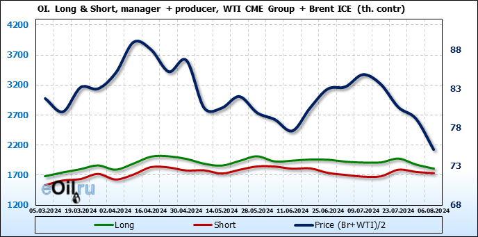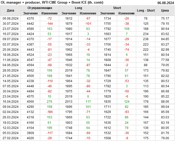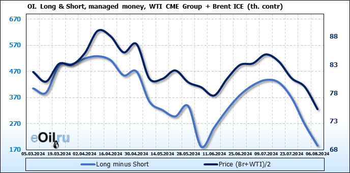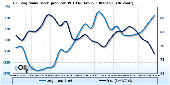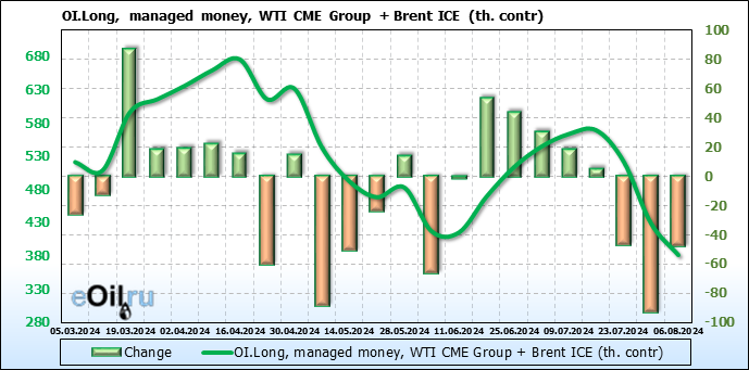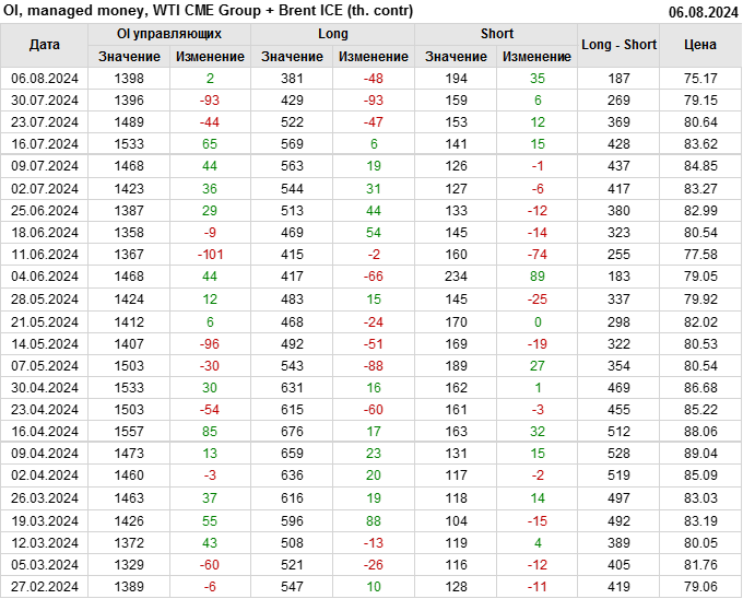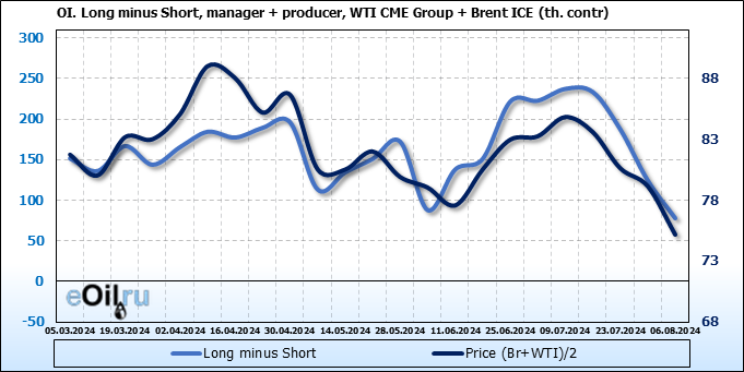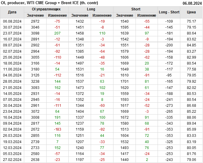 За прошедшую неделю, 31.07.24 — 06.08.24, разница между длинными и короткими позициями управляющих сократилась на 82.8 тыс. контрактов. В тоже время, цена упала на 3.98 доллара.