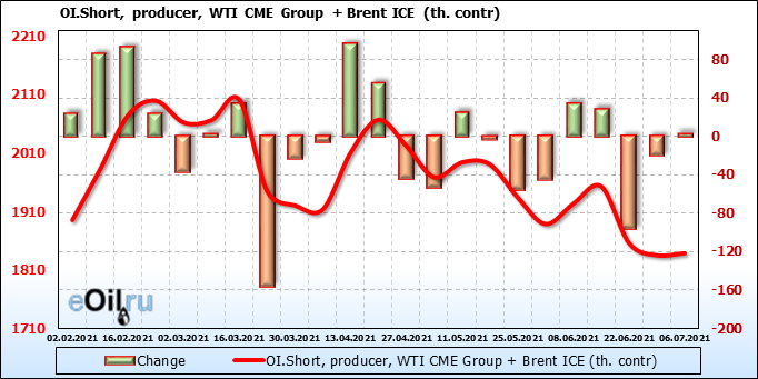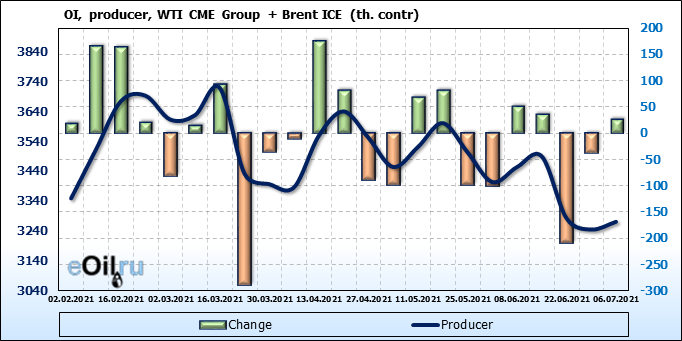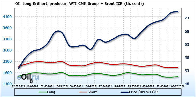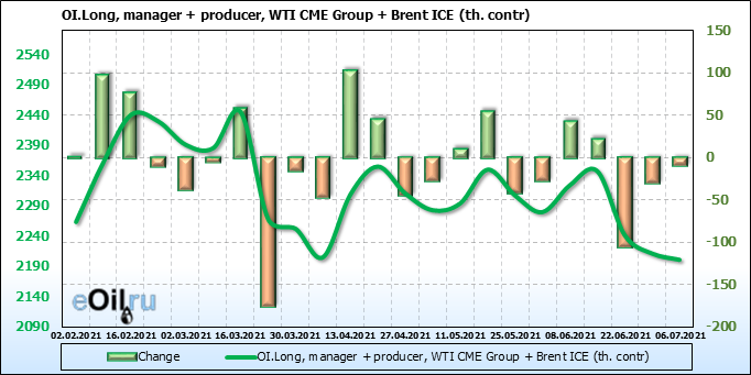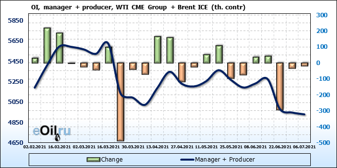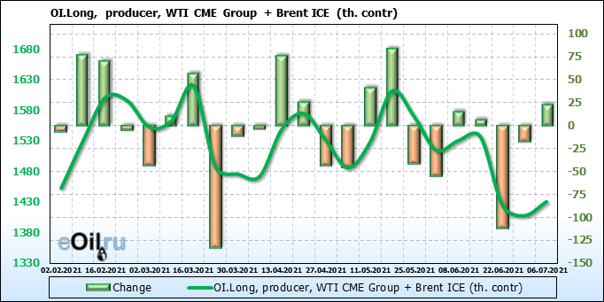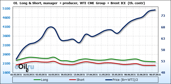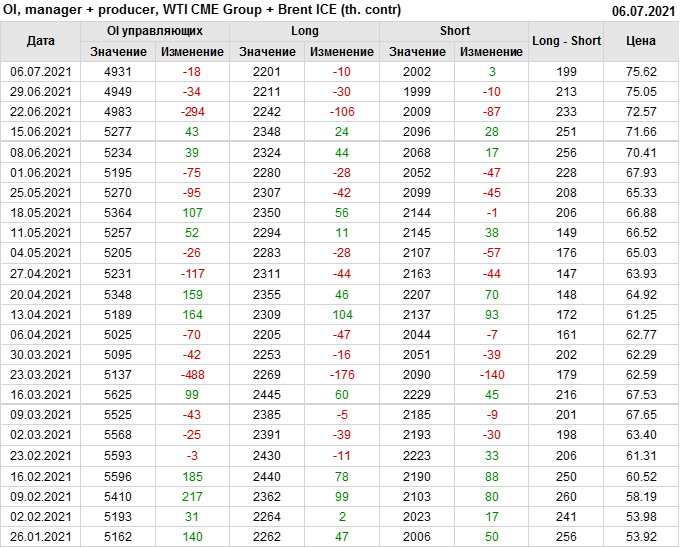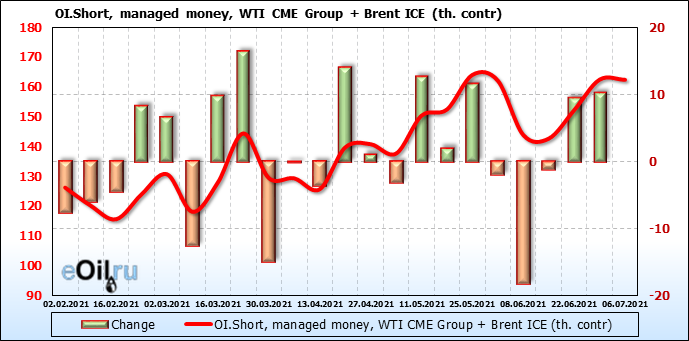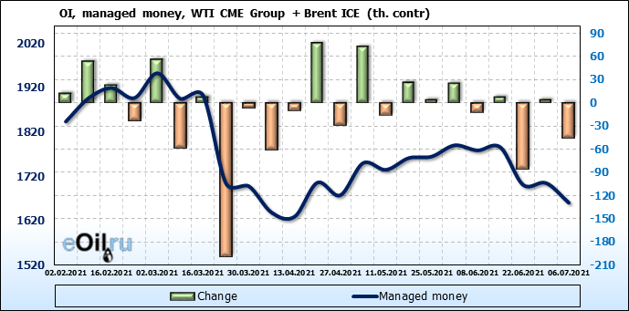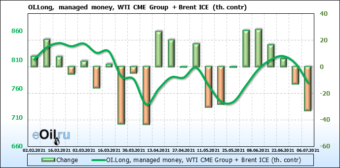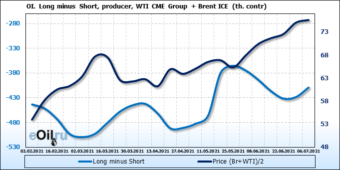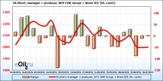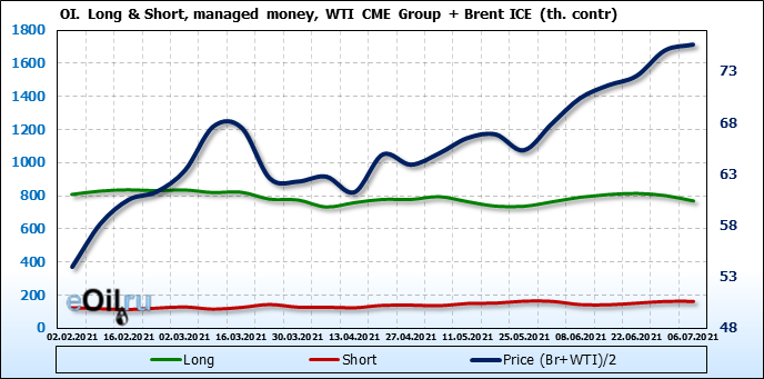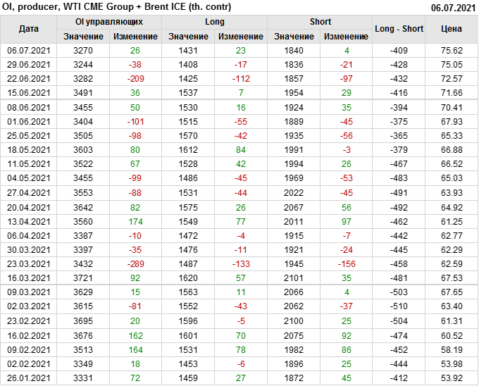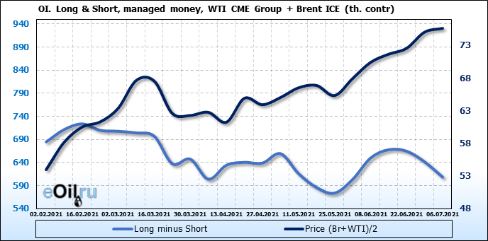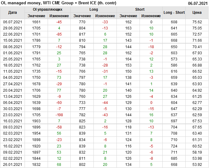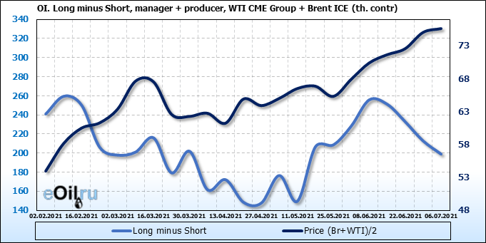 За прошлую неделю, 30.06.21 — 06.07.21, разница между длинными и короткими позициями управляющих сократилась на 33.2 тыс. контрактов. В тоже время, цена выросла на 0.57 доллара.