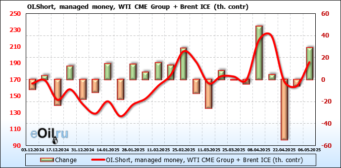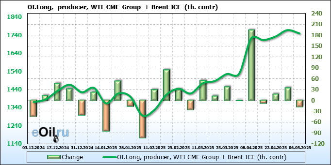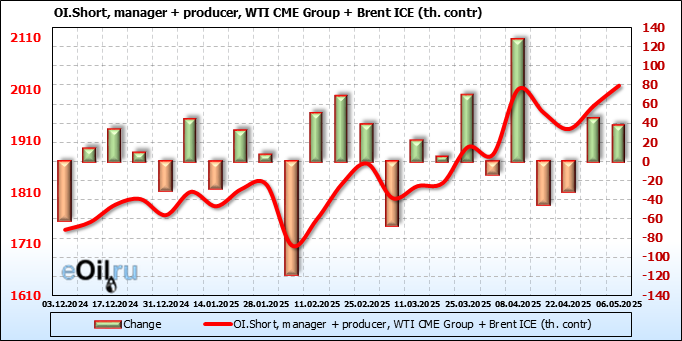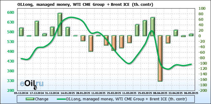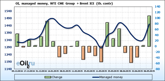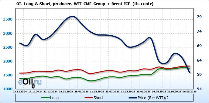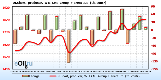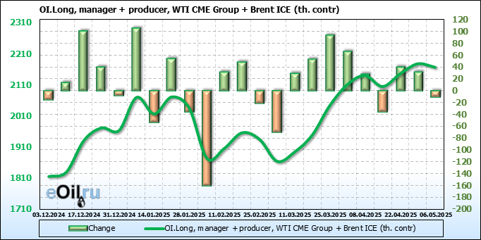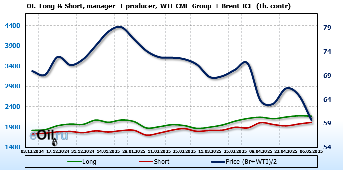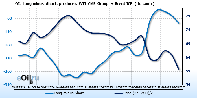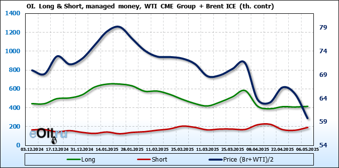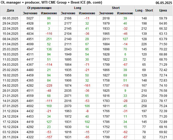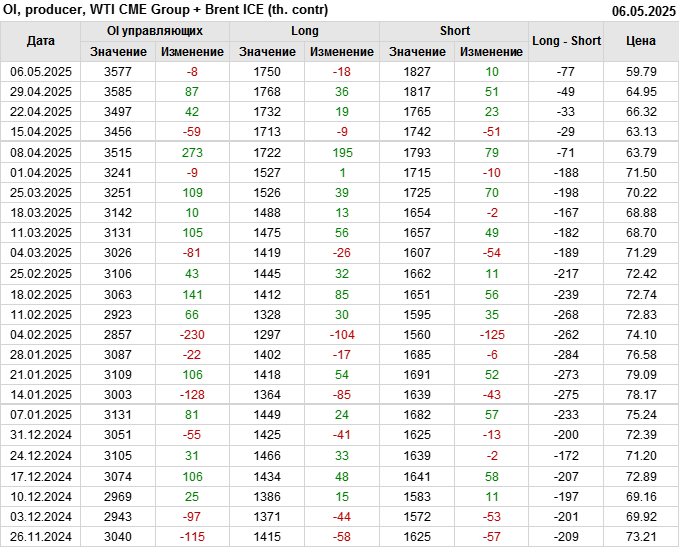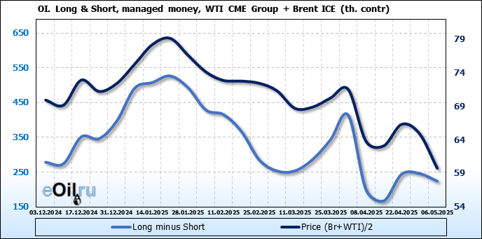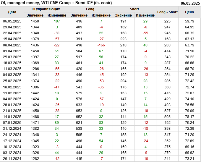 За прошедшую неделю, 30.04.25 — 06.05.25, разница между длинными и короткими позициями управляющих сократилась на 22 тыс. контрактов. В тоже время, цена упала на 5.16 доллара.