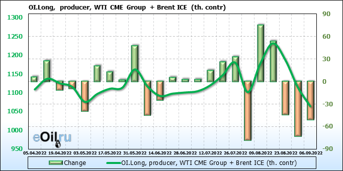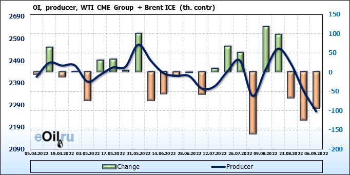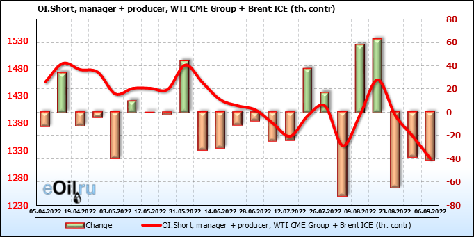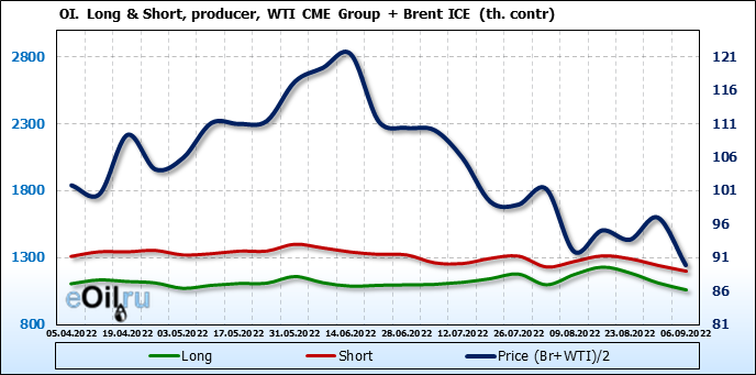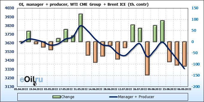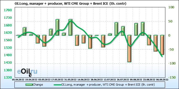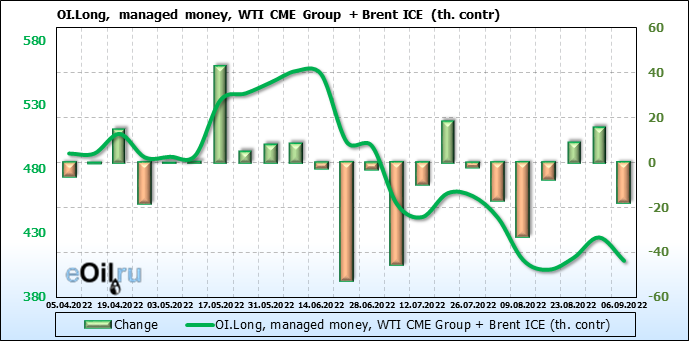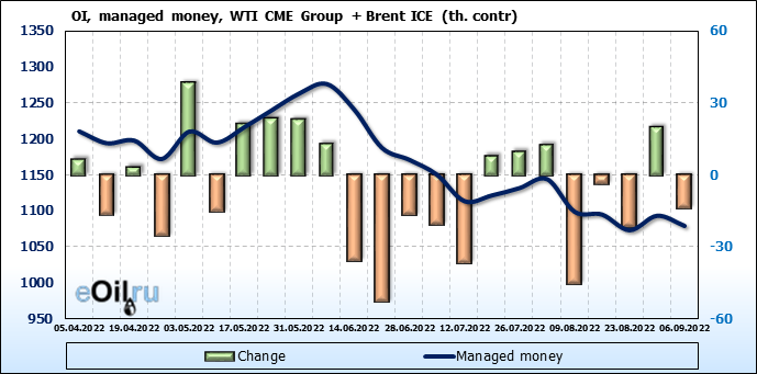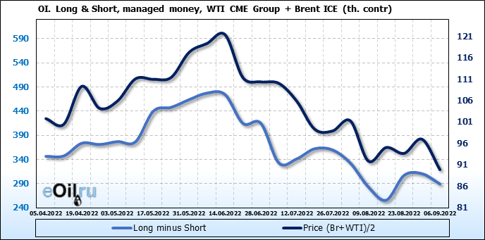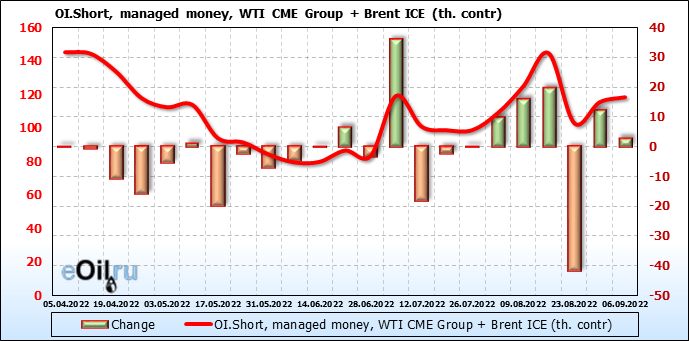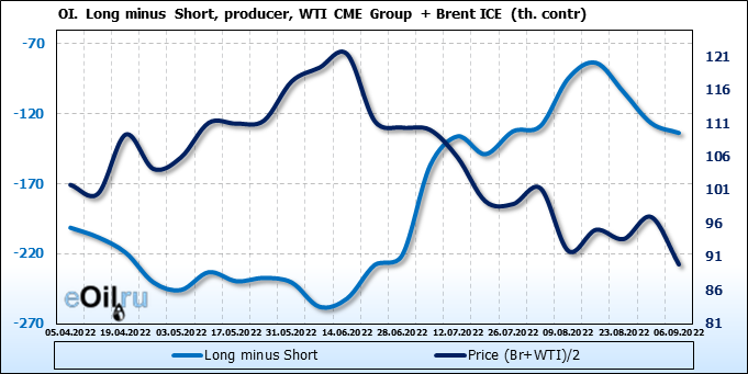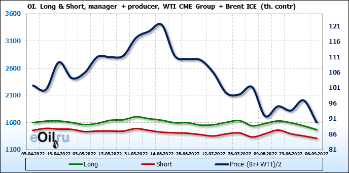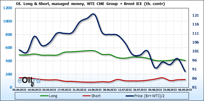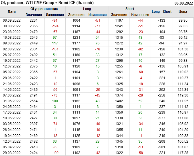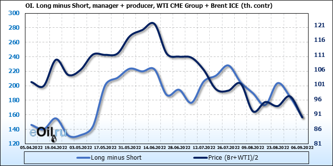 За прошедшую неделю, 31.08.22 — 06.09.22, разница между длинными и короткими позициями управляющих сократилась на 21.2 тыс. контрактов. В тоже время, цена упала на 7.08 доллара.