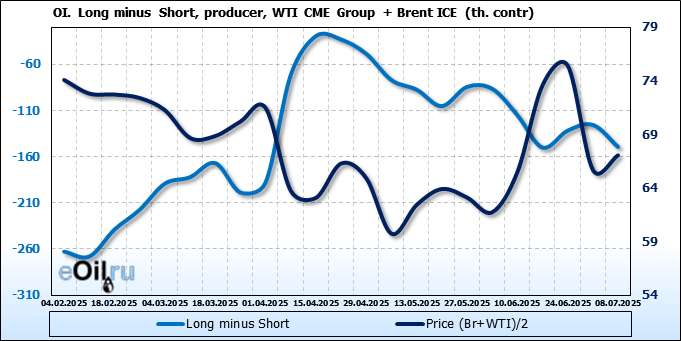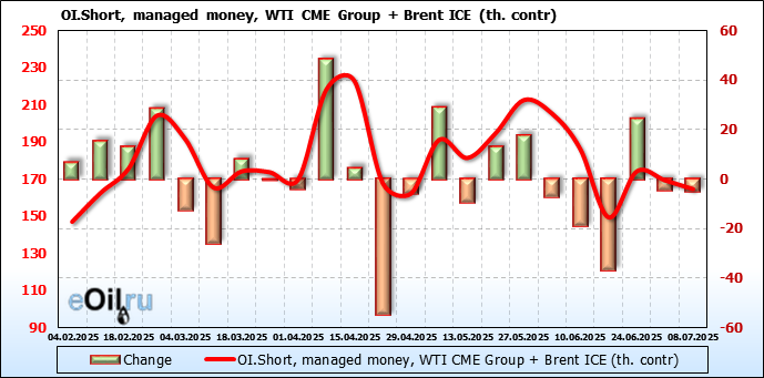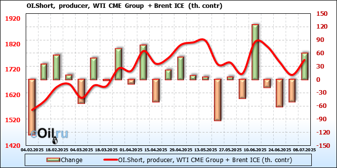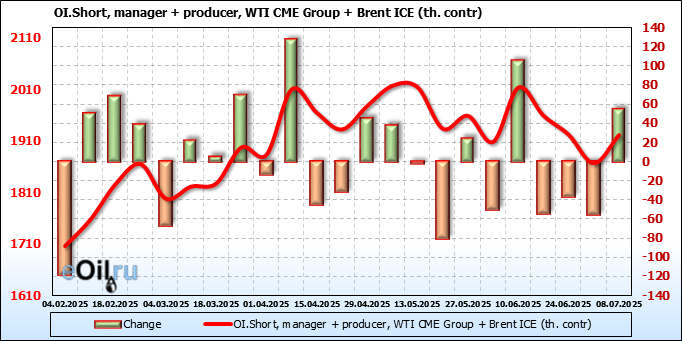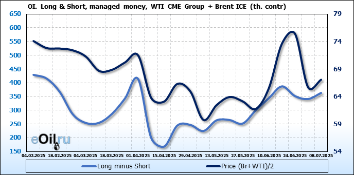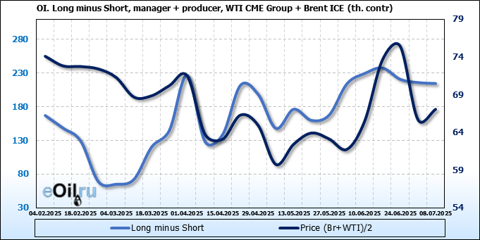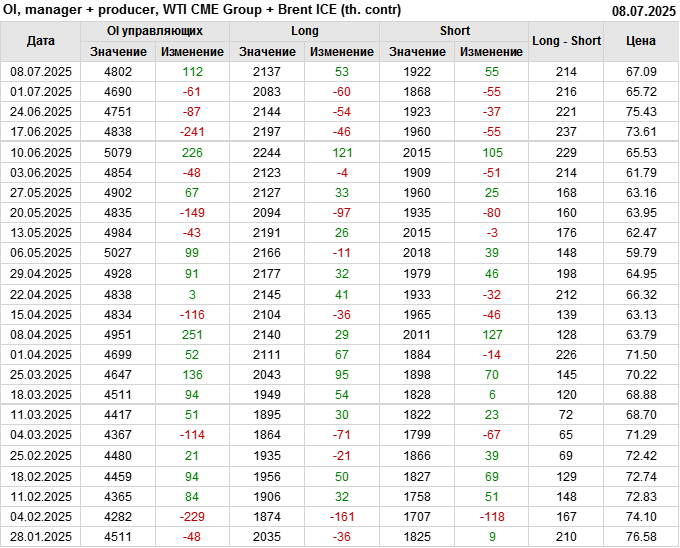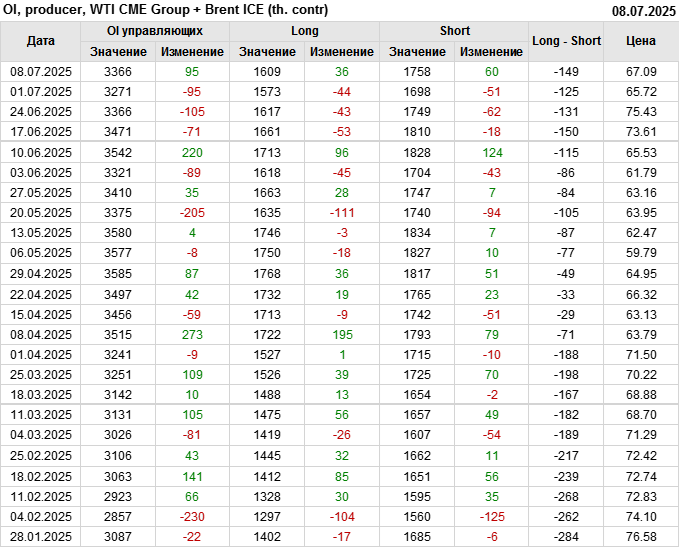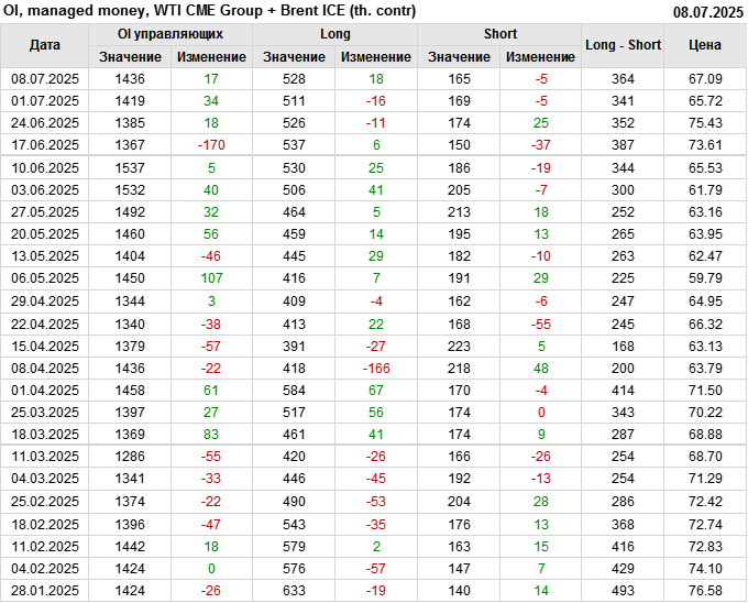 За прошедшую неделю, 02.07.25 — 08.07.25, разница между длинными и короткими позициями управляющих увеличилась на 22.4 тыс. контрактов. В тоже время, цена выросла на 1.37 доллара.