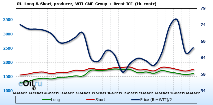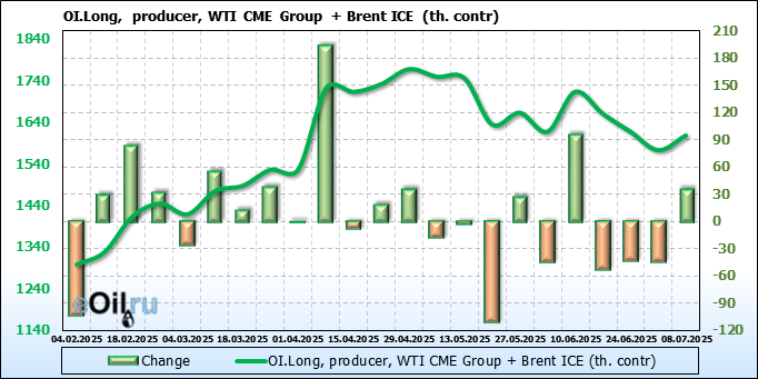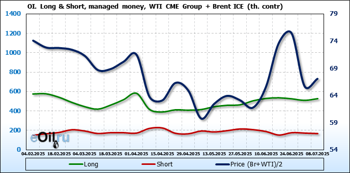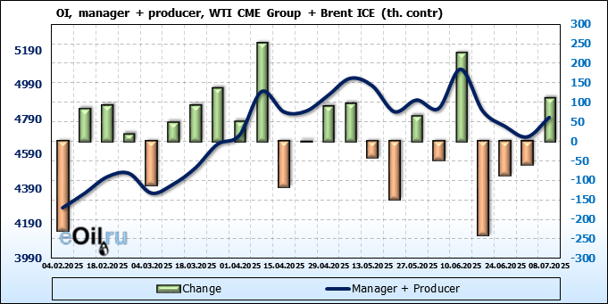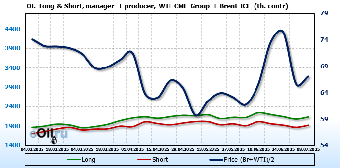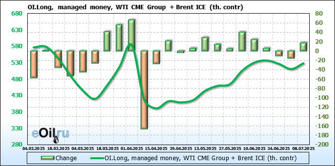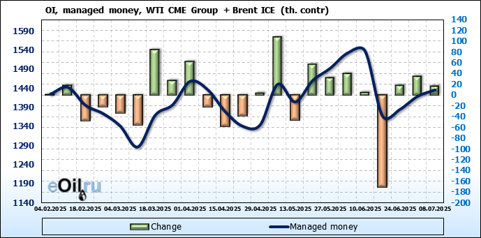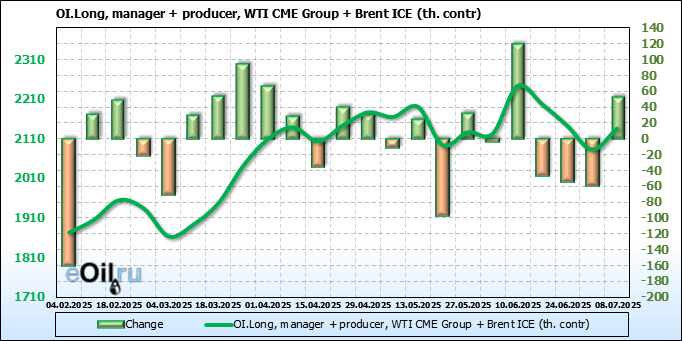 За прошедшую неделю, 02.07.25 — 08.07.25, разница между длинными и короткими позициями управляющих увеличилась на 22.4 тыс. контрактов. В тоже время, цена выросла на 1.37 доллара.