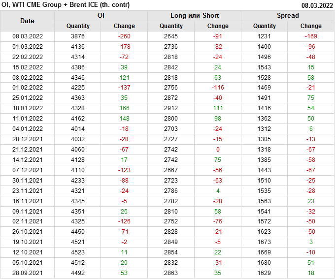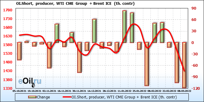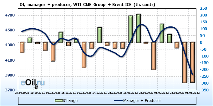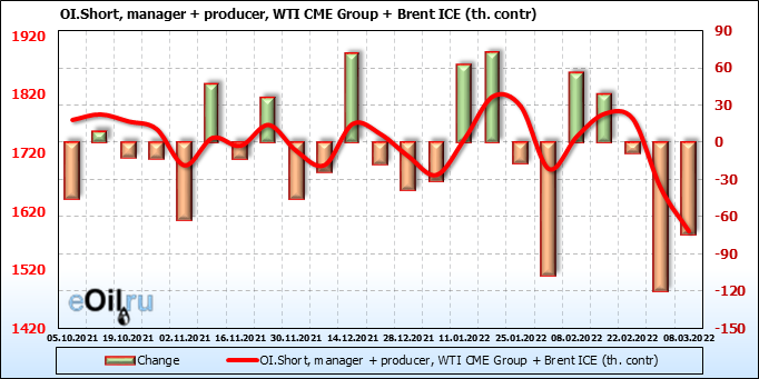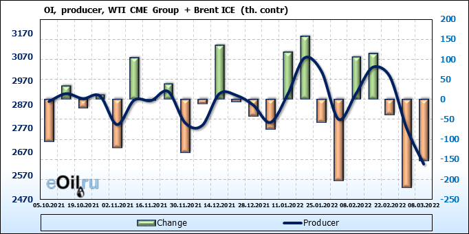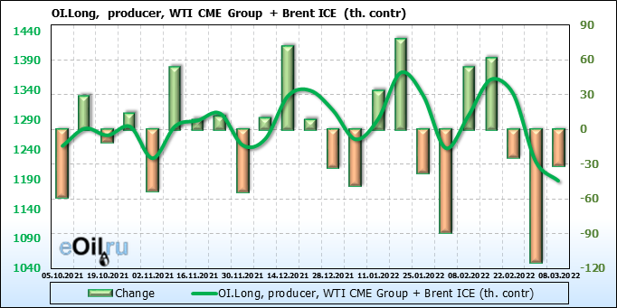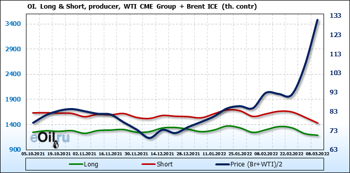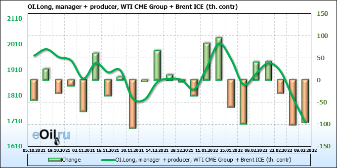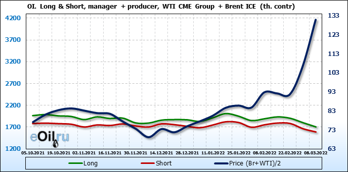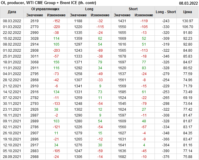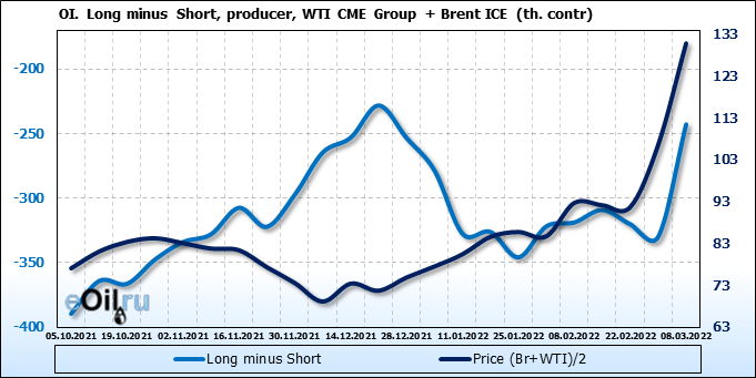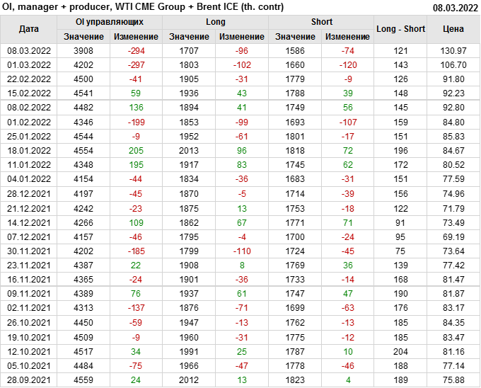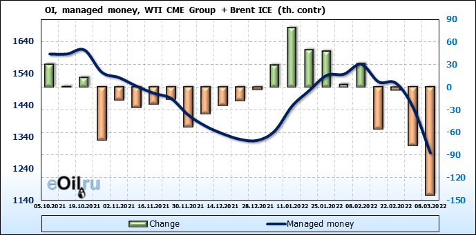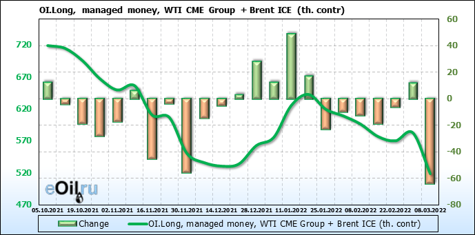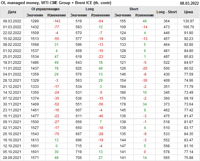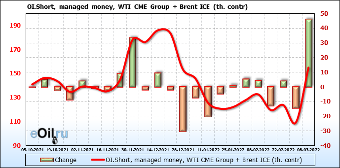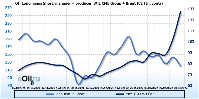 За прошедшую неделю, 02.03.22 — 08.03.22, разница между длинными и короткими позициями управляющих сократилась на 109.5 тыс. контрактов. В тоже время, цена выросла на 24.27 доллара.