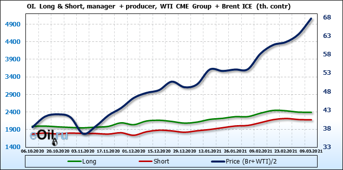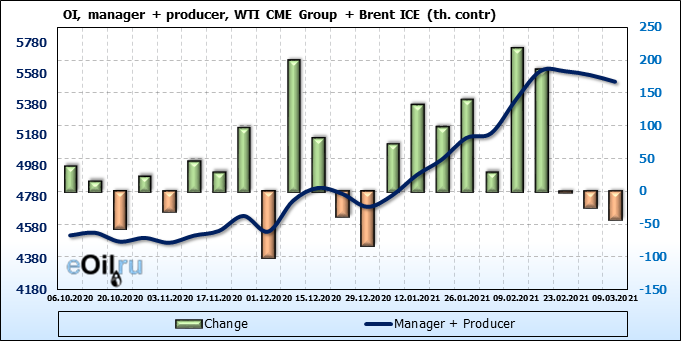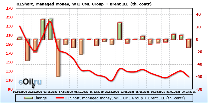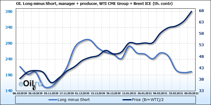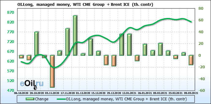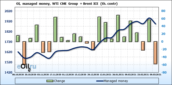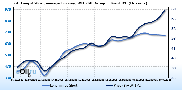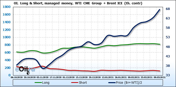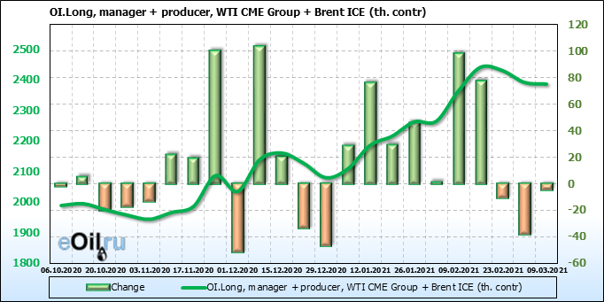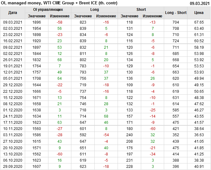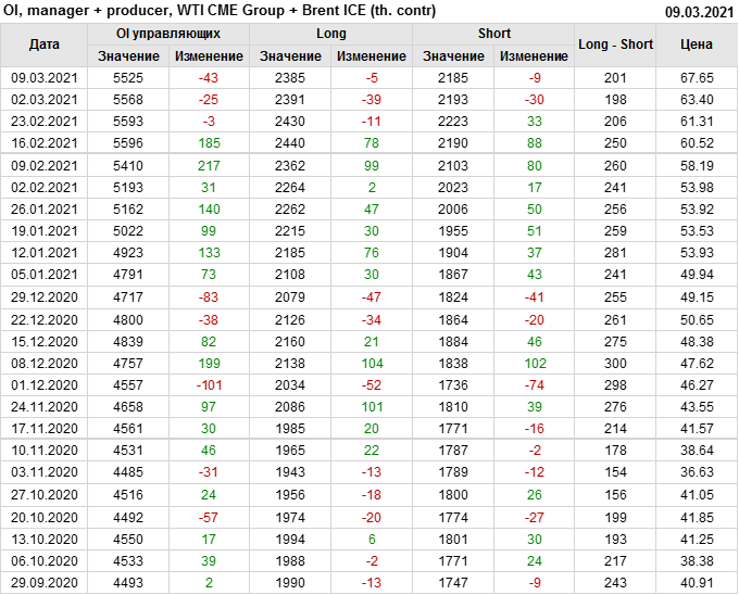 За прошлую неделю, 03.03.21 — 09.03.21, разница между длинными и короткими позициями управляющих упала на 3 тыс. контрактов. В тоже время, цена выросла на 4.25 доллара. Управляющие не горят желанием покупать, что заставляет нас рассуждать о потери доверия к тенденции со стороны быков — спекулянтов. Рынок становится более тонким. Без прихода свежих объемов, толкать цену вверх скоро будет некому.