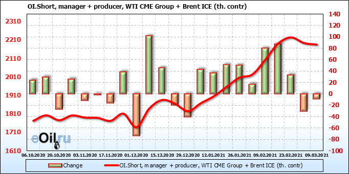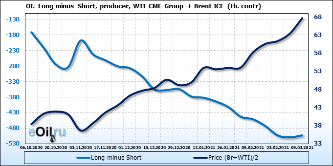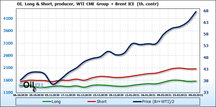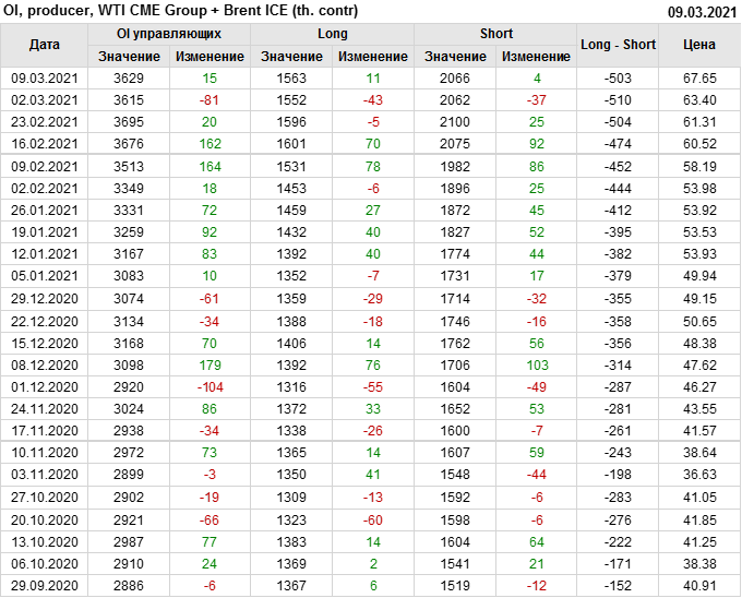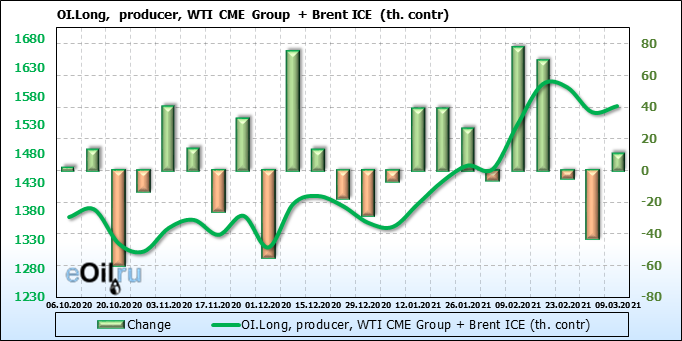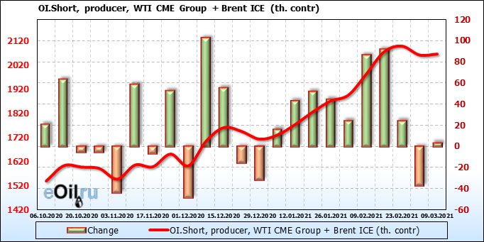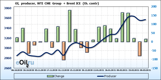 За прошлую неделю, 03.03.21 — 09.03.21, разница между длинными и короткими позициями производителей выросла на 7 тыс. контрактов. В тоже время, цена выросла на 4.25 доллара. Производители не торопятся наращивать продажи, предполагая, что возможен рост цены в ближайшее время.