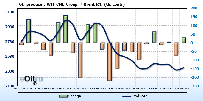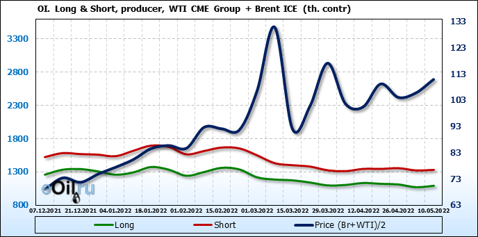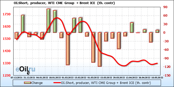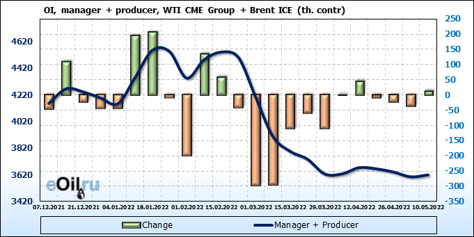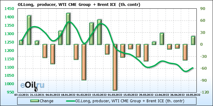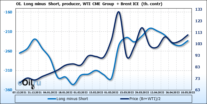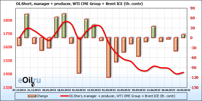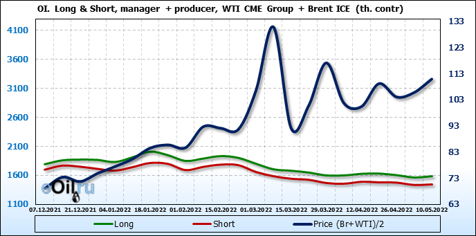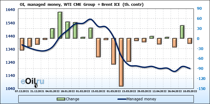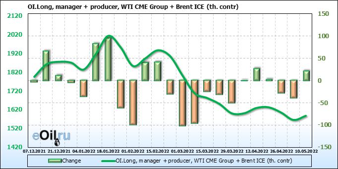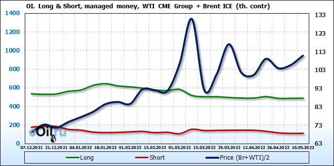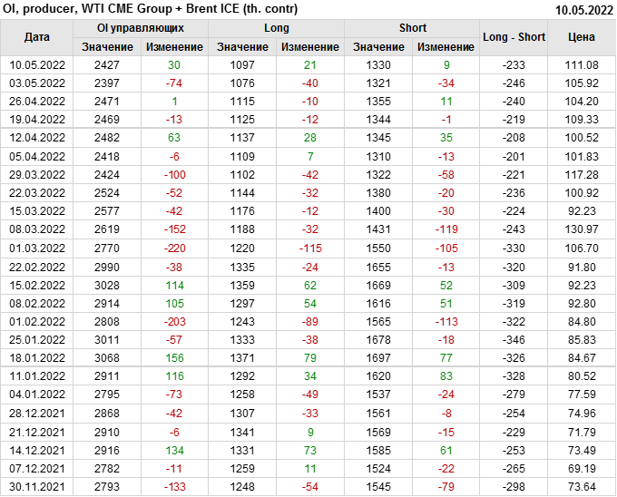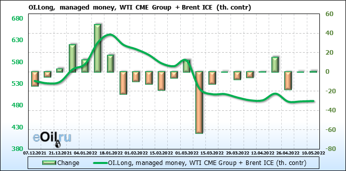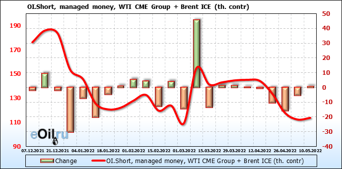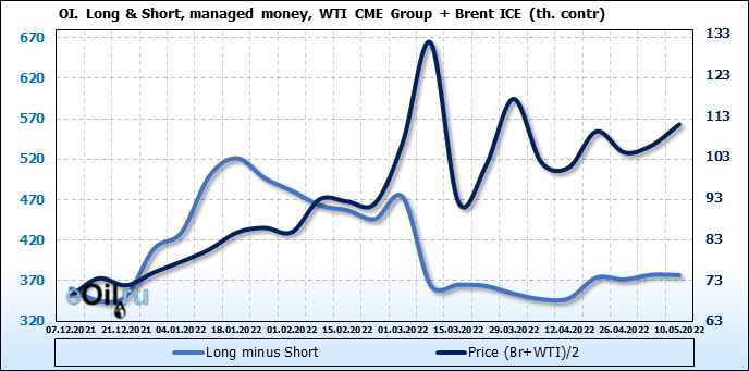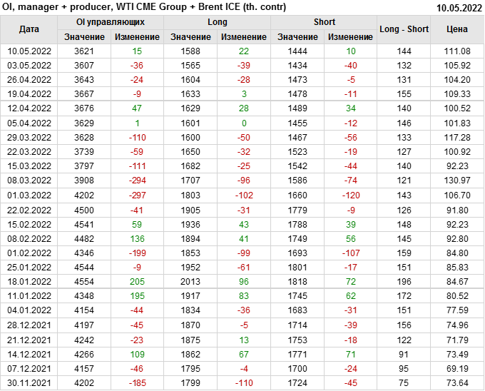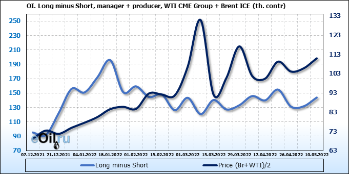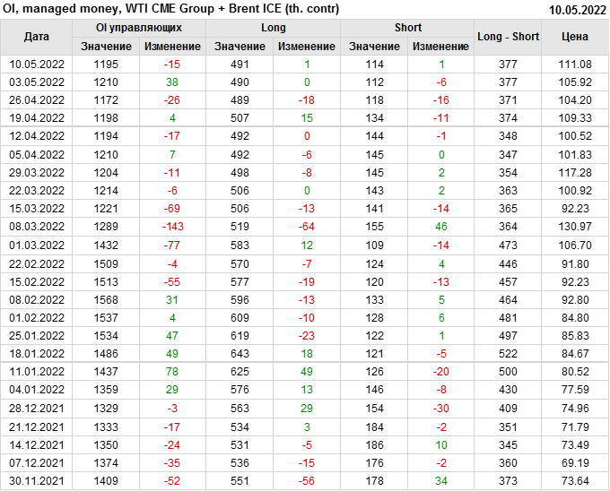 За прошедшую неделю, 04.05.22 — 10.05.22, разница между длинными и короткими позициями управляющих сократилась на 0.5 тыс. контрактов. В тоже время, цена выросла на 5.16 доллара.