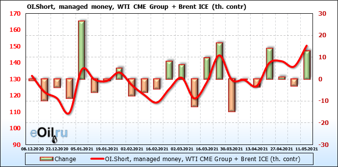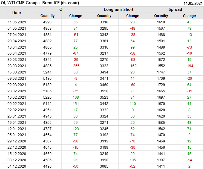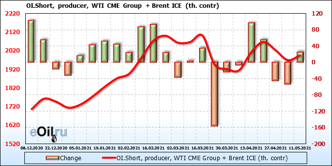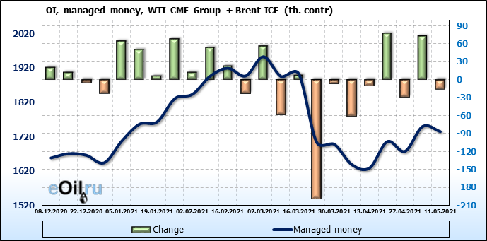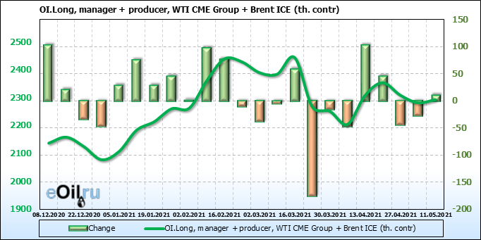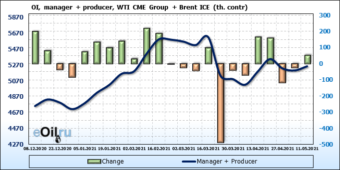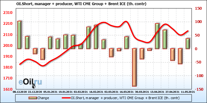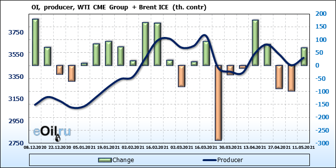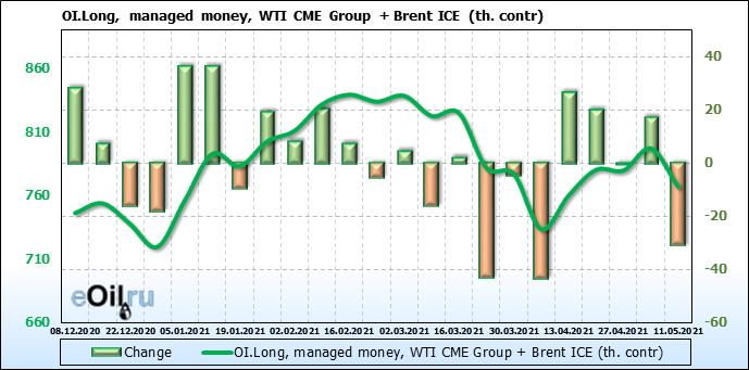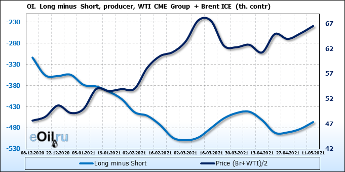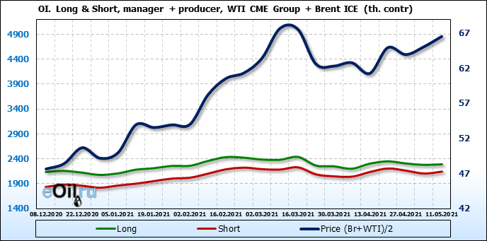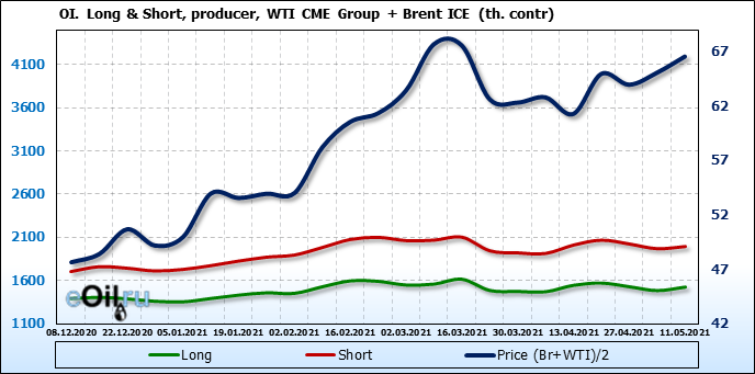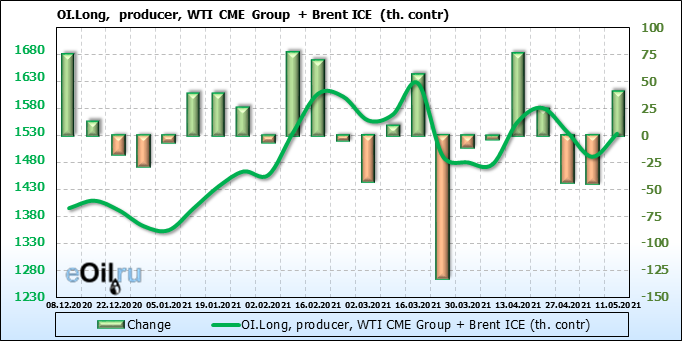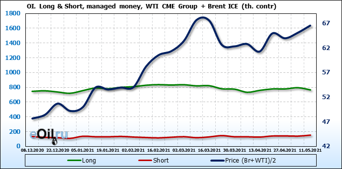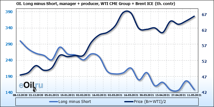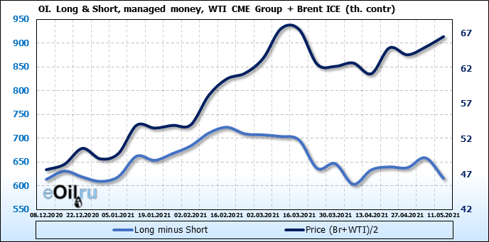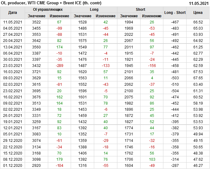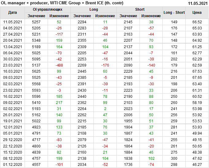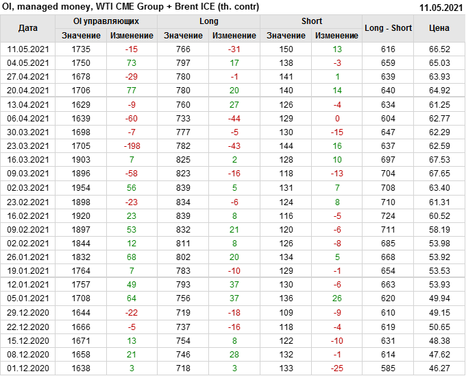 За прошлую неделю, 05.05.21 — 11.05.21, разница между длинными и короткими позициями управляющих упала на 43.3 тыс. контрактов. В тоже время, цена выросла на 1.49 доллара. Управляющие не горят желанием покупать, что заставляет нас рассуждать о потери доверия к тенденции со стороны быков — спекулянтов. Рынок становится более тонким. Без прихода свежих объемов, толкать цену вверх скоро будет некому.