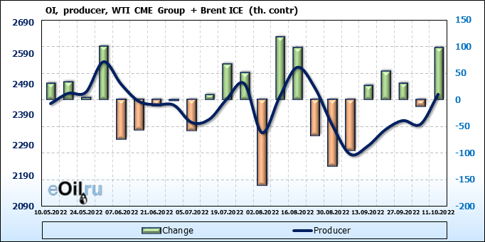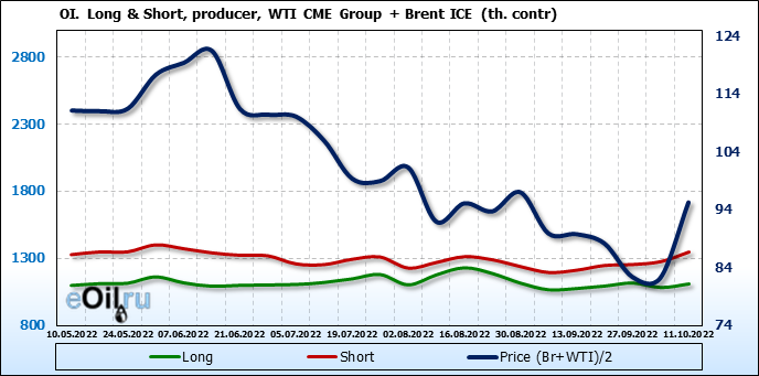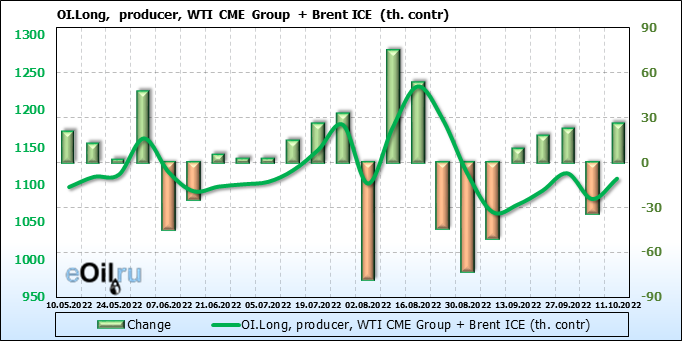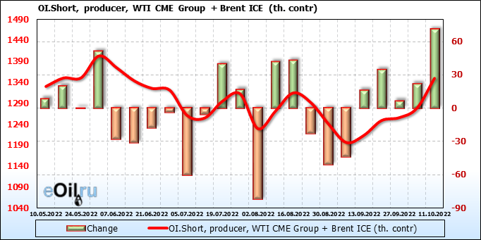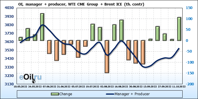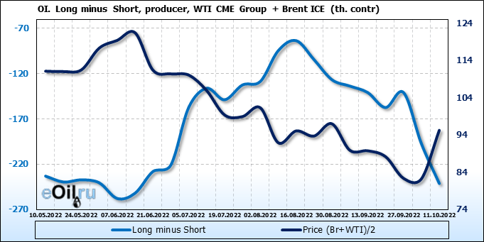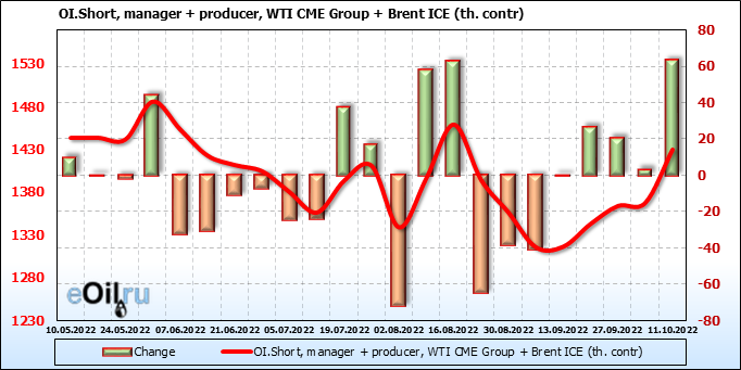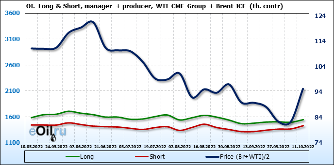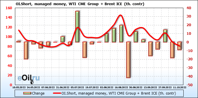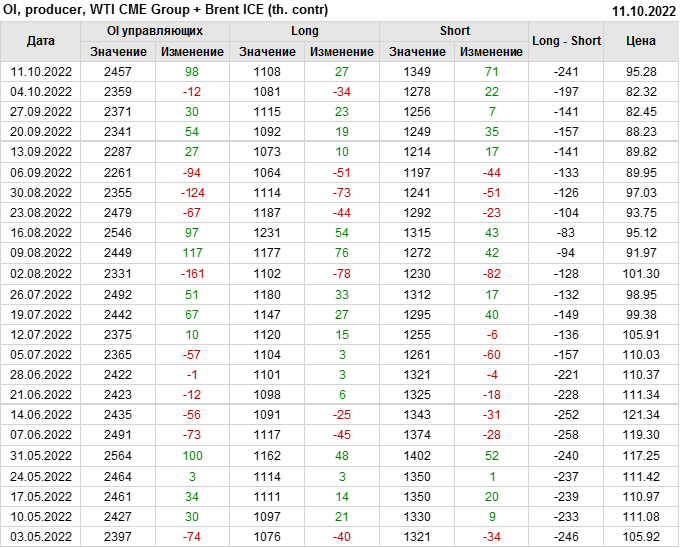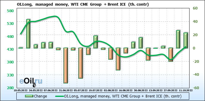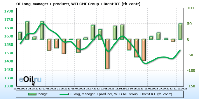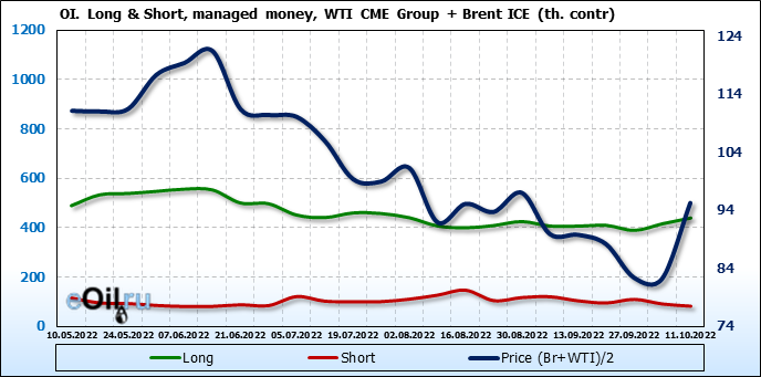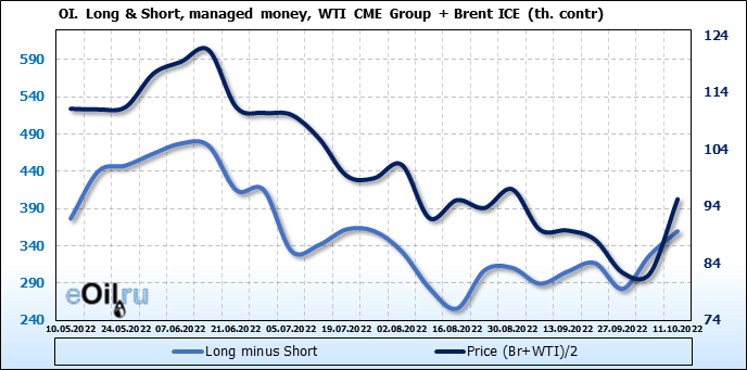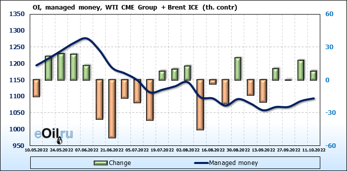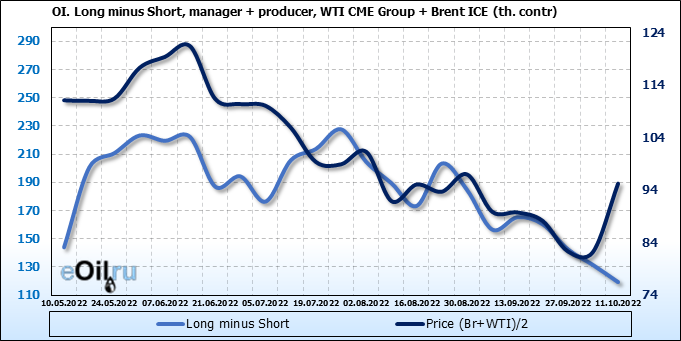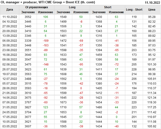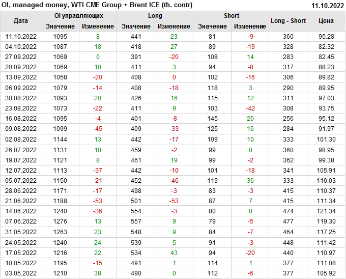 За прошедшую неделю, 05.10.22 — 11.10.22, разница между длинными и короткими позициями управляющих увеличилась на 31.7 тыс. контрактов. В тоже время, цена выросла на 12.96 доллара.
