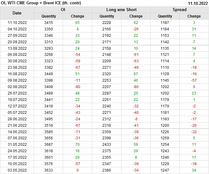 За прошлую неделю, 05.10.22 — 11.10.22, открытый интерес вырос на 65 тыс. контрактов. Объем вовлеченных в торговлю контрактов составляет 3 415 249 штук. Текущее положение дел на рынке таково, что деньги в течение прошлой недели приходили на рынок поддерживая тенденцию.
