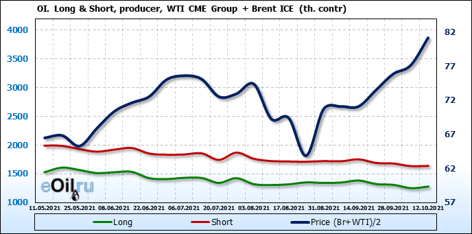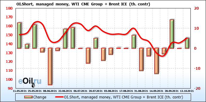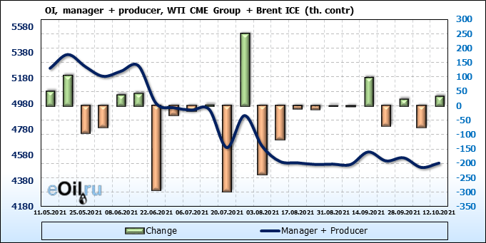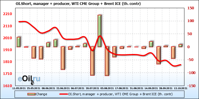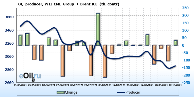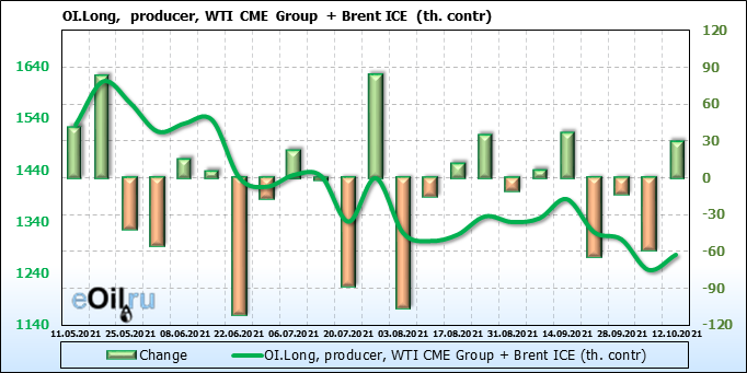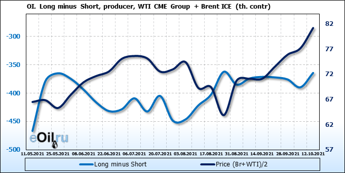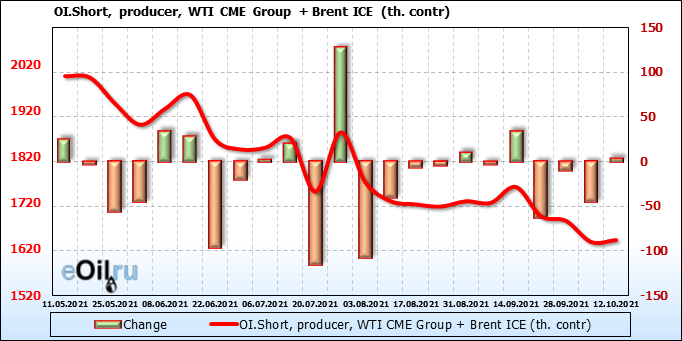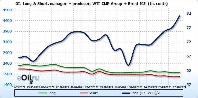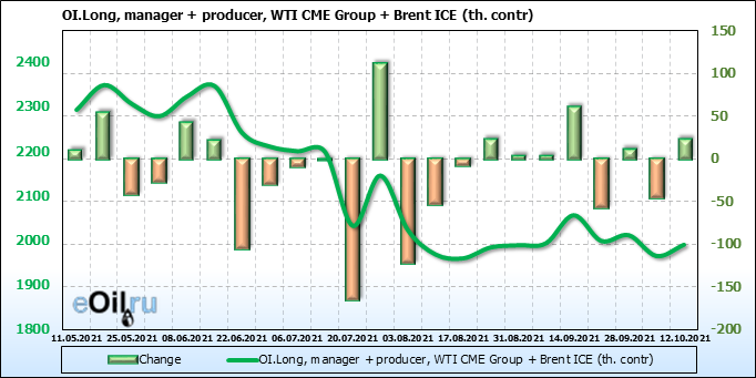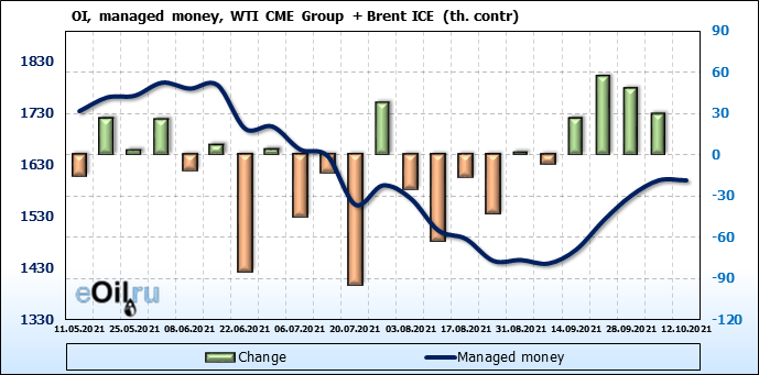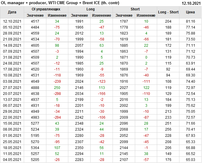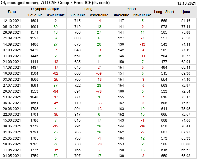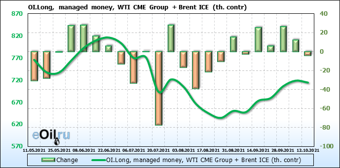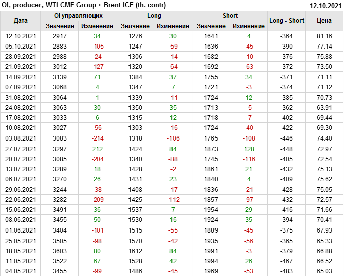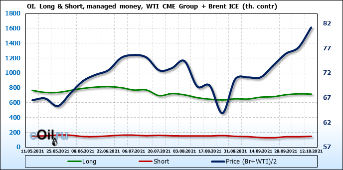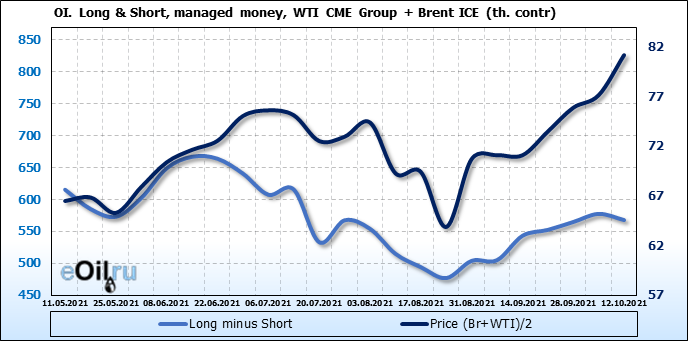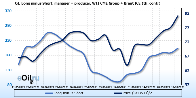 За прошлую неделю, 06.10.21 — 12.10.21, разница между длинными и короткими позициями управляющих сократилась на 9.7 тыс. контрактов. В тоже время, цена выросла на 4.02 доллара.