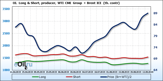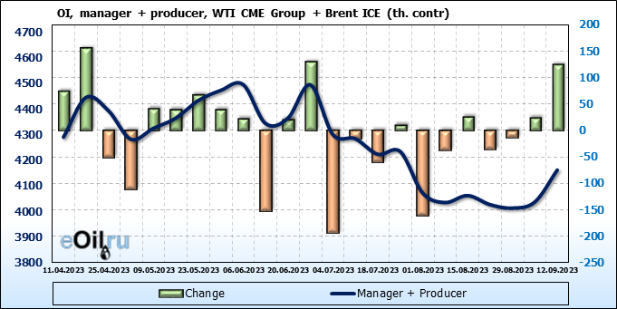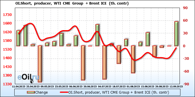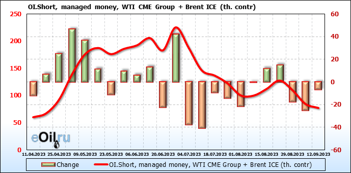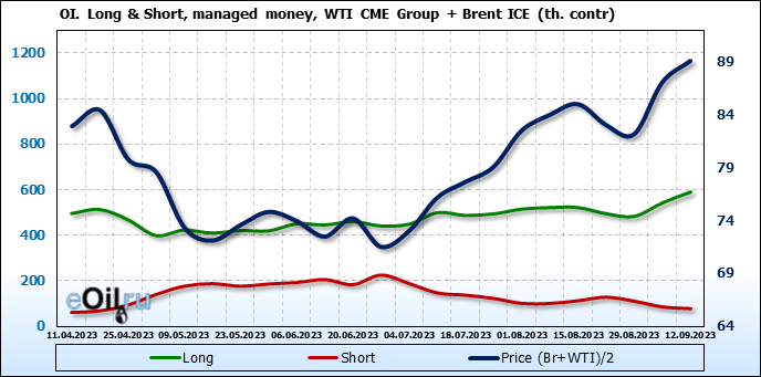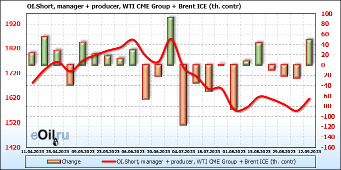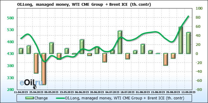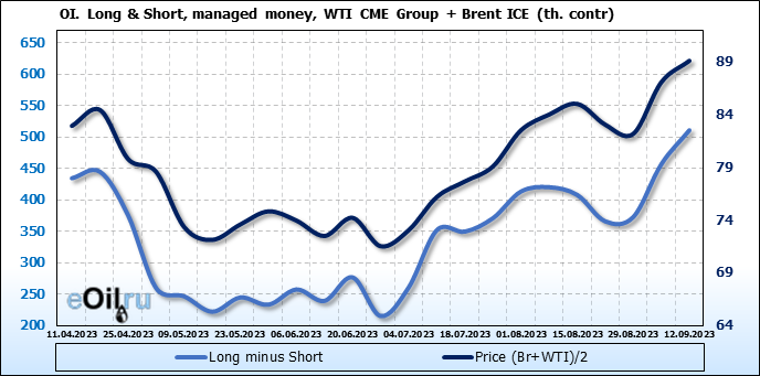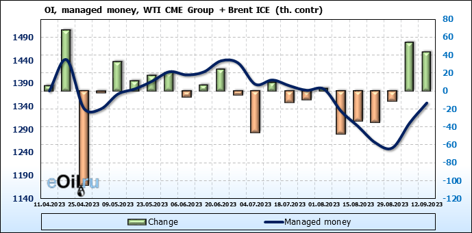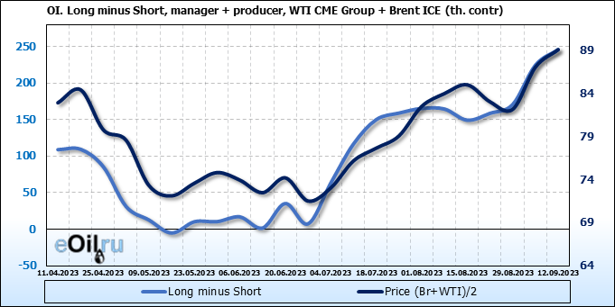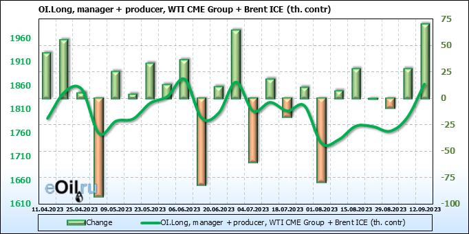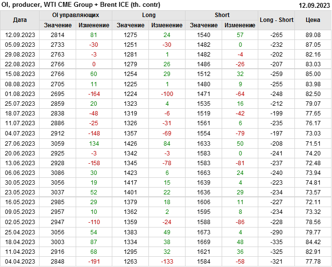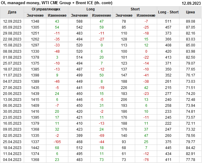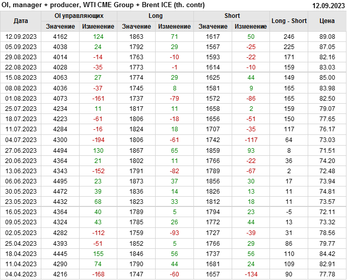 За прошедшую неделю, 06.09.23 — 12.09.23, разница между длинными и короткими позициями управляющих увеличилась на 53.9 тыс. контрактов. В тоже время, цена выросла на 2.03 доллара.