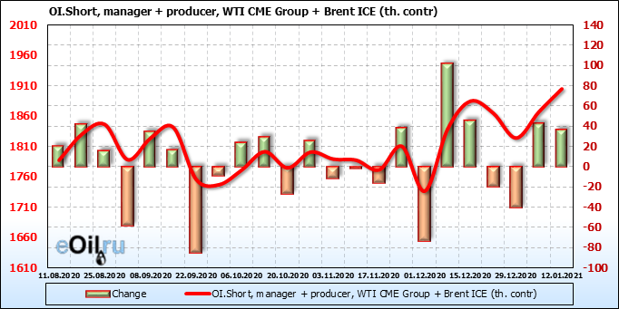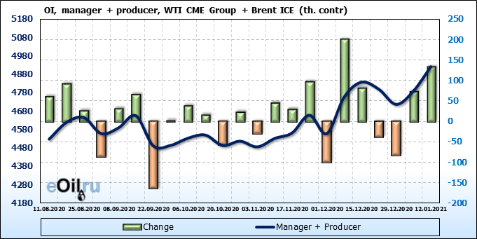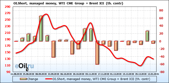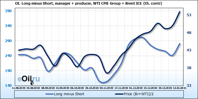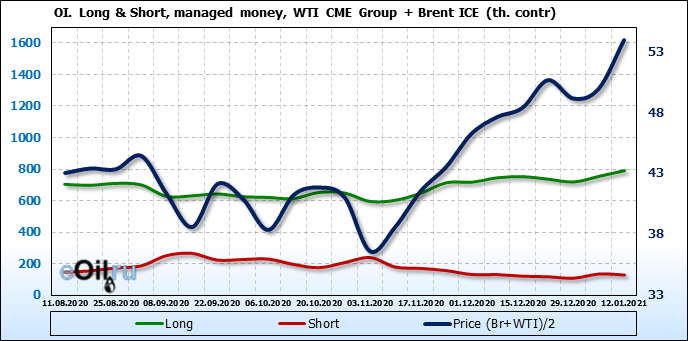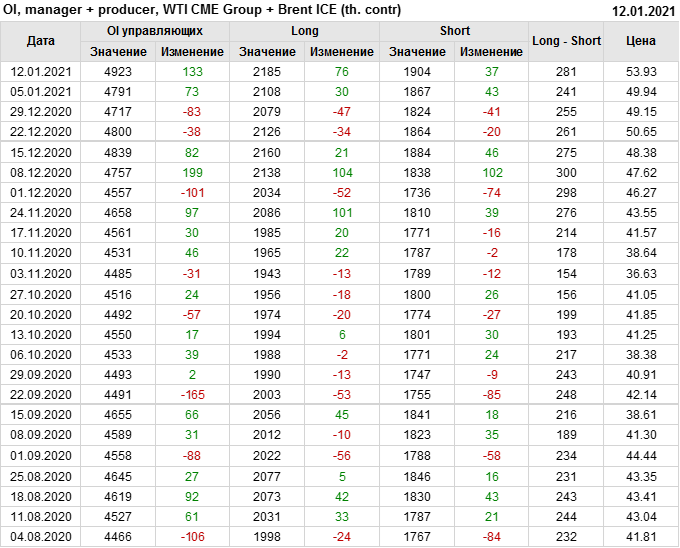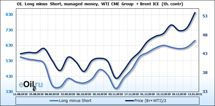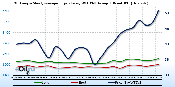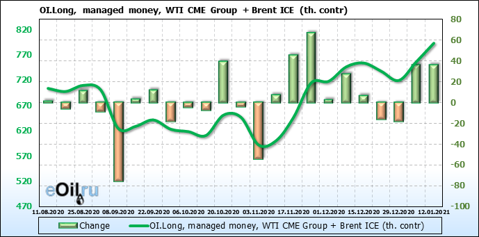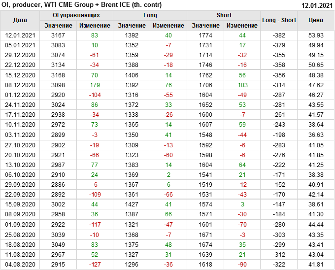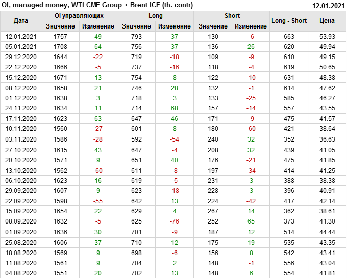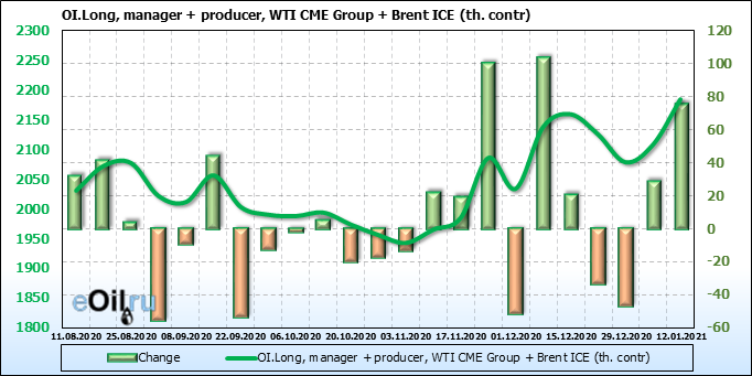 За прошлую неделю, 06.01.21 — 12.01.21, разница между длинными и короткими позициями управляющих выросла на 43 тыс. контрактов. В тоже время, цена выросла на 3.99 доллара. Управляющие наращивают позиции, разгоняя тем самым рост цен, что говорит нам о текущей силе рынка.