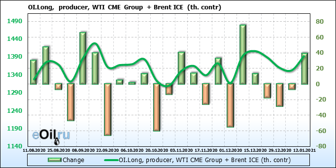 За прошлую неделю, 06.01.21 — 12.01.21, разница между длинными и короткими позициями производителей упала на 4 тыс. контрактов. В тоже время, цена выросла на 3.99 доллара. Производители увеличивают продажи, предполагая, что текущие уровни являются привлекательными для них. И не смотря на это, рынок продолжает расти, что показывает силу текущего тренда.