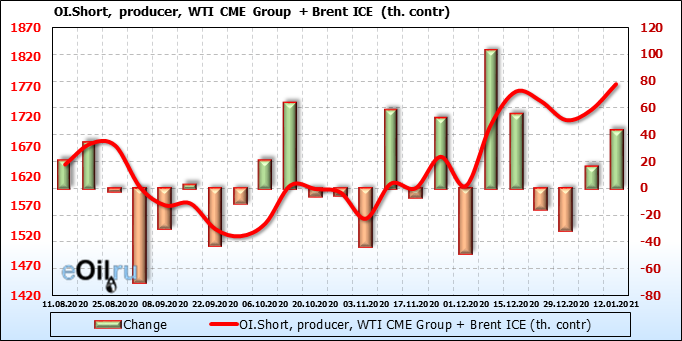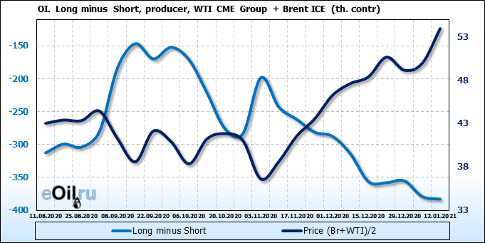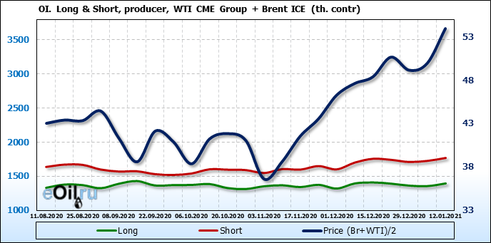 За прошлую неделю, 06.01.21 — 12.01.21, разница между длинными и короткими позициями производителей и управляющих выросла на 39 тыс. контрактов. За отчетный период времени, цена выросла на 3.99 доллара. Совокупно производители и управляющие наращивают длинные позиции, поддерживая рост цен. Это сильная комбинация, которая должна вызывать доверие у всё большего числа быков.
