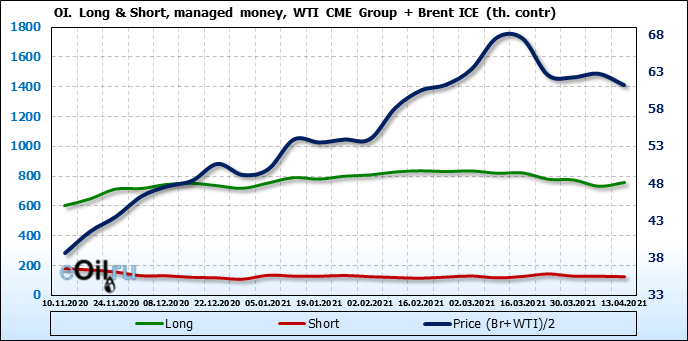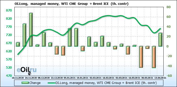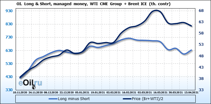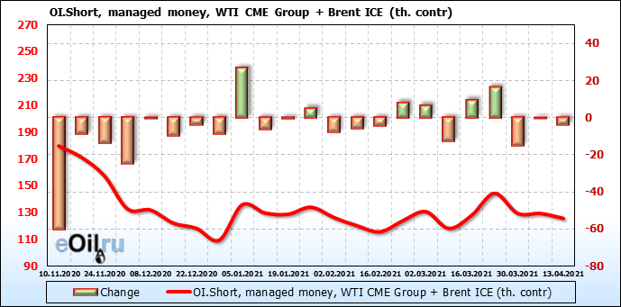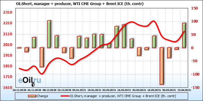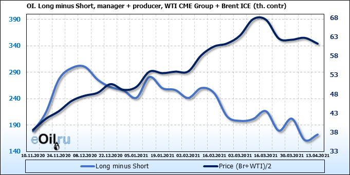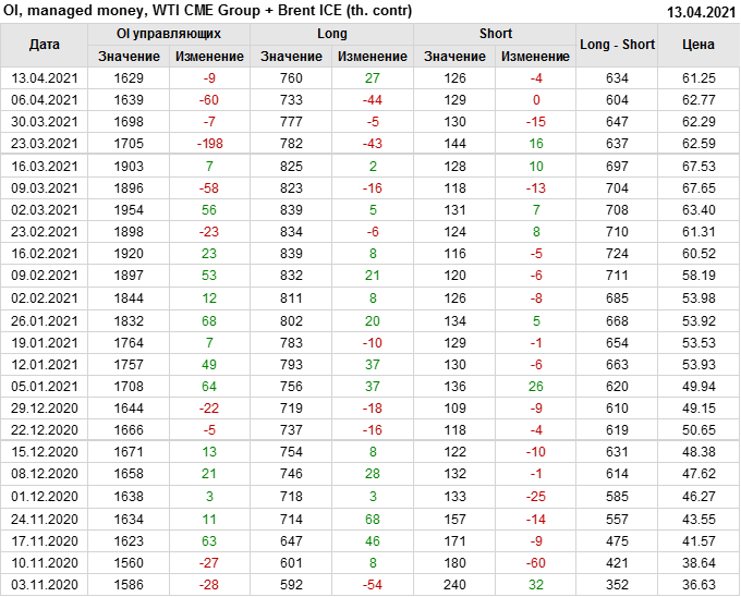 За прошлую неделю, 07.04.21 — 13.04.21, разница между длинными и короткими позициями управляющих выросла на 30 тыс. контрактов. В тоже время, цена упала на 1.52 доллара. Управляющие наращивают длинные позиции, что отражает их видение возможностей роста цены в ближайшее время, и это несмотря на то, что цены на отчетной неделе падали. Если давление со стороны покупателей будет продолжено, рынок развернется вверх.