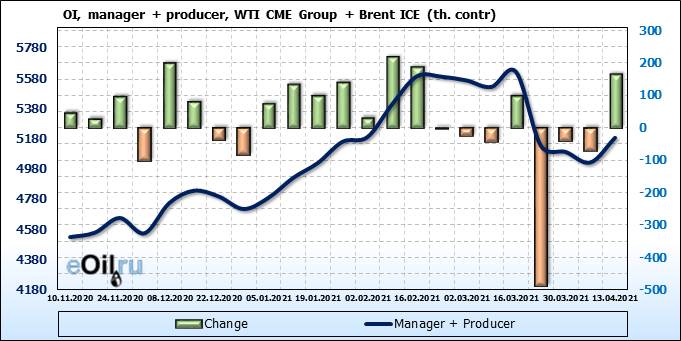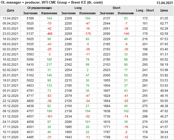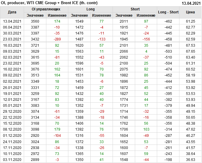 За прошлую неделю, 07.04.21 — 13.04.21, разница между длинными и короткими позициями производителей и управляющих выросла на 11 тыс. контрактов. За отчетный период времени, цена упала на 1.52 доллара. Производители и управляющие в своей совокупности смотрели вверх, не смотря на то, что цена продолжала снижаться. Подобный дисбаланс должен привести к стабилизации и развороту цен вверх в скором времени.