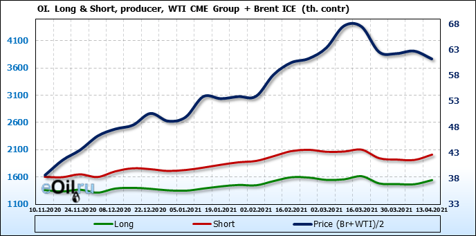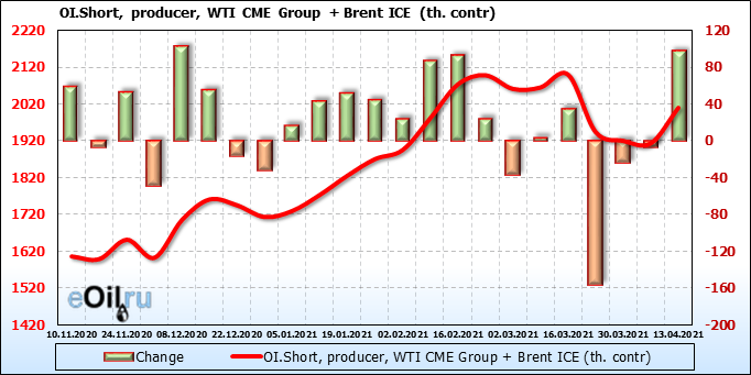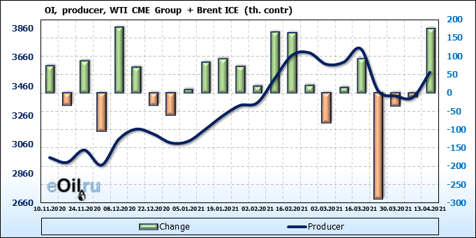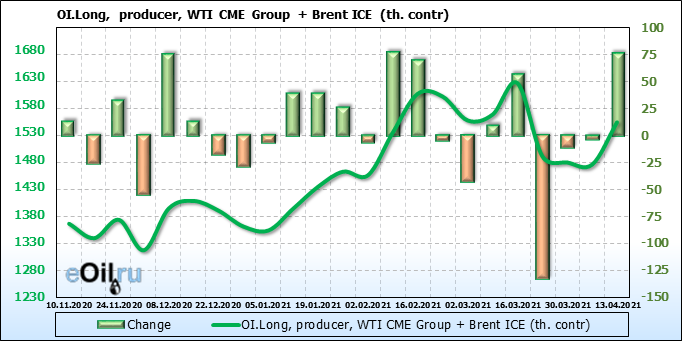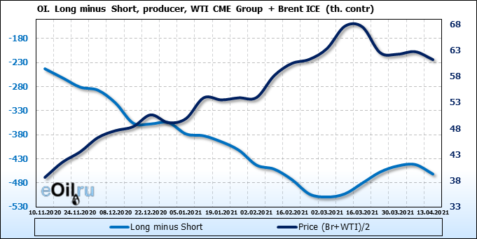 За прошлую неделю, 07.04.21 — 13.04.21, разница между длинными и короткими позициями производителей выросла на 20 тыс. контрактов. В тоже время, цена упала на 1.52 доллара. Производители наращивают короткие позиции, что не дает цене расти. В такой ситуации на рынке возможно ускорение падения цен.