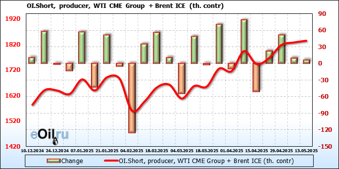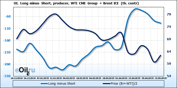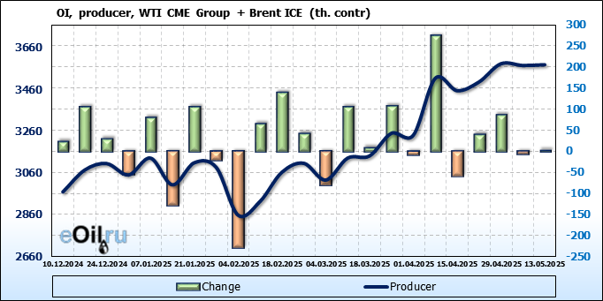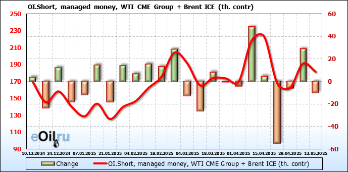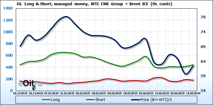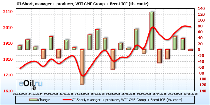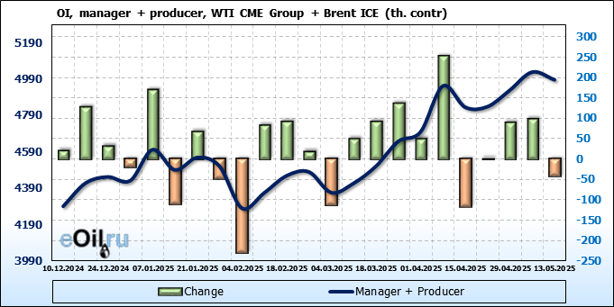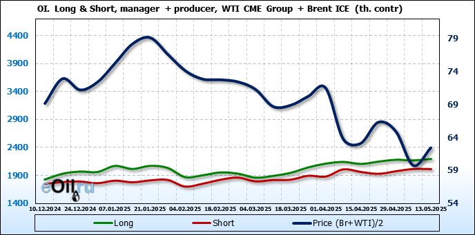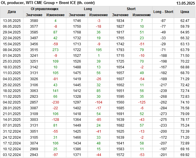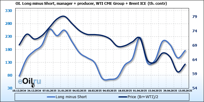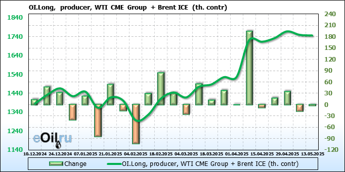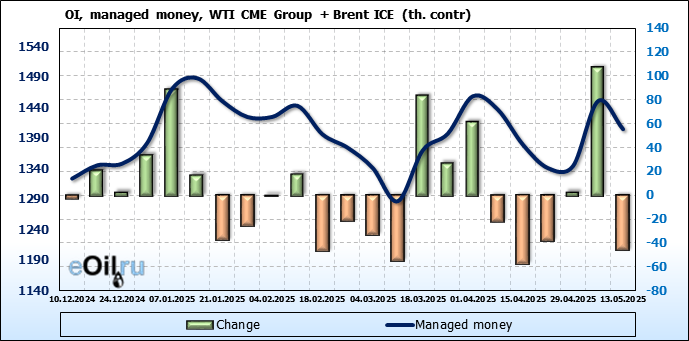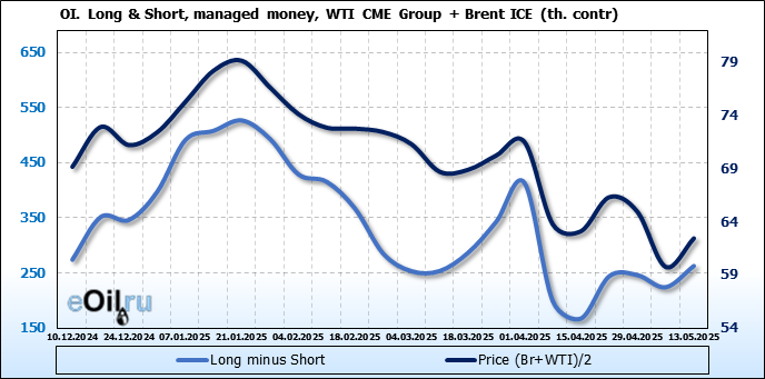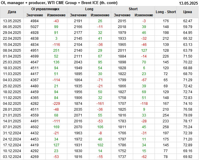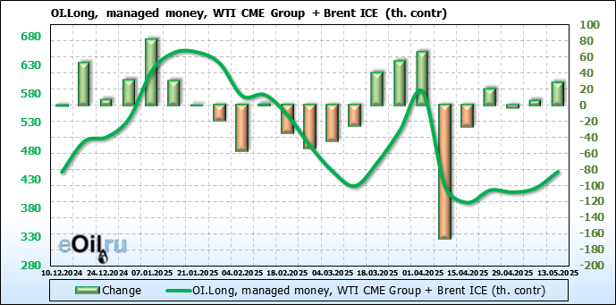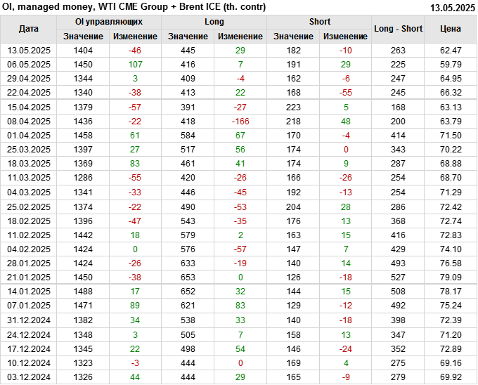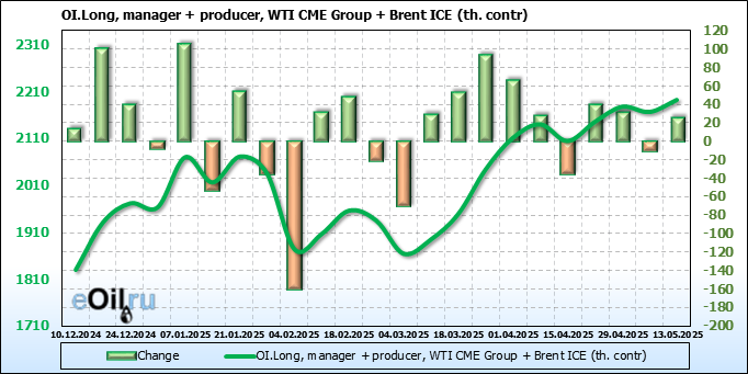 За прошедшую неделю, 07.05.25 — 13.05.25, разница между длинными и короткими позициями управляющих увеличилась на 38.7 тыс. контрактов. В тоже время, цена выросла на 2.68 доллара.