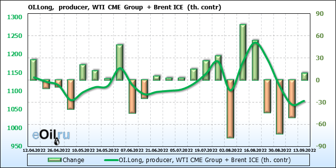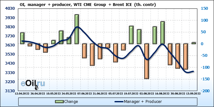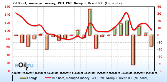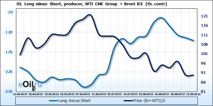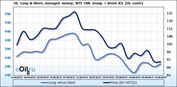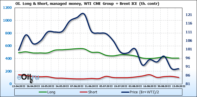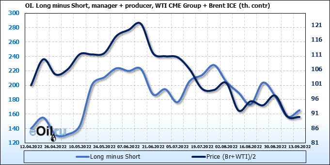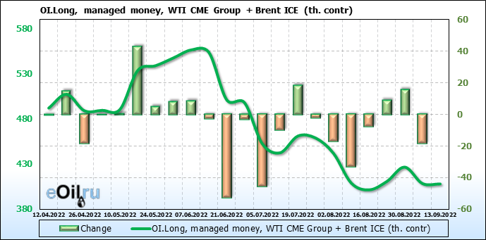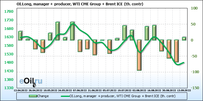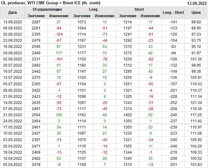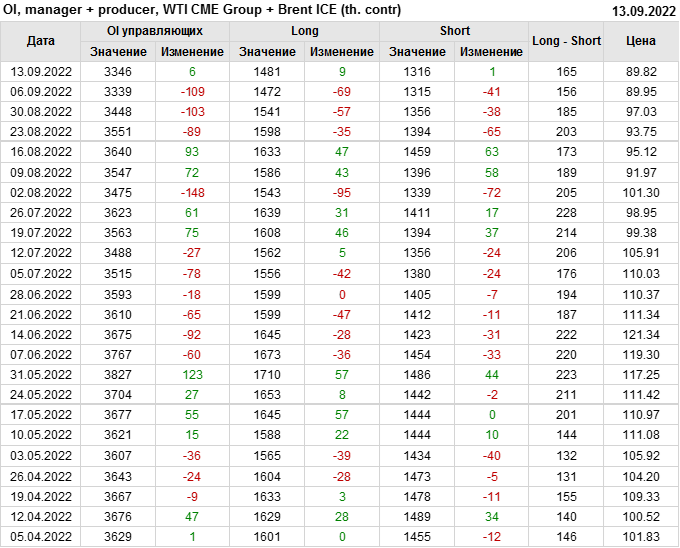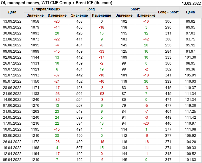 За прошедшую неделю, 07.09.22 — 13.09.22, разница между длинными и короткими позициями управляющих увеличилась на 15.9 тыс. контрактов. В тоже время, цена упала на 0.13 доллара.
