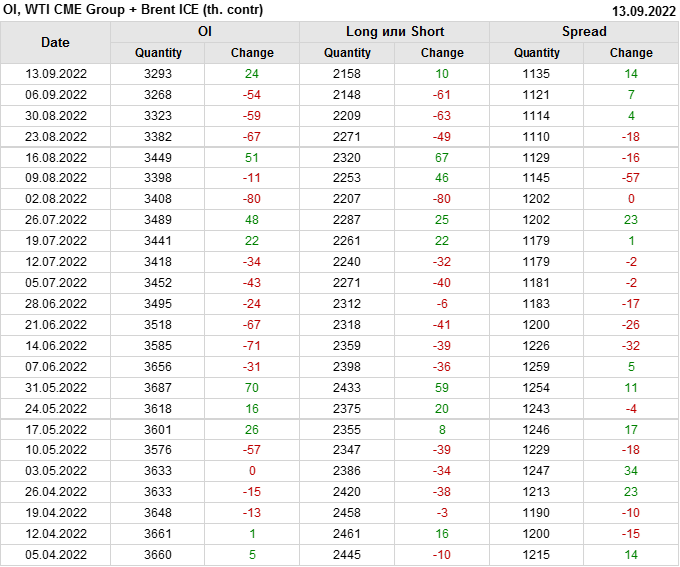 За прошлую неделю, 07.09.22 — 13.09.22, открытый интерес вырос на 24 тыс. контрактов. Объем вовлеченных в торговлю контрактов составляет 3 292 608 штук. Текущее положение дел на рынке таково, что деньги в течение прошлой недели приходили на рынок поддерживая тенденцию.