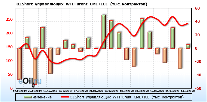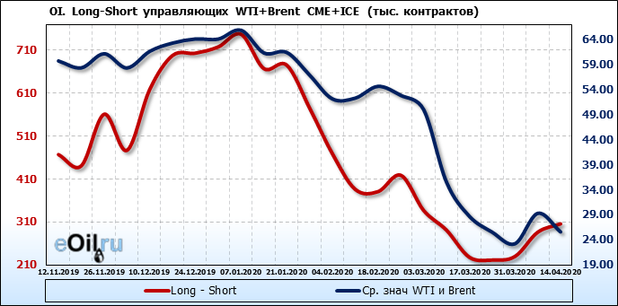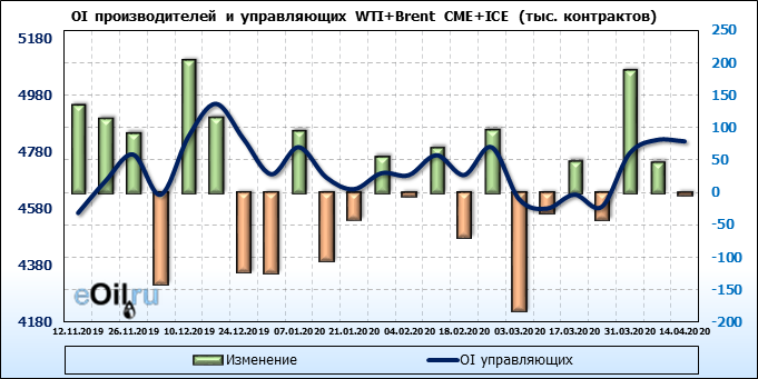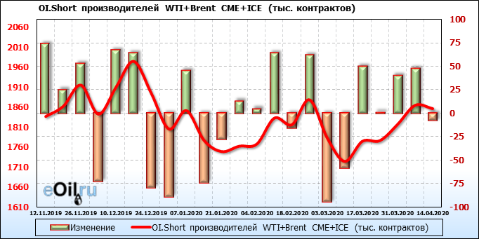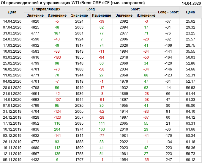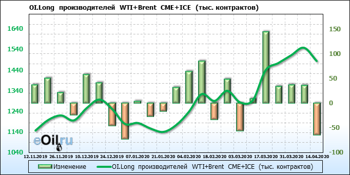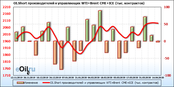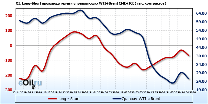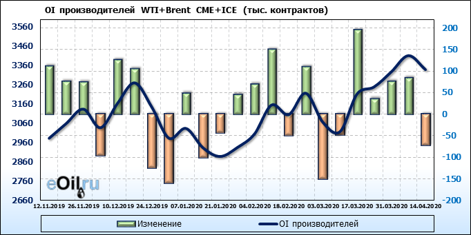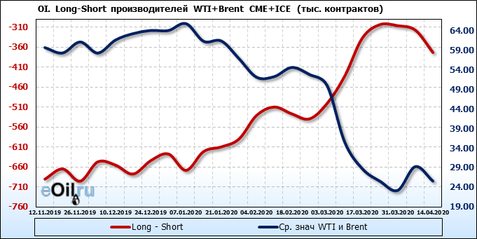 За прошлую неделю, 08.04.20 — 14.04.20, разница между длинными и короткими позициями производителей упала на 56 тыс. контрактов. В тоже время, цена упала на 3.7 доллара. Производители наращивают короткие позиции, что не дает цене расти. В такой ситуации на рынке возможно ускорение падения цен.