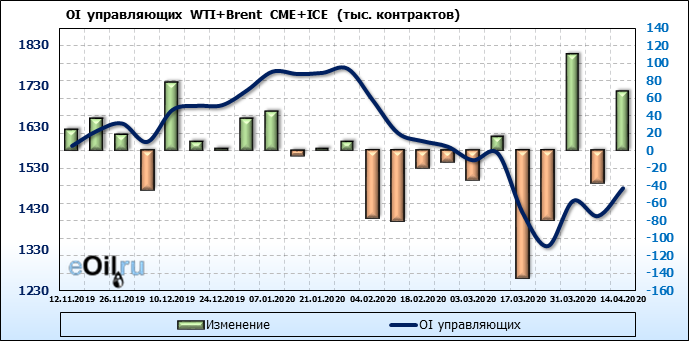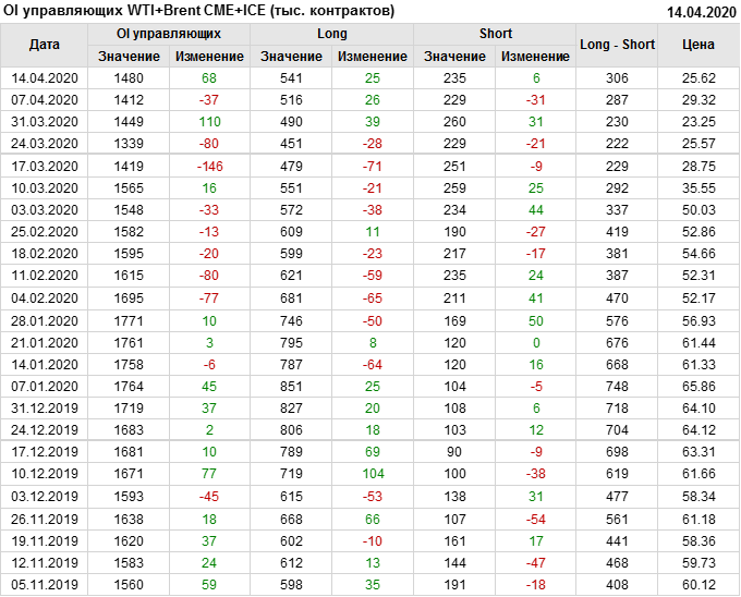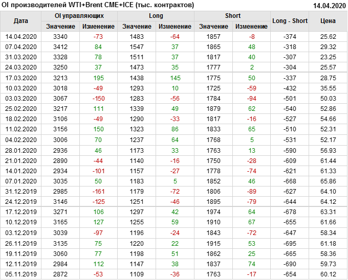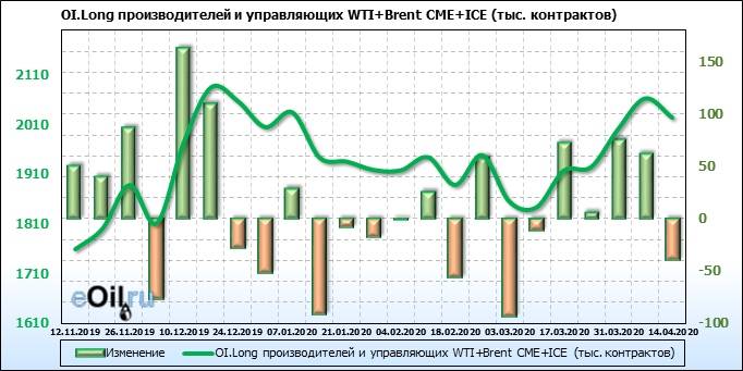 За прошлую неделю, 08.04.20 — 14.04.20, разница между длинными и короткими позициями производителей и управляющих упала на 36 тыс. контрактов. За отчетный период времени, цена упала на 3.7 доллара. Производители и управляющие на отчетной недели были склонны продавать. Суммарное число шортов было выше суммарного числа лонгов. Цены также снижаются, что создает привлекательные условия для продавцов в среднесрочной перспективе, одна — две недели.