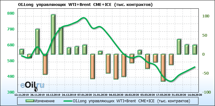 За прошлую неделю, 08.04.20 — 14.04.20, разница между длинными и короткими позициями управляющих выросла на 20 тыс. контрактов. В тоже время, цена упала на 3.7 доллара. Управляющие наращивают длинные позиции, что отражает их видение возможностей роста цены в ближайшее время, и это несмотря на то, что цены на отчетной неделе падали. Если давление со стороны покупателей будет продолжено, рынок развернется вверх.