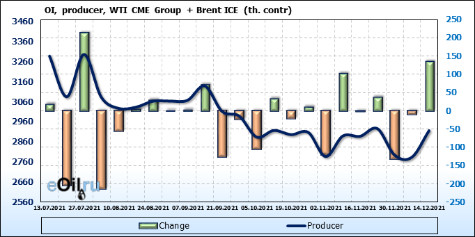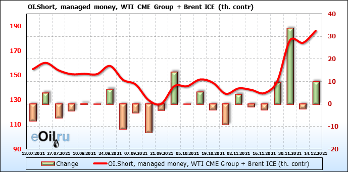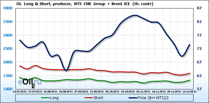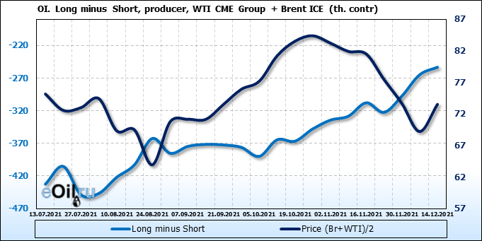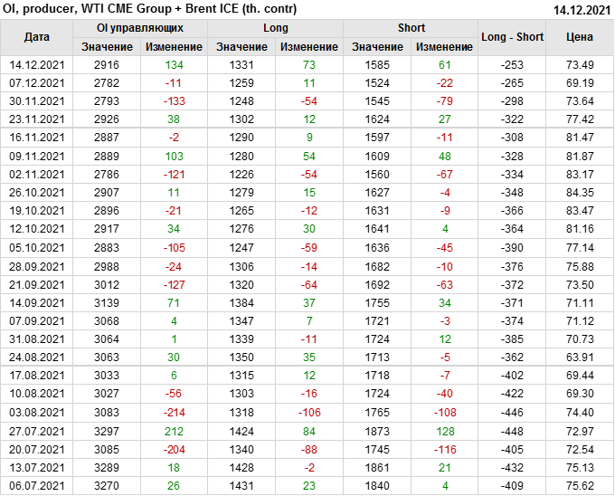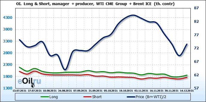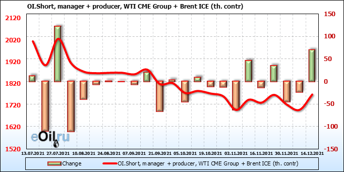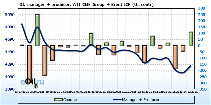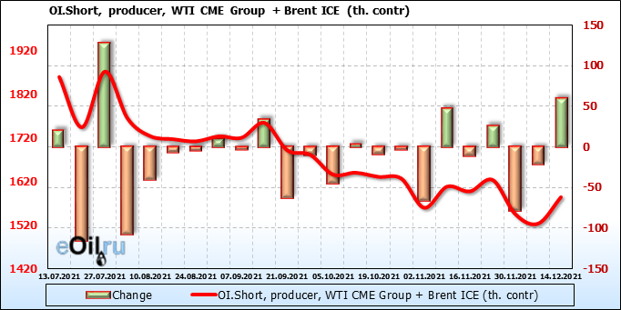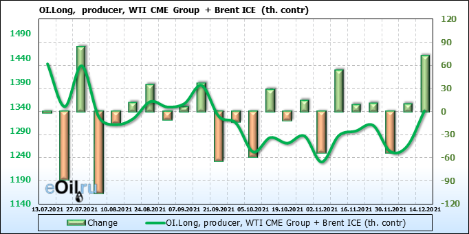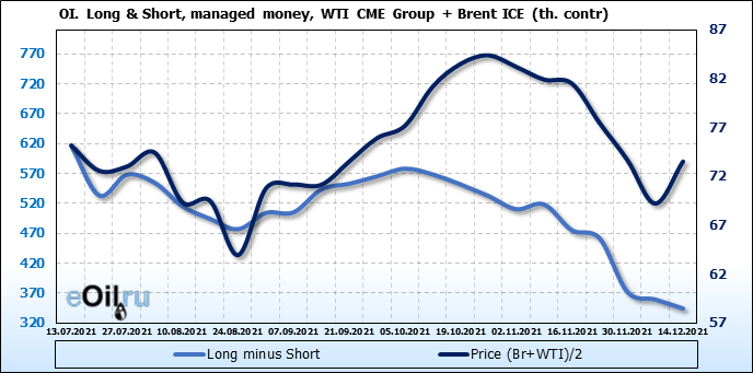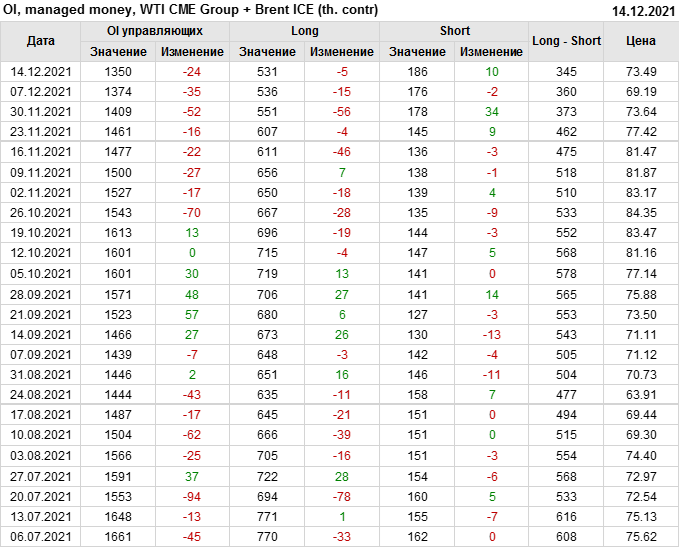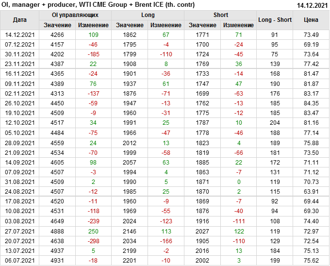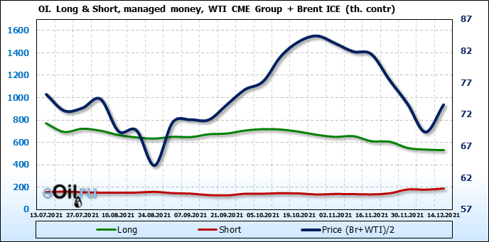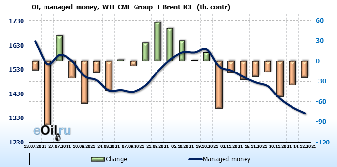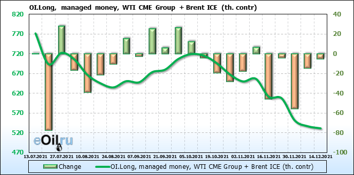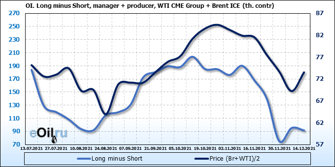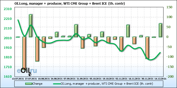 За прошедшую неделю, 08.12.21 — 14.12.21, разница между длинными и короткими позициями управляющих сократилась на 15.2 тыс. контрактов. В тоже время, цена выросла на 4.3 доллара.
