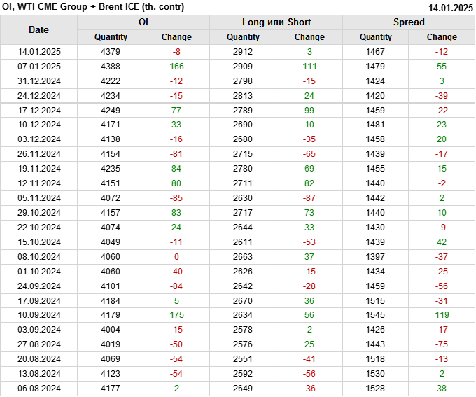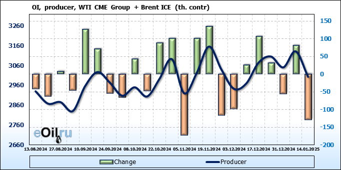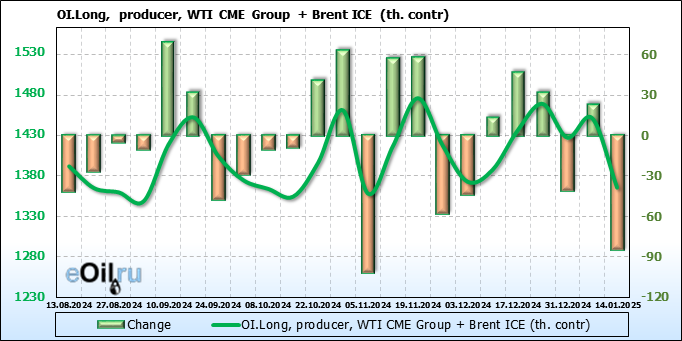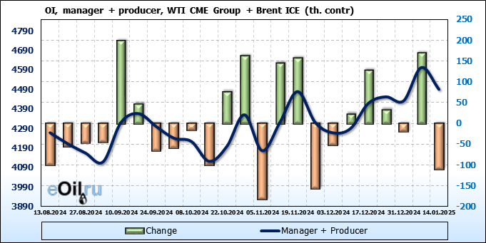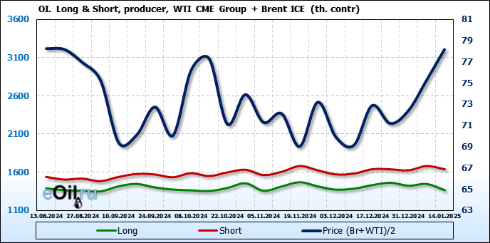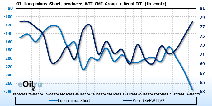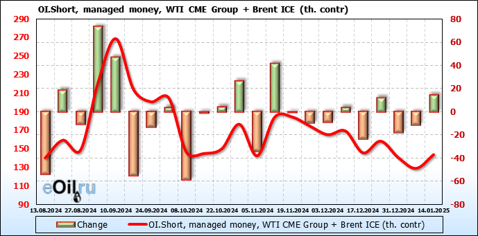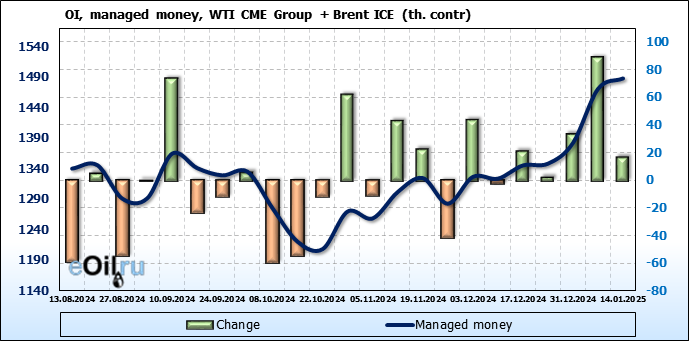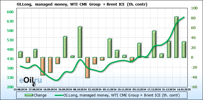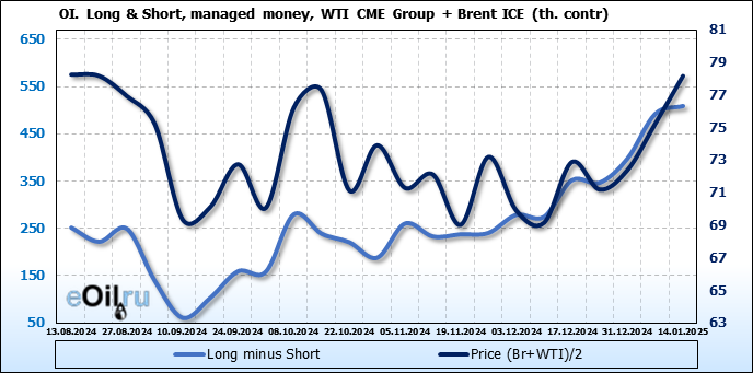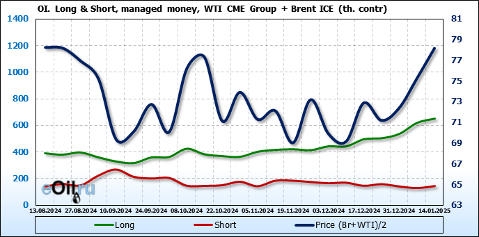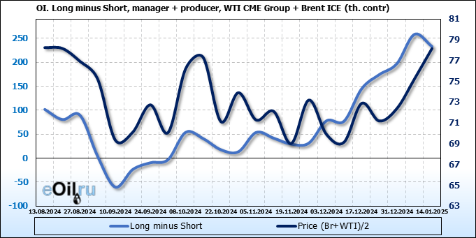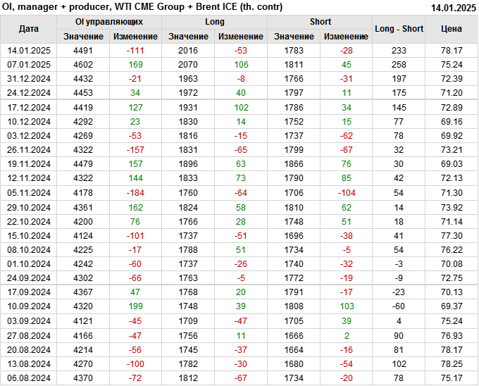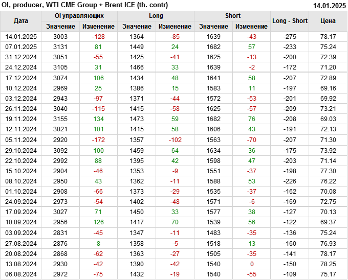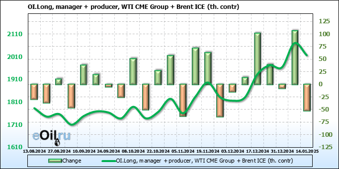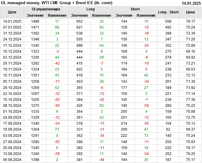 За прошедшую неделю, 08.01.25 — 14.01.25, разница между длинными и короткими позициями управляющих увеличилась на 16.7 тыс. контрактов. В тоже время, цена выросла на 2.93 доллара.