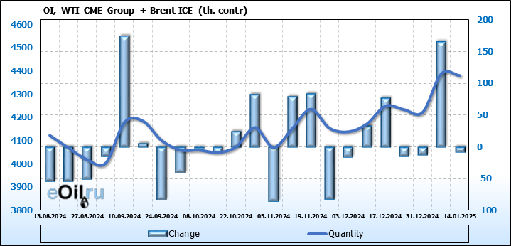 За прошлую неделю, 08.01.25 — 14.01.25, открытый интерес упал на 8 тыс. контрактов. Объем вовлеченных в торговлю контрактов составляет 4 379 466 штук. Текущее положение дел на рынке таково, что деньги в течение прошлой недели уходили с рынка не видя привлекательности в текущей ситуации.