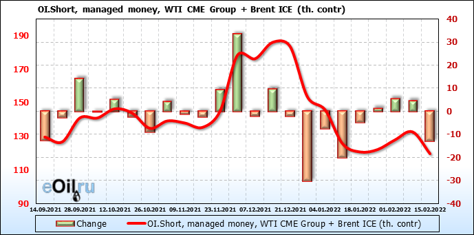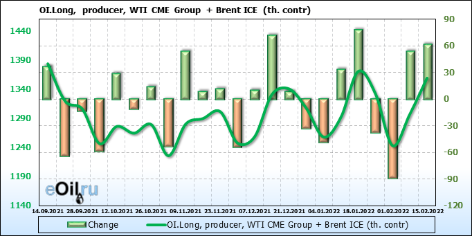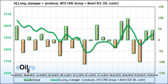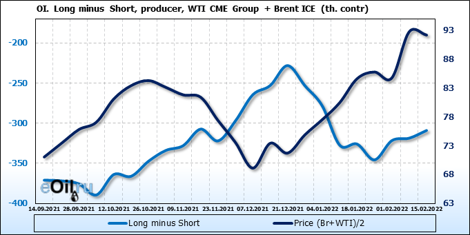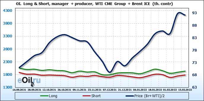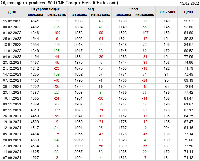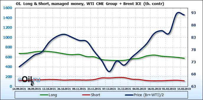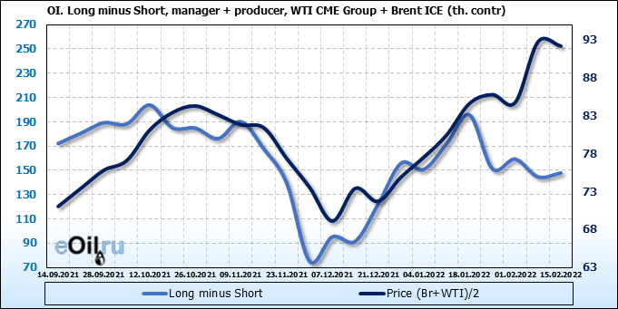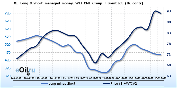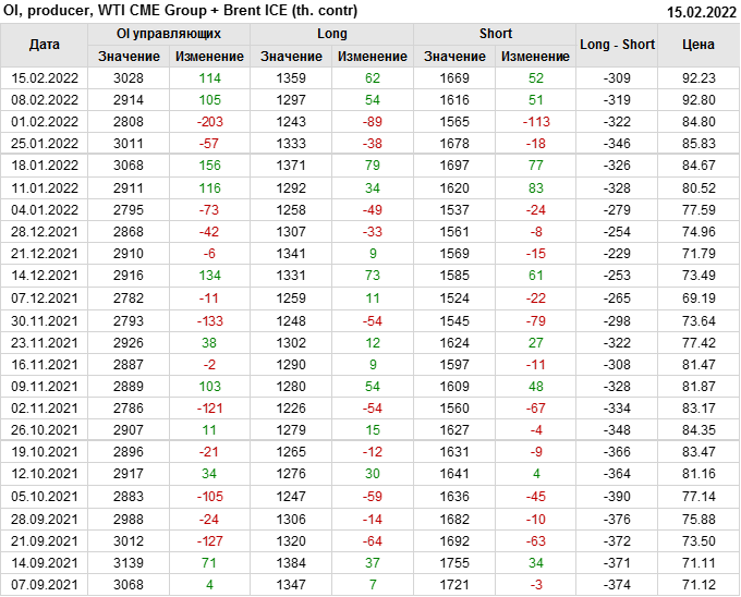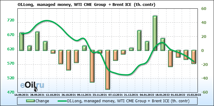 За прошедшую неделю, 09.02.22 — 15.02.22, разница между длинными и короткими позициями управляющих сократилась на 6.2 тыс. контрактов. В тоже время, цена упала на 0.57 доллара.