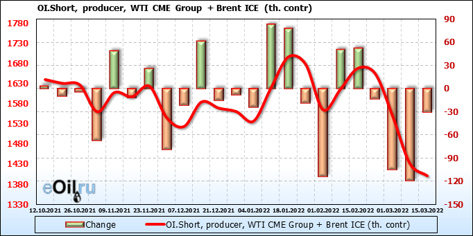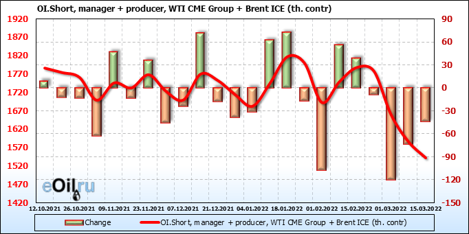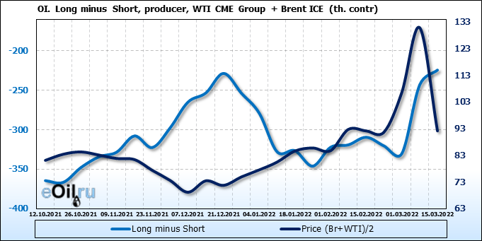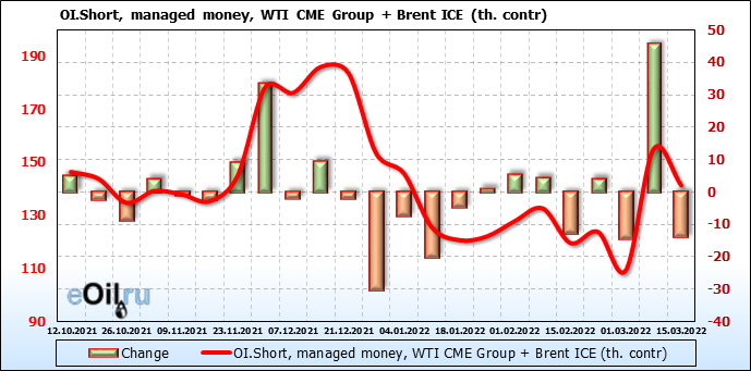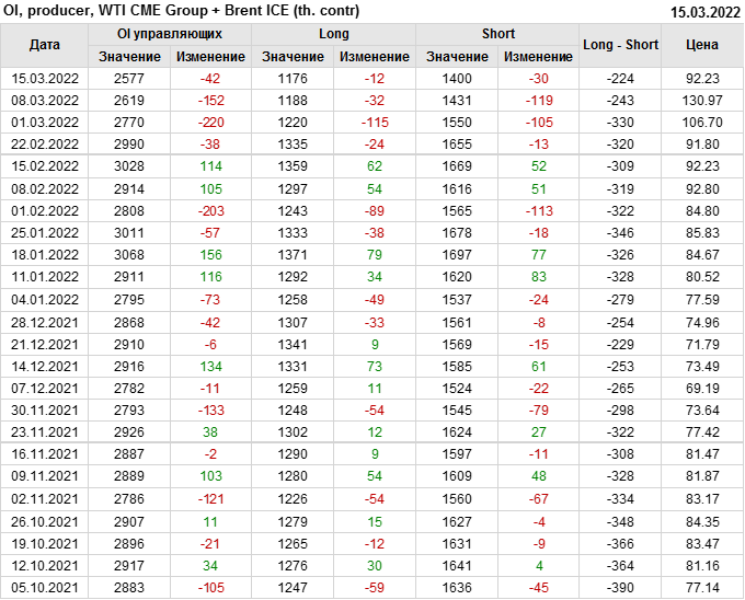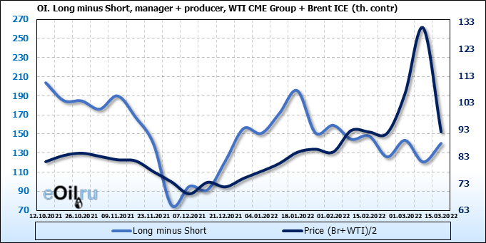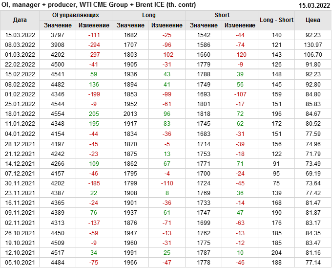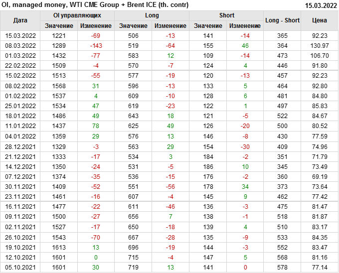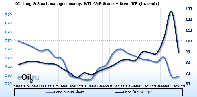 За прошедшую неделю, 09.03.22 — 15.03.22, разница между длинными и короткими позициями управляющих увеличилась на 0.8 тыс. контрактов. В тоже время, цена упала на 38.74 доллара.